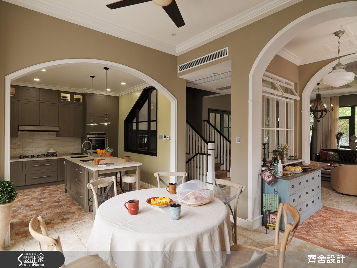位于中国湖南的397平方米的独栋楼,设计师于居宅中加入地道的美式风格。且在视觉美感之中,穿插实用的生活机能,让客厅、餐厅、卧房或任何角落,都能看见有如美剧般的经典画面,打造出令人心生向往的生活空间。【公共区互相串联,动线更流畅】走进客厅,可见沙发背墙与书柜做出结合,打造充满层次的视觉效果,并以挂画装饰墙面,搭配两盏照明壁灯,构成独特的光影画面;且舍弃制式电视墙,将屏幕设备隐于白色柜体之内,呈现简洁线条。两侧黑色折门则隐藏机能,把隐密的飘窗阅读区安置其内,形成专属的宁静角落。而居家中不乏圆弧的门斗,串联不同空间,让客厅、餐厅与厨房之间呈现互通穿梭的动线,陈述流畅的生活脉络。