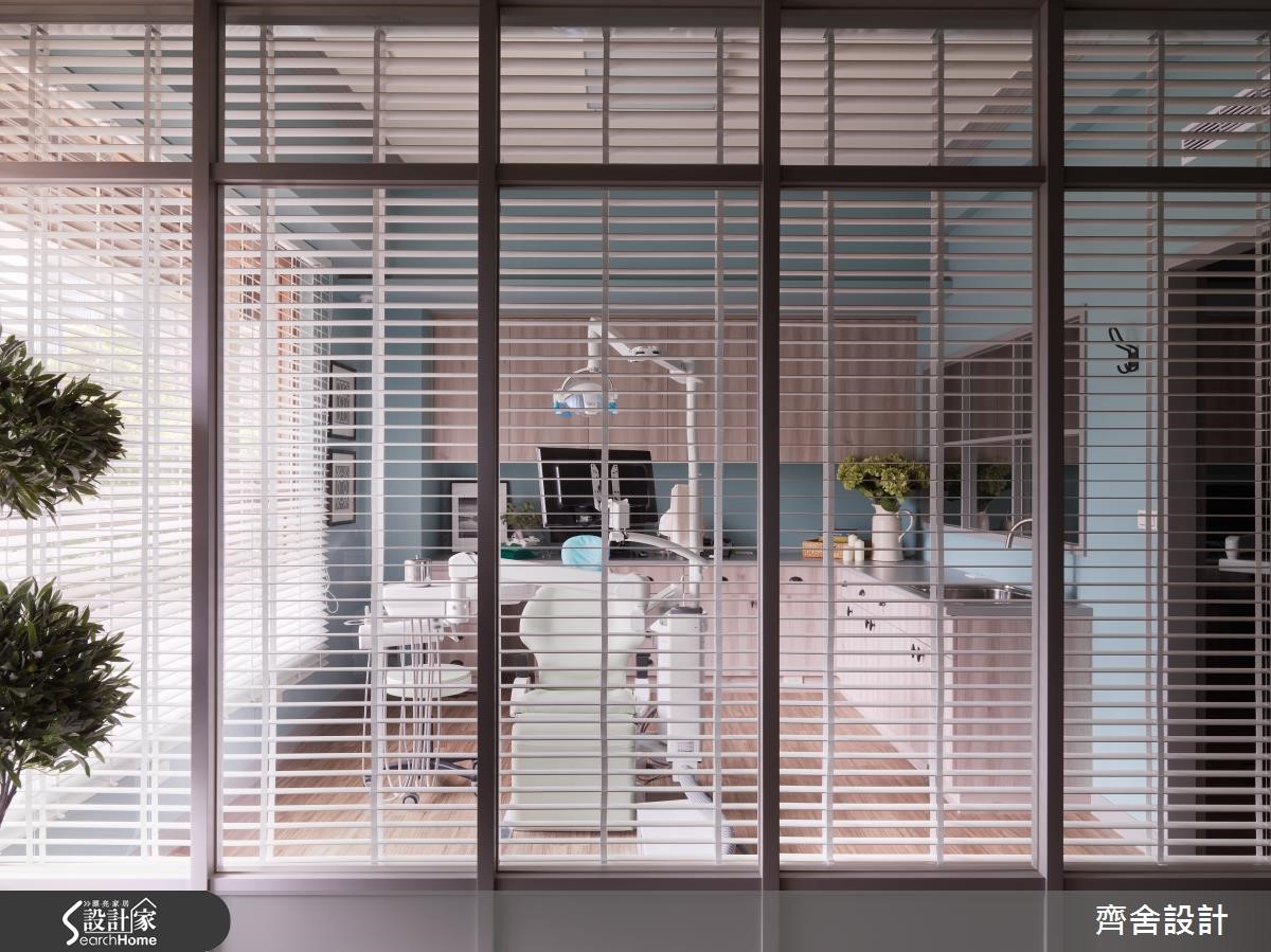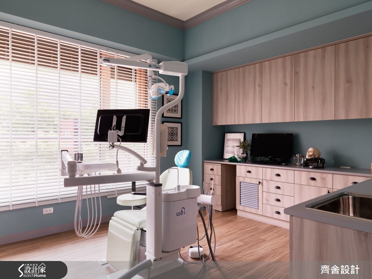 这间牙医诊所透过大面开窗,将清新明媚的阳光迎入278平方米的空间中,并加入拱型设计和圆滑弧形线条,柔和金属机具的冷硬感,温和舒适的美式家饰搭配。打破了一般人对于牙医诊所的刻板印象,巧妙纾解看诊时的紧张心情。【弧形设计,柔和空间氛围】进入诊所后,开阔而明亮的开放空间安排为挂号柜台及病人候诊区,弧形设计的柜台设置在视觉焦点处,凸显柜台服务人员的重要位置。圆滑弧线在方正格局结构下,仿佛一抹亲切微笑,再搭配散发出柔和光芒的圆形吊灯,让整体氛围显得更加温和舒适。一旁的候诊区摆上深色沙发及米白色抱枕,而医师的专业证照则以黑框裱起,如家庭生活照般排列在墙上,静静伫立在角落的落地灯点亮空间中的温馨氛围,营造出仿佛家一般舒适的候诊环境。