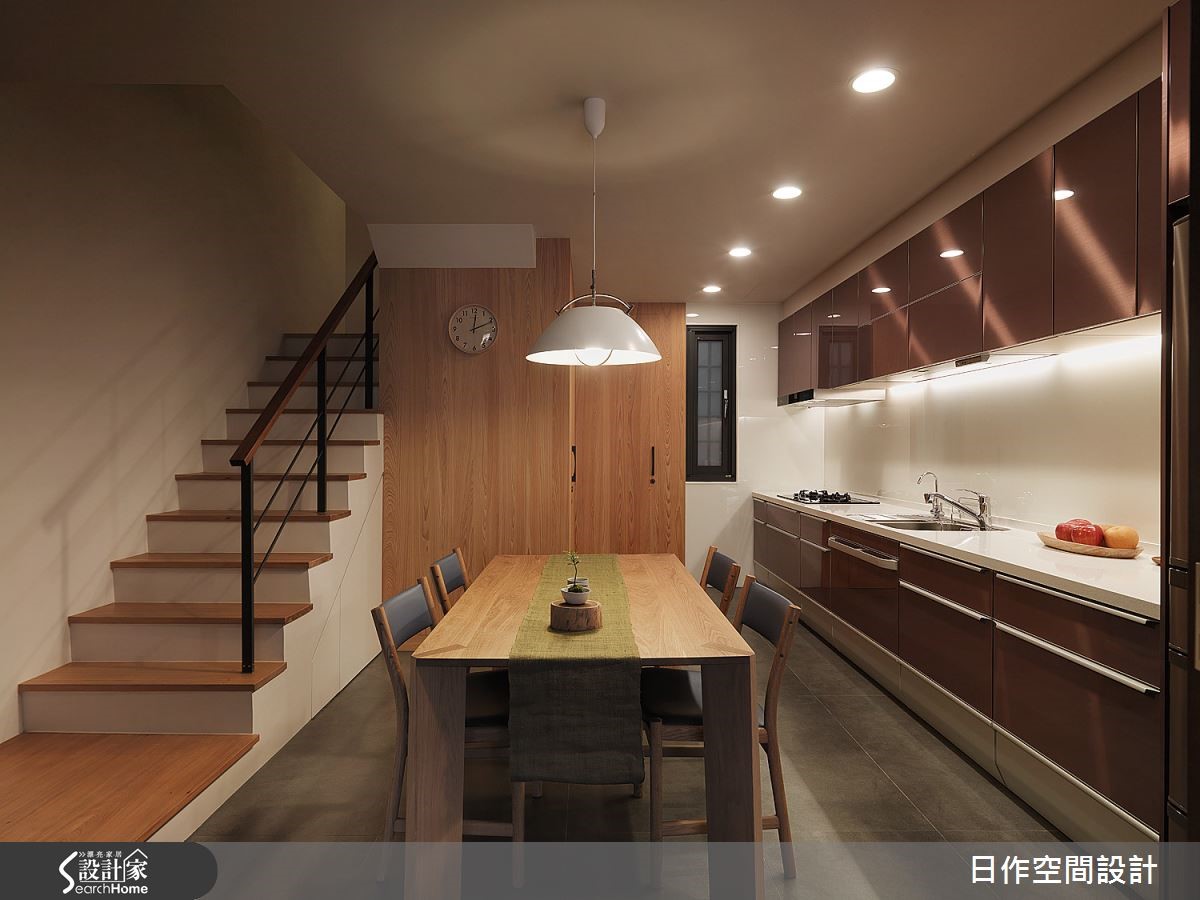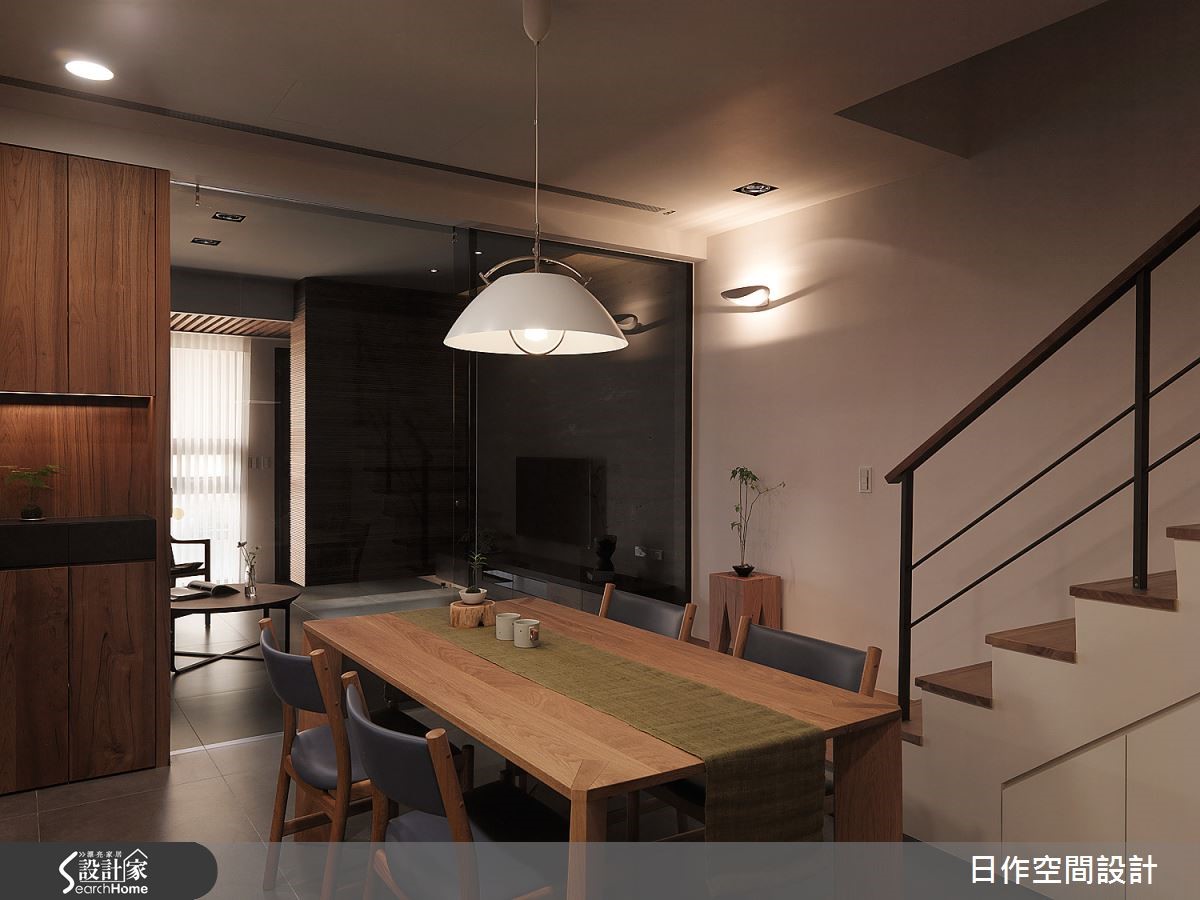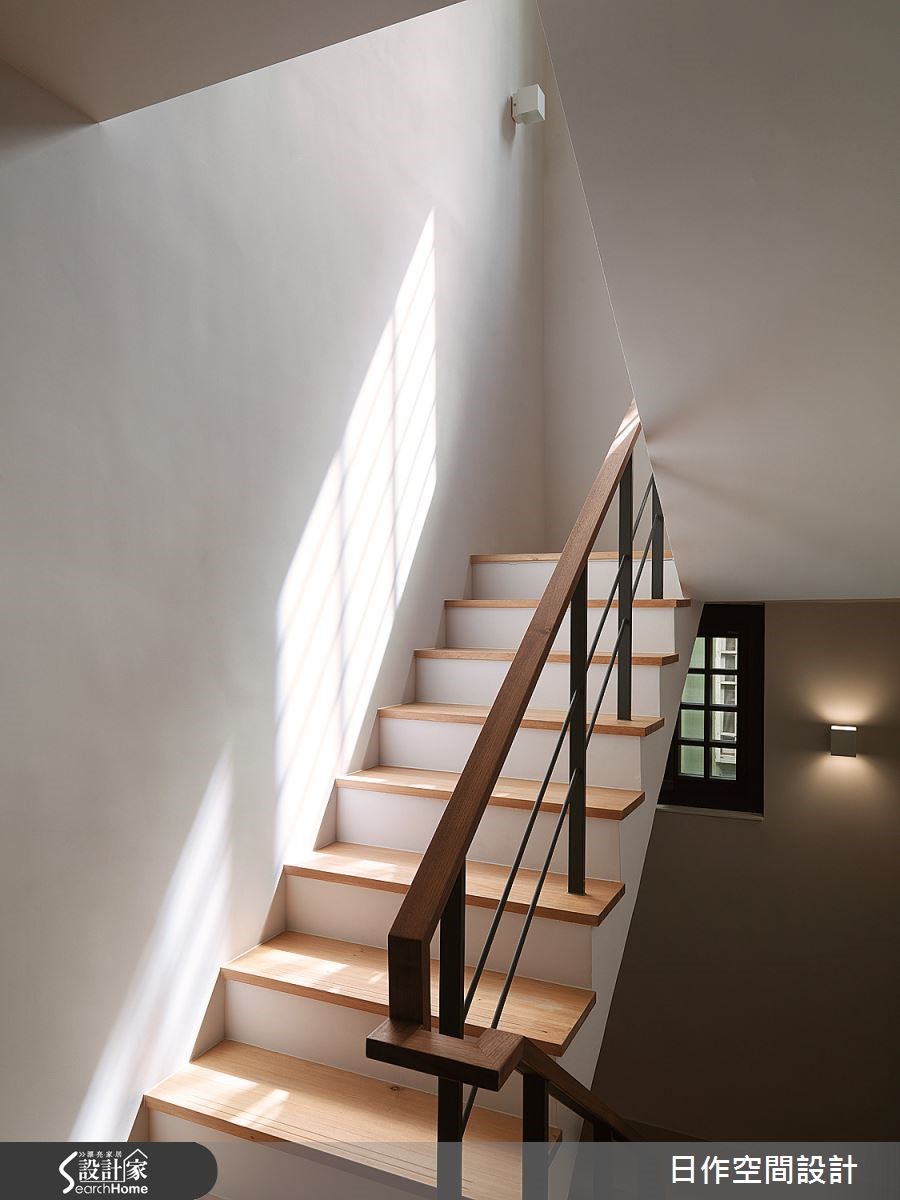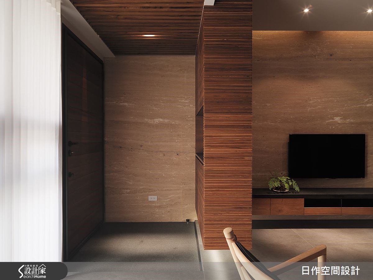 有着磨石子墙面与温润木造外观的独栋楼,宛如高级定制餐厅般的质感门面,在颇有年份的老屋住宅区中额外显得眼睛为之一亮。更采用大量引入窗光的方式,降低沉重感,让老屋活出生命力。【老屋微整型,光线引入温度感】细致木质悬柜化身玄关与客厅间的隔屏,与缜密的天花隔栅相互呼应,保有隐私却不显沉重局促。并利用拥有轻浅纹理的洞石由玄关延伸至电视墙,达成通透的视觉一致性,阳光经由镜面玻璃进入室内,洒落在柚木沙发主墙上,流动光影更使墙面充满生命力。 可随心收放的灰玻推拉门后即是餐厨区,为开放空间营造层次,大地色调的厨房与温雅轻浅的木作家具,和微醺灯光形成富有禅意的静谧搭配。后方大面积木皮包覆的收纳格柜,既美型又富机能,设计师更利用阶梯下方空间打造收纳空间,巧思与贴心兼具。阳光自窗户洒落,纯白色调与轻浅木质,为楼梯转角更添温暖与惬意。无论是公共空间的运用或是居室的布置,皆通用且百变,富有沉静和煦气息的主卧以木皮作为全室基调,散发舒适好眠的氛围。