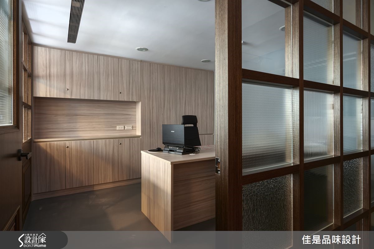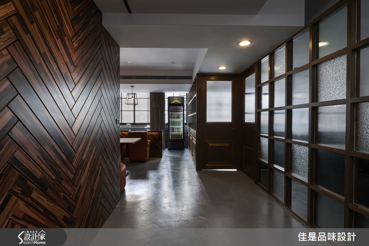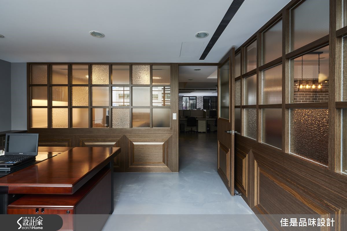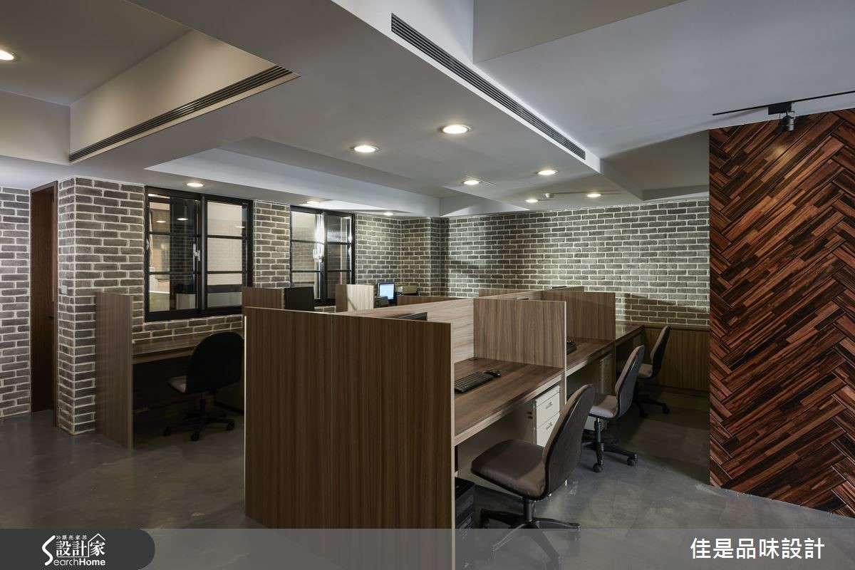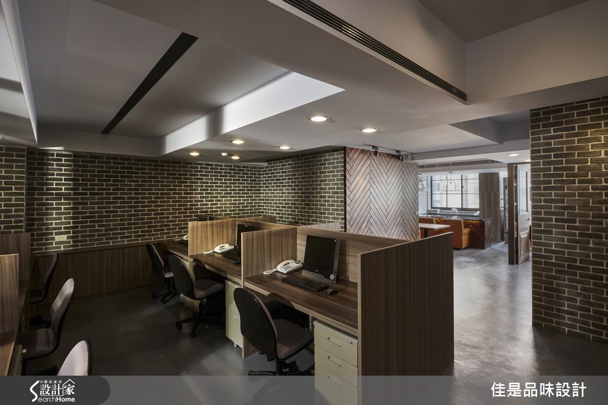 业主希望将超过15年的老房子改造为办公室,但需将仅有93平方米的空间,容纳两间主管办公室、员工工作区、休憩及会议区。因此希望藉由设计师擅长重整格局与独到的美学理念,打造出富有人文气息的工業混搭风格办公室。 【文化石与木质,拼贴咖啡馆情调】由于屋案仅有一面采光,在明亮度不均的情况下,整个空间更显得狭小拥挤。因此,设计师以廊道分别将主管办公室、开放工作区及会议区分隔在空间的两侧,让阳光得以从中央走廊进驻空间,创造明亮开放的空间感。为了让工作环境符合企业本身的人文理念与形象,设计师精心挑选灰色文化石与木材质交互创造空间墙面表情,整体设计并在水泥粉光地板的朴素衬托下,呈现出独特的复古情调,成功扭转传统冰冷的办公室形象。主管办公室更以大片木格窗形制作,搭配银波玻璃、长虹玻璃等不同的玻璃纹理折射光影变化,不仅富于层次,增添生动的趣味,也具有扩容的效果,并兼顾了空间内部的隐私需求。