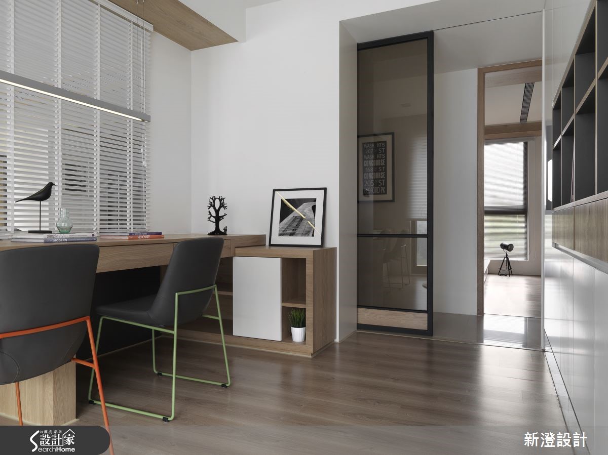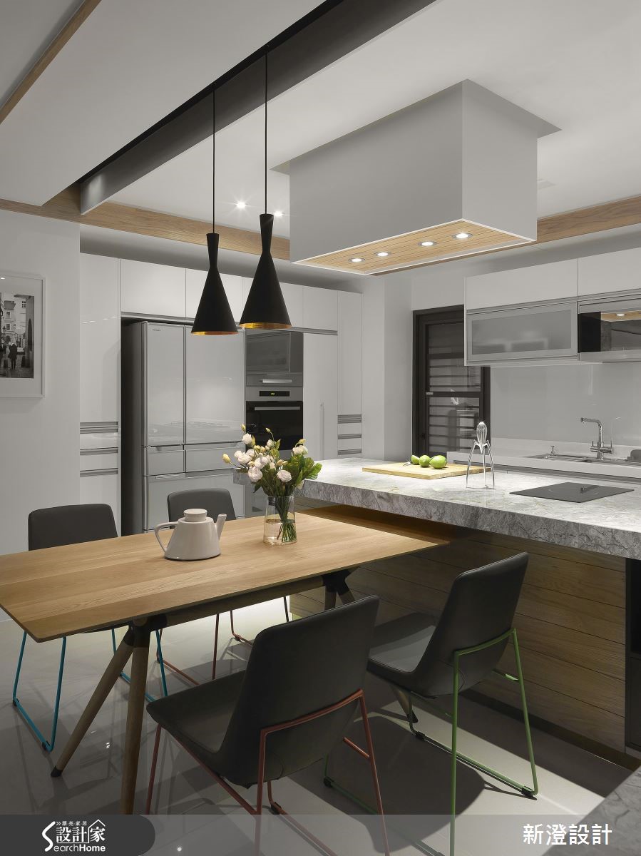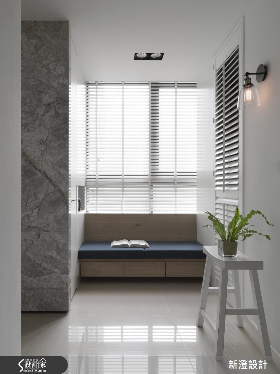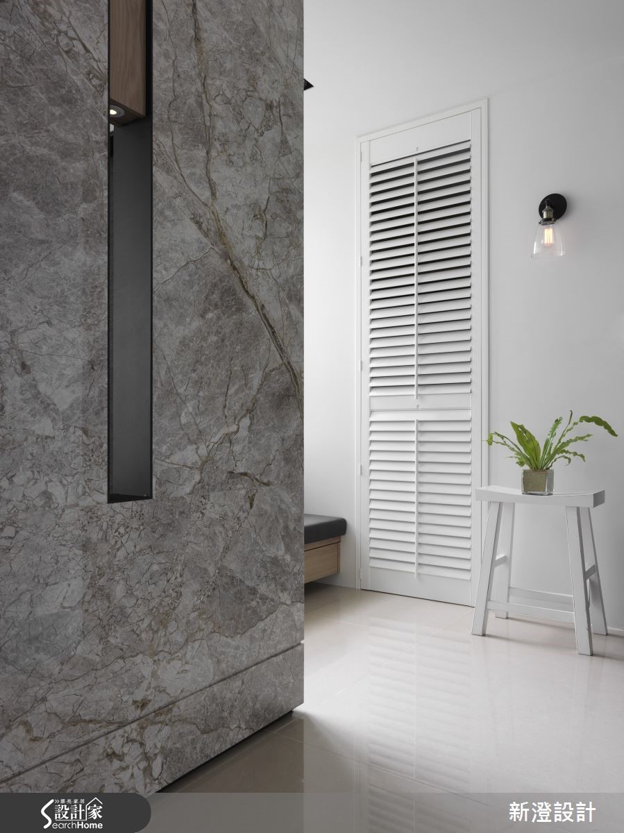 设计师为208平方米宅邸注入大量纯白色调,并藉由融合各种木质、铁件与石材等色彩相近却富有温润气息的元素,进而抹除苍白冰冷的可能性,更突显了纯白居家的和谐调性与质感魅力。【充实玄关收纳,型塑清爽视感】玄关大理石质感墙面以沉稳色调与纹理迎接屋主,中心挖空的长型凹槽成为另类的照明空间,向后延伸即是富含大量收纳机能的穿鞋区,除下方抽屉外,木百叶落地门后隐藏及顶L型收纳格柜,将所有杂物井然收纳,维持视觉清爽。【纯白搭配木石,挹注优雅质调】客厅天花以实木皮进行框设,使纯白色调得以聚焦,下方L型大理石基座自窗沿延伸至电视墙下方,让靠窗沙发转变为飘窗空间,除了置物功能外,更可拉升视觉层次。开放餐厨区域同样以白色调与木质元素完美融合,将木质餐桌与大理石台面结合,上方的下降式照明提供聚焦光点,而椅脚的缤纷巧思更为纯白厨房增添迷人光彩。【质感灰系主卧,引领时尚风情】主卧与两间次卧分别以不同氛围进行呈现,主卧以灰色为主轴,包含床头绷布与富有童趣的路标装饰,充满时尚沉稳的气息;而次卧则利用软件与墙面为空间增添缤纷色调,并将卫浴设备建置在外部,利用大面积开窗达成内外通透感。