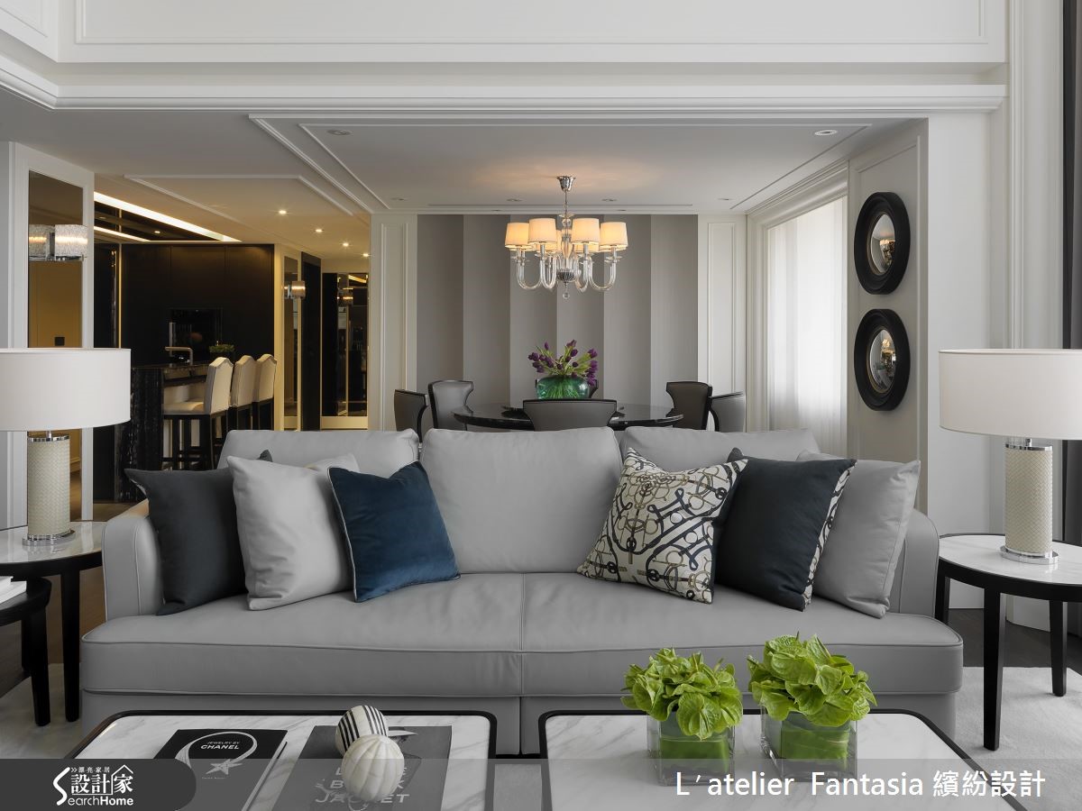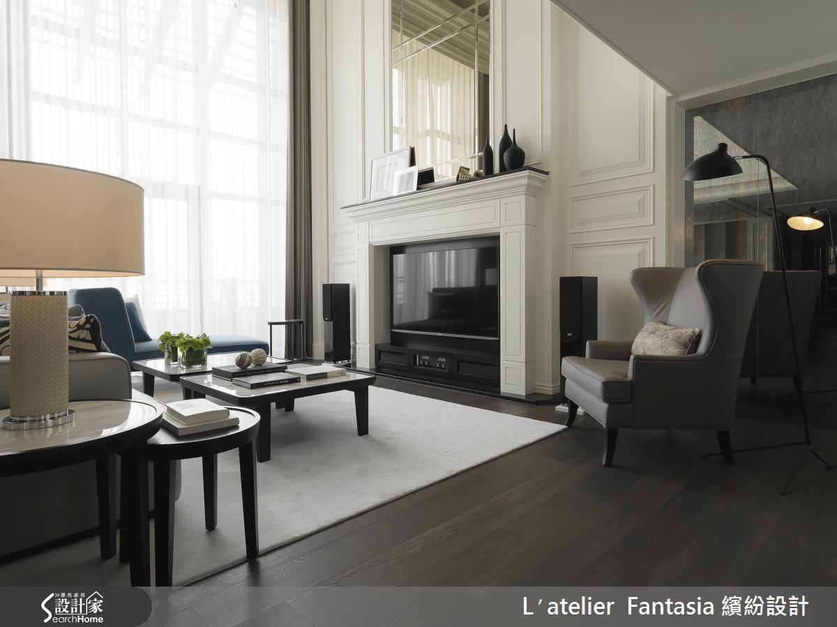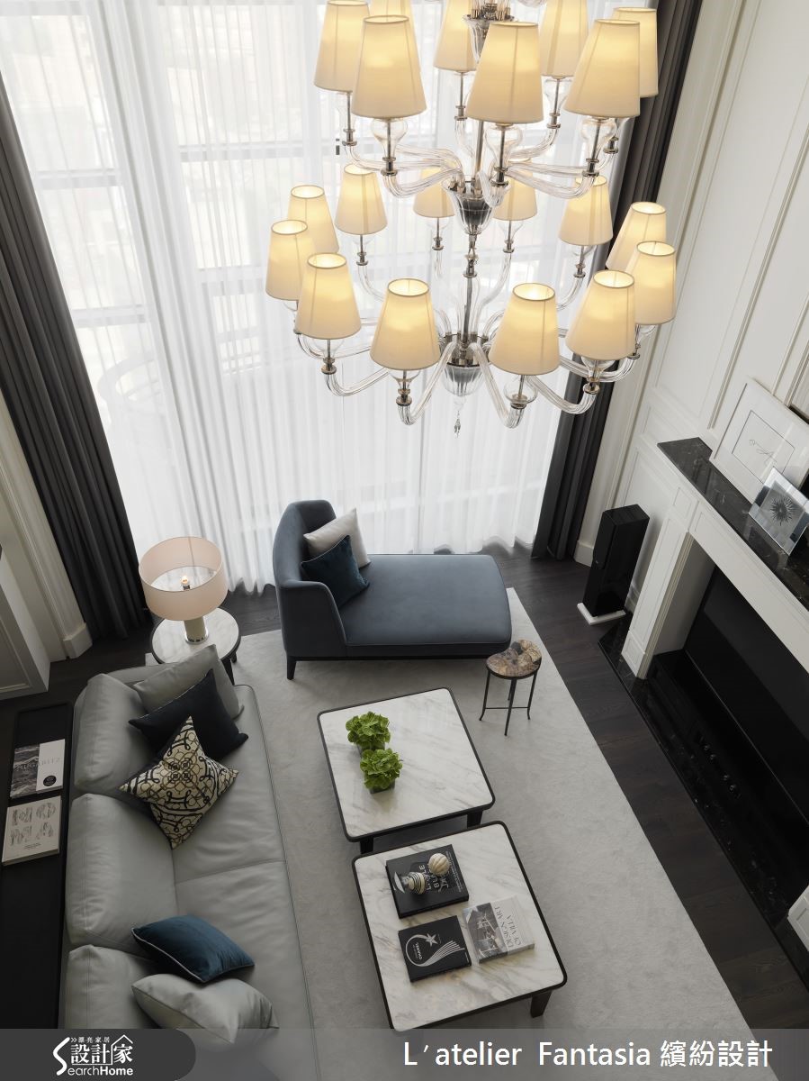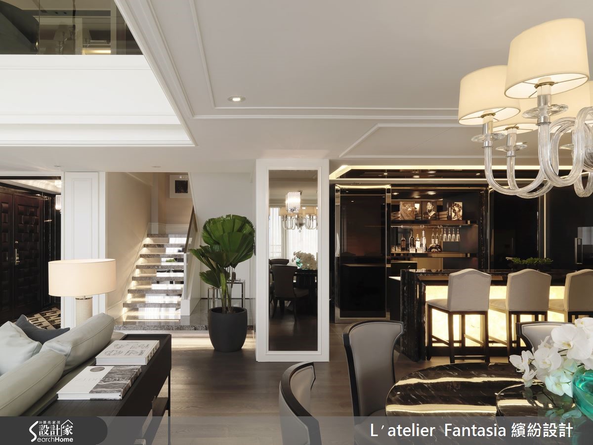 231平米的跃层,因房屋结构位置问题,造成局部天花板无法升高,于是设计师运用线板型塑垂直线条,并以电视墙尺度拉高空间比例,搭配灯饰、镜面妆点,打造出挑高气派的新古典欧美华宅! 【善用挑高屋型,打造气派电视墙】走进玄关,可见大理石地坪铺述华丽场景,呈现出宛如伦敦豪宅的印象;来到客厅,则转换为木地板陈述温润氛围,并以白色作为居家主调,呈现放大感受,电视墙则一路延伸至2楼,引领视觉向上,同时加入线板点缀,形成延伸的挑高效果。【古铜镜和吊灯,巧妙串联空间】墙面中央妆点一面长型古铜镜,透过折射效果丰富空间层次,天花则悬吊高雅吊灯,在奢华之中挹注一丝简约美感;厨房设计则采用开放式规划,在中岛吧台加入发光透光云石,展现出有如夜店般的时尚气息!