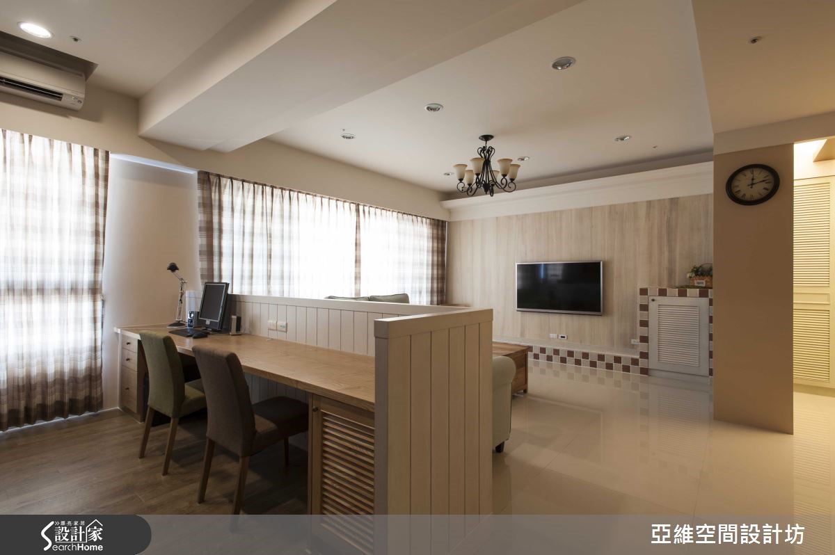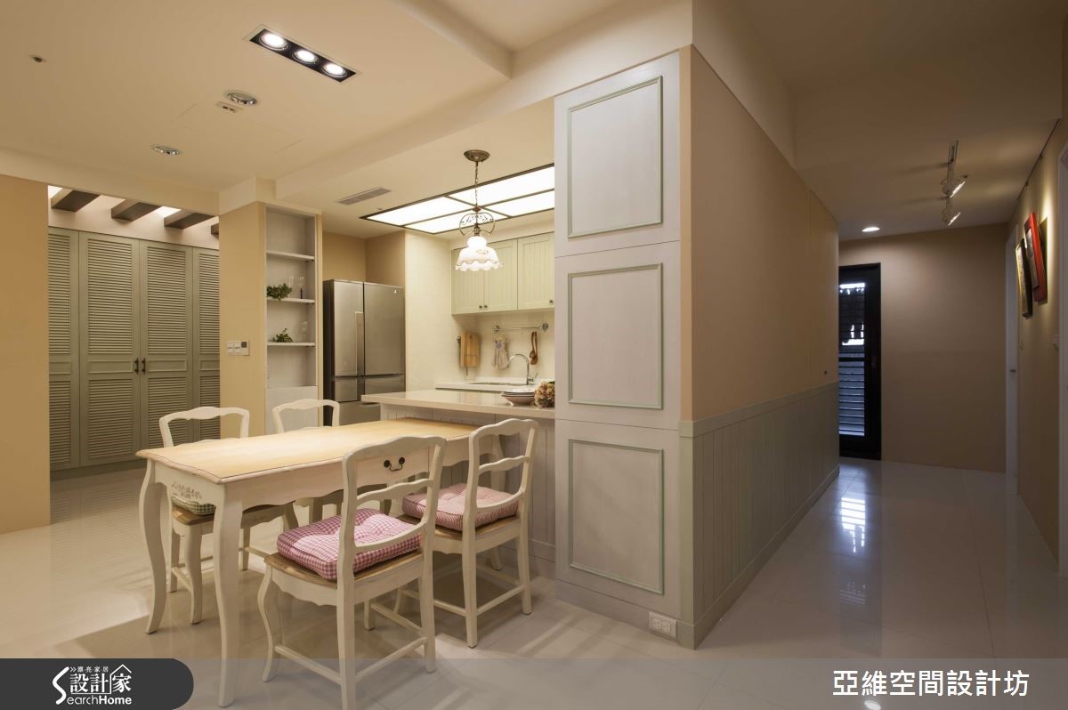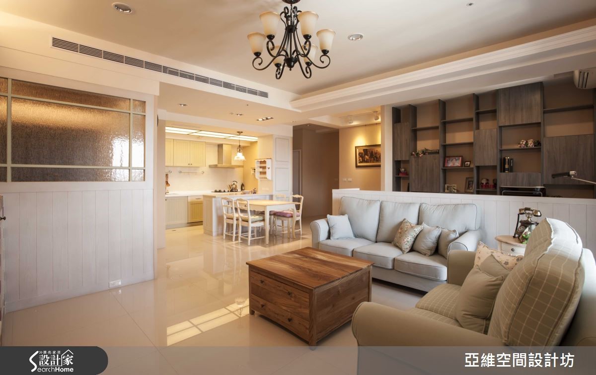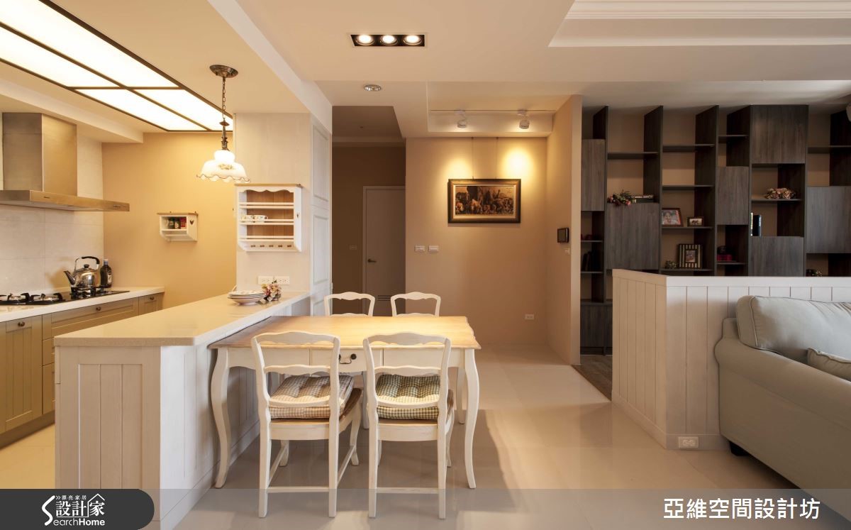 116平方米的空间,以开放式设计整合不同领域,展开3口之家的无隔阂生活,设计师以屋主钟爱的乡村风为空间定义,室内绘上恬淡柔嫩的色彩,让家变得甜美而温馨,另外也利用廊道的畸零区块打造收纳空间,满足生活需求。【隔断不做满,增进家人交流】以原有梁柱架构界定客厅、餐厨以及书房领域,厨房中岛及与书房区隔的沙发背墙皆为约半身高度,让采光和视野不受拘束。厨房以线板和欧风造型的桌椅融入乡村风语汇,并在厨房中岛旁延伸餐桌,增加互动参与感。【融合几何方格,赋予趣味律动】可同时容纳两人同时使用的书房,铺设木地板及整面木色展示柜营造沉稳氛围,大小不一的几何方格框起收纳空间,带来律动感及趣味性。设计师也在室内廊道、卧室中融入大量的收纳机能,并结合美型设计,利用门板巧妙隐藏突兀感。