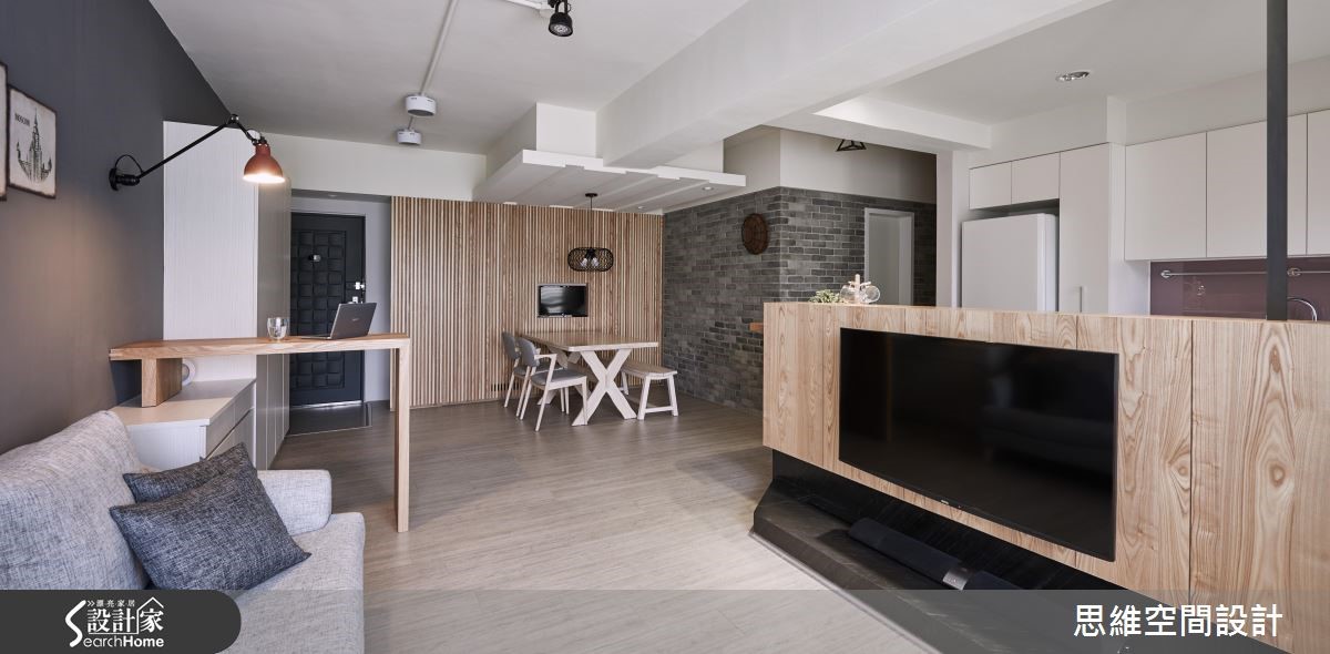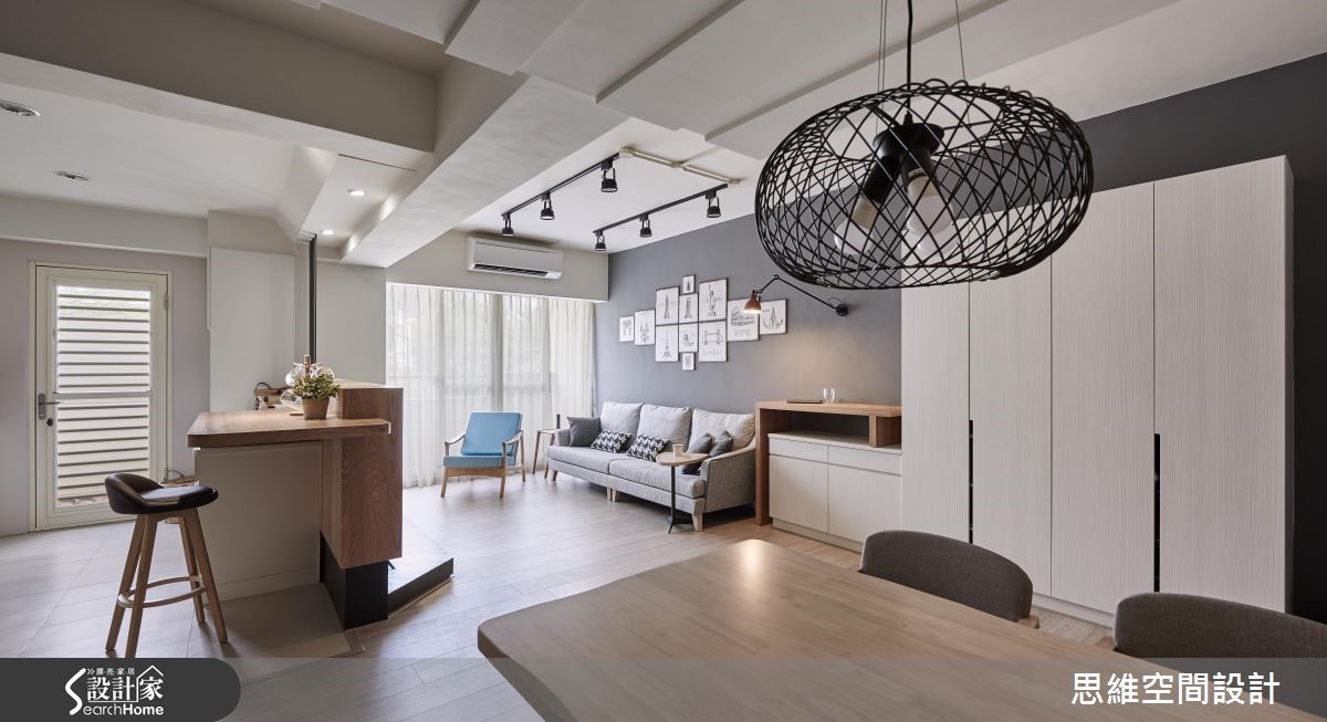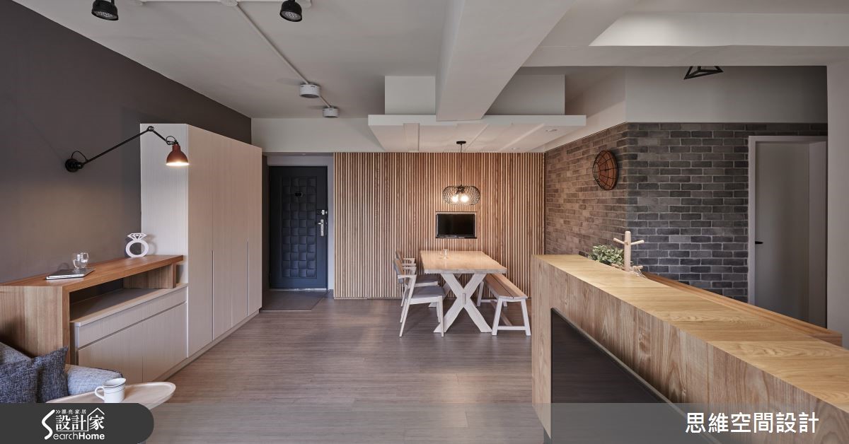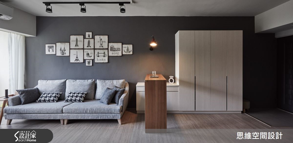 原本作为出租的老屋,房型较为封闭,导致采光无法流通。即将结婚的屋主收回自住后,设计师以开放式设计达到扩容的效果,并且大量使用木元素,营造悠闲风,也为喜欢时尚彩妆的女主人规划专属更衣室,尽情妆点时髦生活。 【半高电视墙,引进采光转成吧台】设计师将客厅与餐厨串连,使空间更形宽敞。从玄关处进入后,大面积的开窗将明亮采光引入室内,客厅墙面涂上沉静的深灰色,摆上黑白的异国城市画作,与造型简单的灰色布织沙发、单椅,相当具美式都会的时尚质感。 梁柱下方的电视墙作为与厨房的界定,并延伸台面融入吧台的功能性,台面下方也可作为电器的收纳。一旁用餐区,侧边的造型墙面隐藏收纳机能,后方则铺上颇有复古色泽的文化石,在编织吊灯照射下,让用餐时光更加温馨。 拆除格局将两个房间合并后,让主卧室拥有独立的更衣室,并扩大主卫浴放入浴缸,可享受泡澡乐趣。更衣室结合梳妆台,并利用层架、抽屉、展示收纳融入大量收纳机能,且以大面开窗揽进采光,营造装扮的好心情。