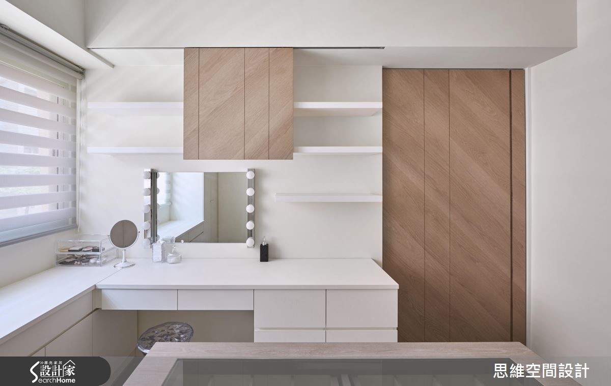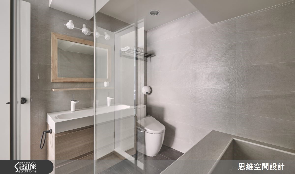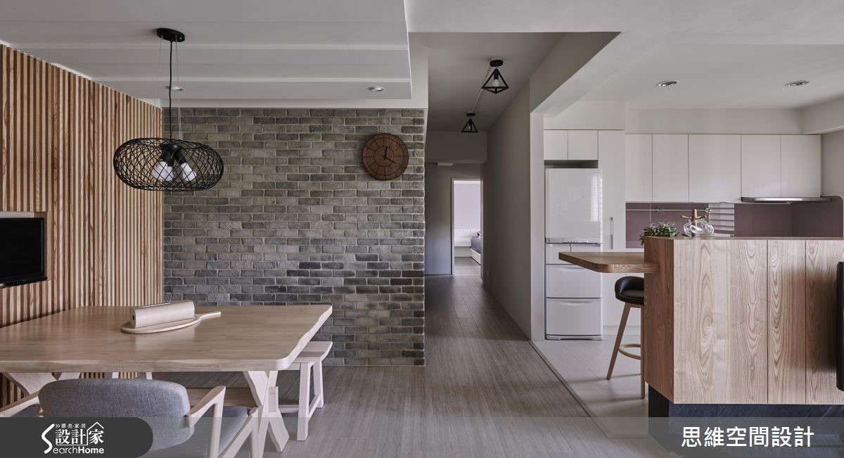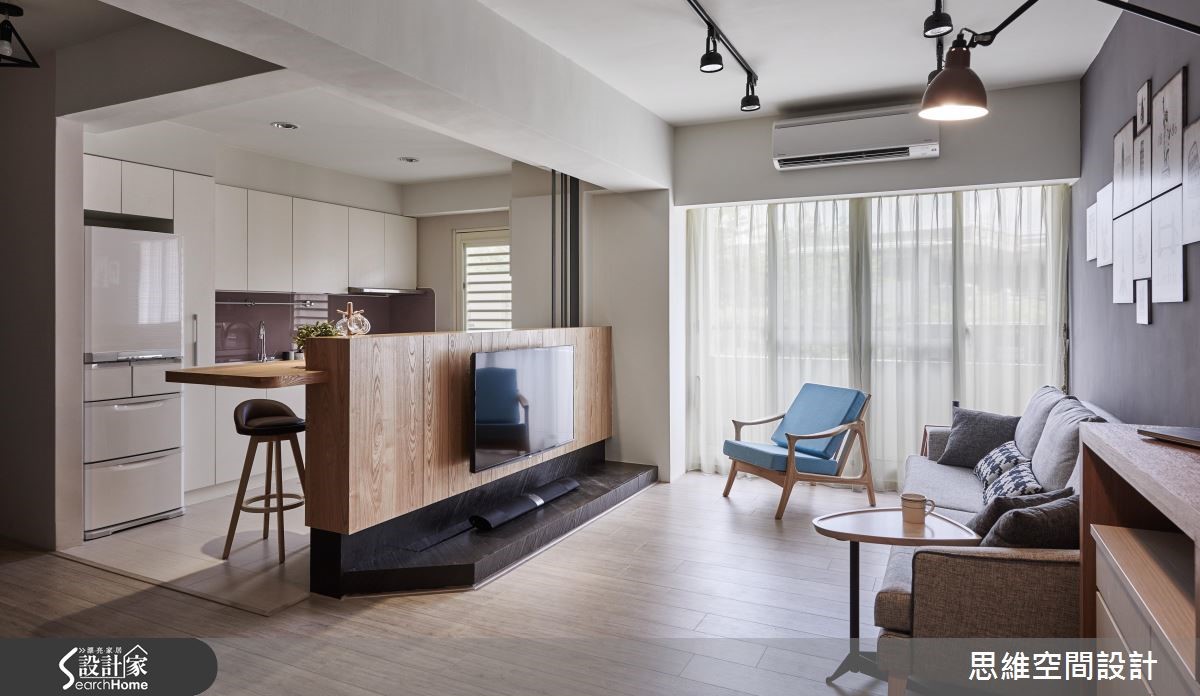 原本作为出租的老屋,房型较为封闭,导致采光无法流通。即将结婚的屋主收回自住后,设计师以开放式设计达到扩容的效果,并且大量使用木元素,营造悠闲风,也为喜欢时尚彩妆的女主人规划专属更衣室,尽情妆点时髦生活。 【半高电视墙,引进采光转成吧台】设计师将客厅与餐厨串连,使空间更形宽敞。从玄关处进入后,大面积的开窗将明亮采光引入室内,客厅墙面涂上沉静的深灰色,摆上黑白的异国城市画作,与造型简单的灰色布织沙发、单椅,相当具美式都会的时尚质感。 梁柱下方的电视墙作为与厨房的界定,并延伸台面融入吧台的功能性,台面下方也可作为电器的收纳。一旁用餐区,侧边的造型墙面隐藏收纳机能,后方则铺上颇有复古色泽的文化石,在编织吊灯照射下,让用餐时光更加温馨。 拆除格局将两个房间合并后,让主卧室拥有独立的更衣室,并扩大主卫浴放入浴缸,可享受泡澡乐趣。更衣室结合梳妆台,并利用层架、抽屉、展示收纳融入大量收纳机能,且以大面开窗揽进采光,营造装扮的好心情。