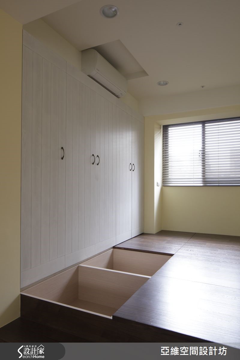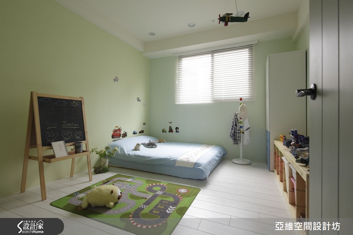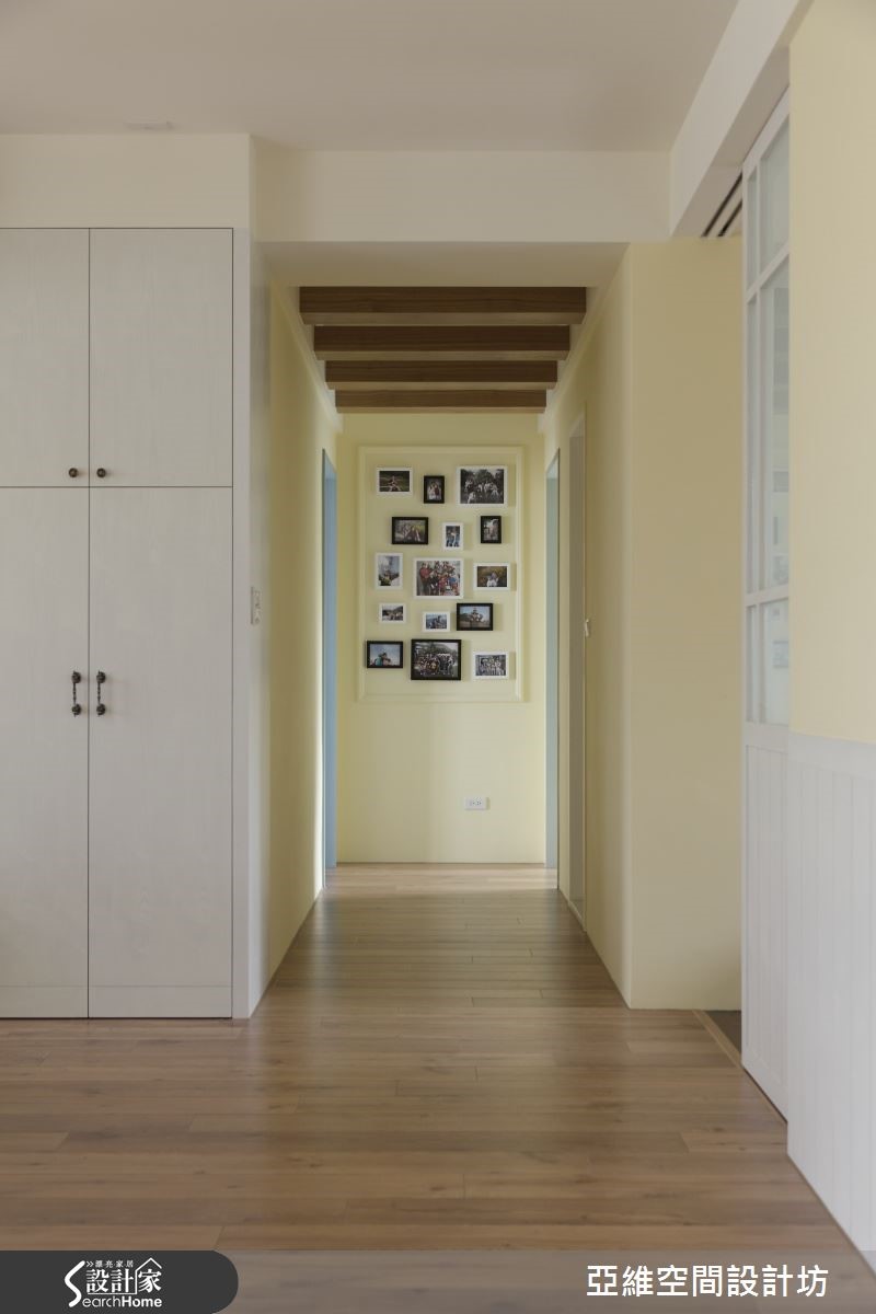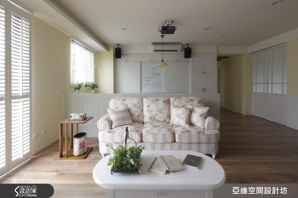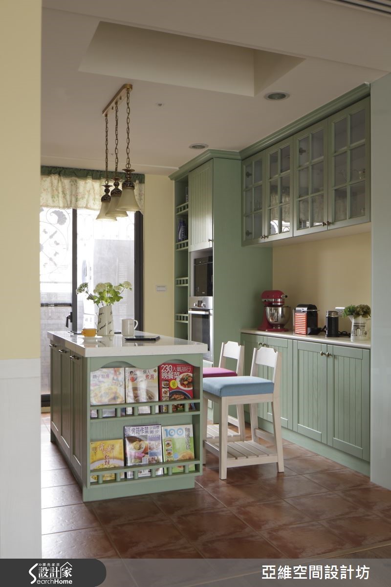 热爱户外活动的屋主,相当注重露营装备的收纳,设计师针对旅游规划特殊机能房,让所有必备品可良好收纳,同时又无损居室既有使用功能;另外,为了让全家3口感情更加紧密,设计师也打造开放式空间,让全家人有宽敞的互动场所!【打开封闭玄关,凸显轻盈感】设计师为开放式空间抹去封闭玄关,取而代之的是木百叶悬柜与复古砖地坪,让整体视觉更显轻盈,善用材质创造场域分野;电视主墙以大量文化石进行铺排,营造仿旧感,与粉红碎花沙发及百叶落地窗搭配合宜。【实木大长桌,成为交流聚点】矮墙后方为开放式复合书房,实木长桌除了用餐与阅读外,更可成为家人共同游戏、创造话题的所在,后方镶嵌于收纳柜的烤玻,更能随心所欲书写涂鸦,同时也可以利用门片,推拉之间让书籍或烤玻隐于无形。【唯美薄荷绿,引入清新生机】通过让家人可以尽情互动的宽敞动线,另端即为厨房与复合机能房,薄荷绿色调渲染了碗橱与线板门片,为经典乡村风厨房注入生机盎然,中岛吧台附有杂志架功能,成为家中第二个多功能场所。【善用地板下空间,提升收纳效益】富含收纳的鹅黄色机能房,除了大面积收纳柜体外,更利用垫高地板空间制造格状收纳;亦可作为客房用途。穿越鹅黄色木梁廊道即是两间居室,以轻松休闲氛围作为基底,搭配熏衣草紫与嫩芽绿等粉嫩色调,将自然原色纳进睡眠空间。
