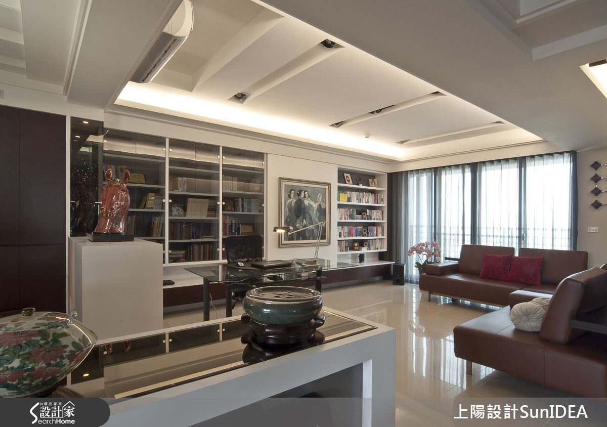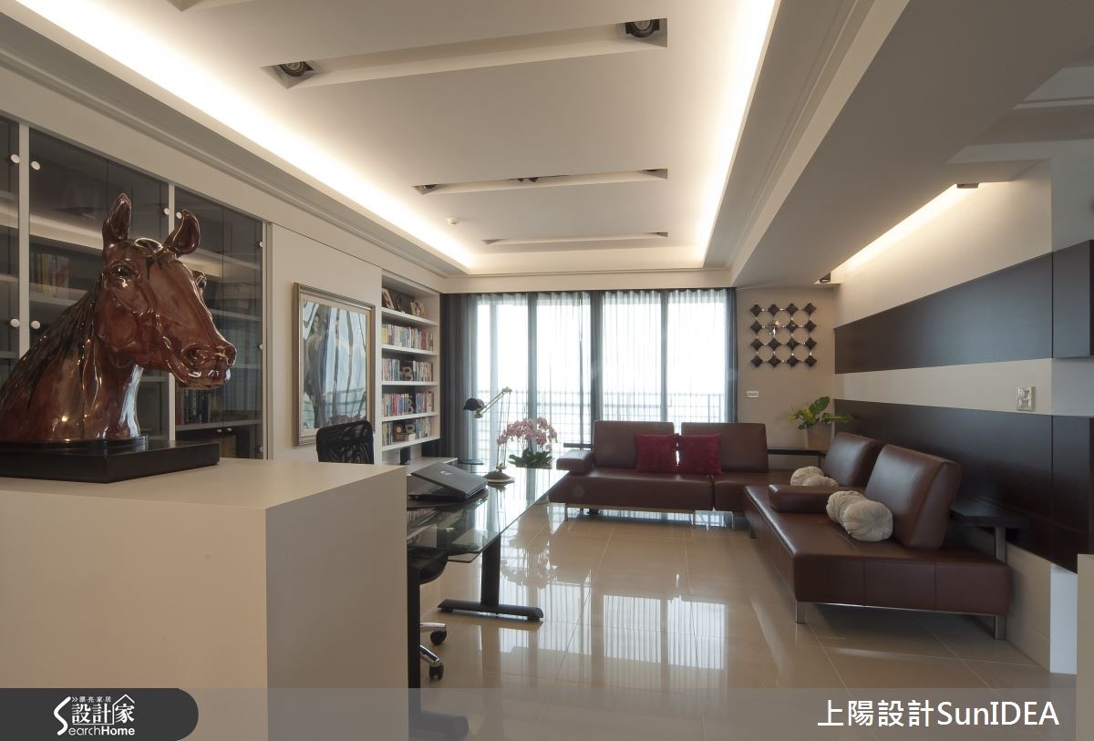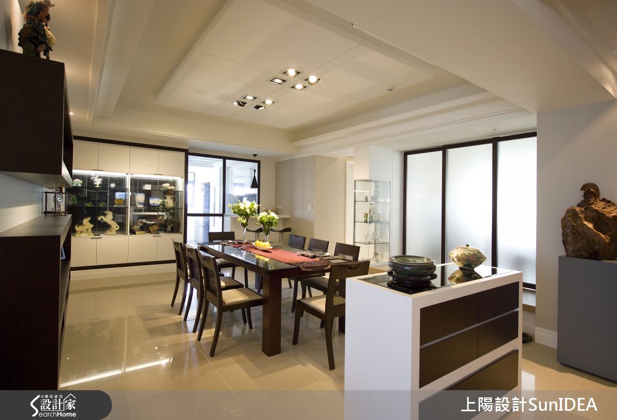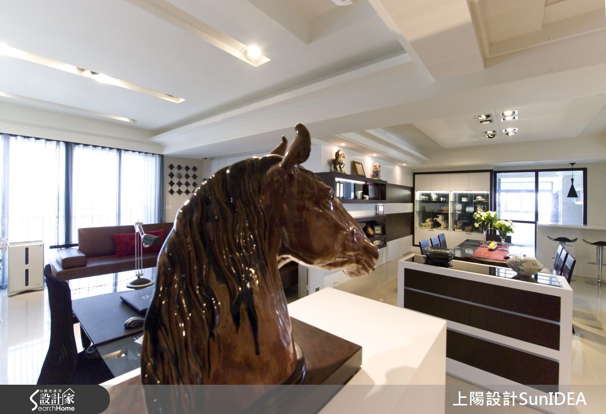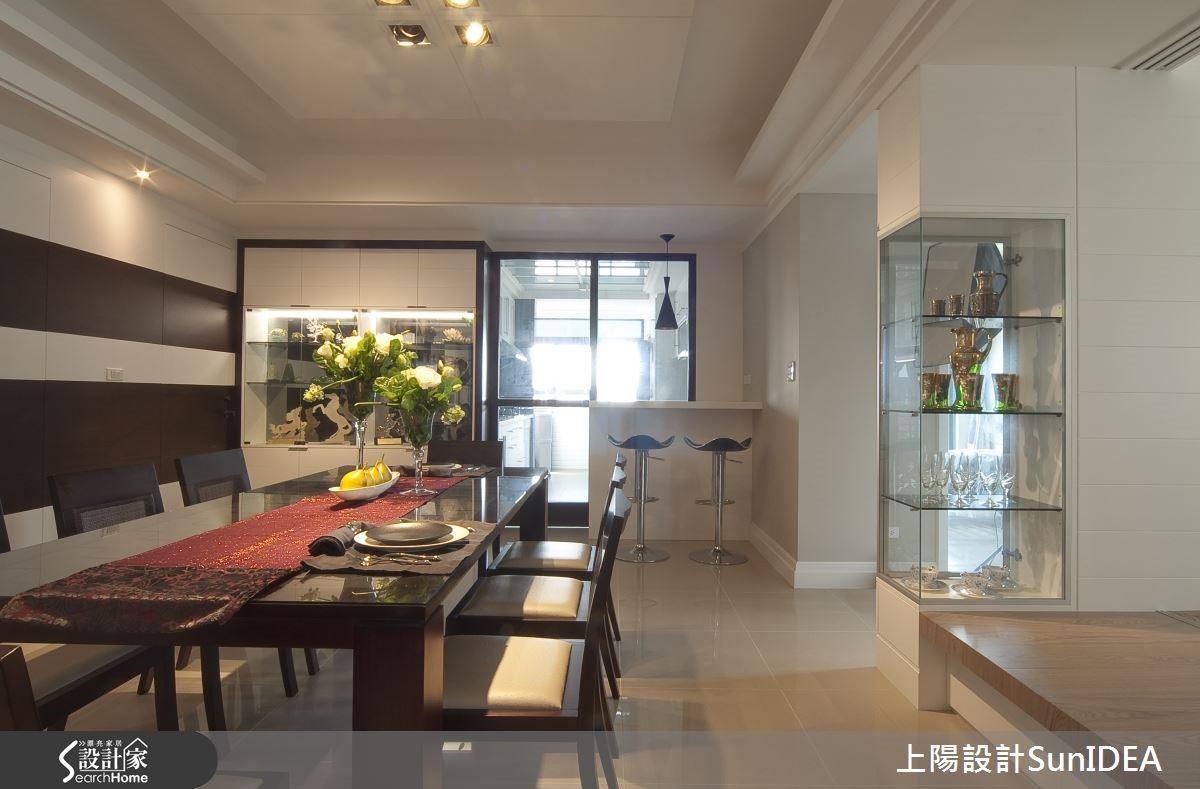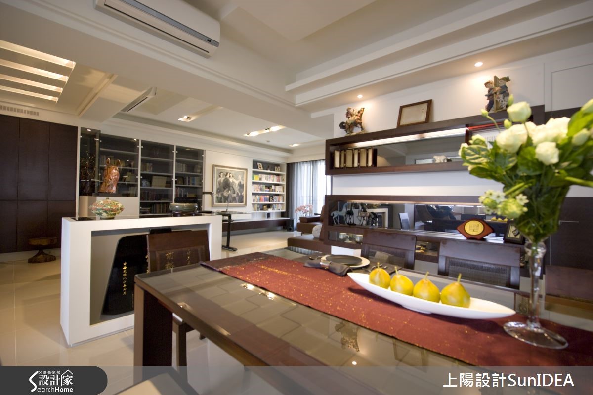 设计师将开放式空间如金属般分割锻造,以玄关为中心,分别画出L型居家型貌,并注入切合屋主的元素与韵味,恰如其分地呈现182平方米现代风大宅的应有风范。 【艺术展示区,为空间添文艺气息】玄关向后延伸为餐厅,流线实木皮转角后化身开放置物层架,与大面积透明柜体成为美好的艺术展示区域,和中心实木长桌形成成熟的古典气息;后方吧台成为厨房与用餐区域的接壤点,使视觉更显层次感。【复合式机能,多元应用空间】和室铺设木地板,创造温润美感,底部利用优良采光打造窗边飘窗,不仅可作为休憩地点,更能作为客房,成为复合机能空间。主卧特殊格状设计的床头墙,佐以优雅吸顶吊灯,营造彷佛酒店的高贵质感,只要搭配典雅的花艺或植栽,就能拥有完美睡眠氛围。