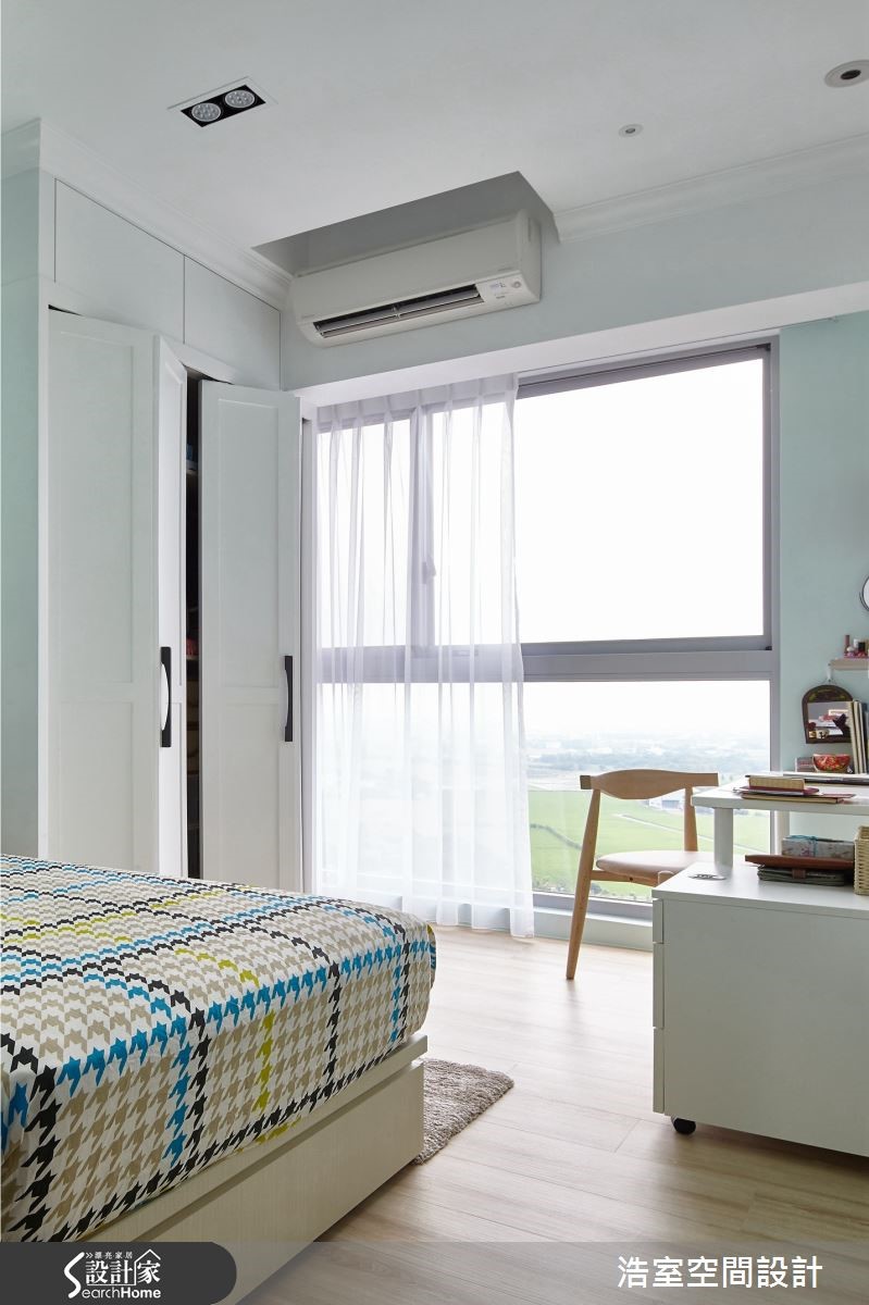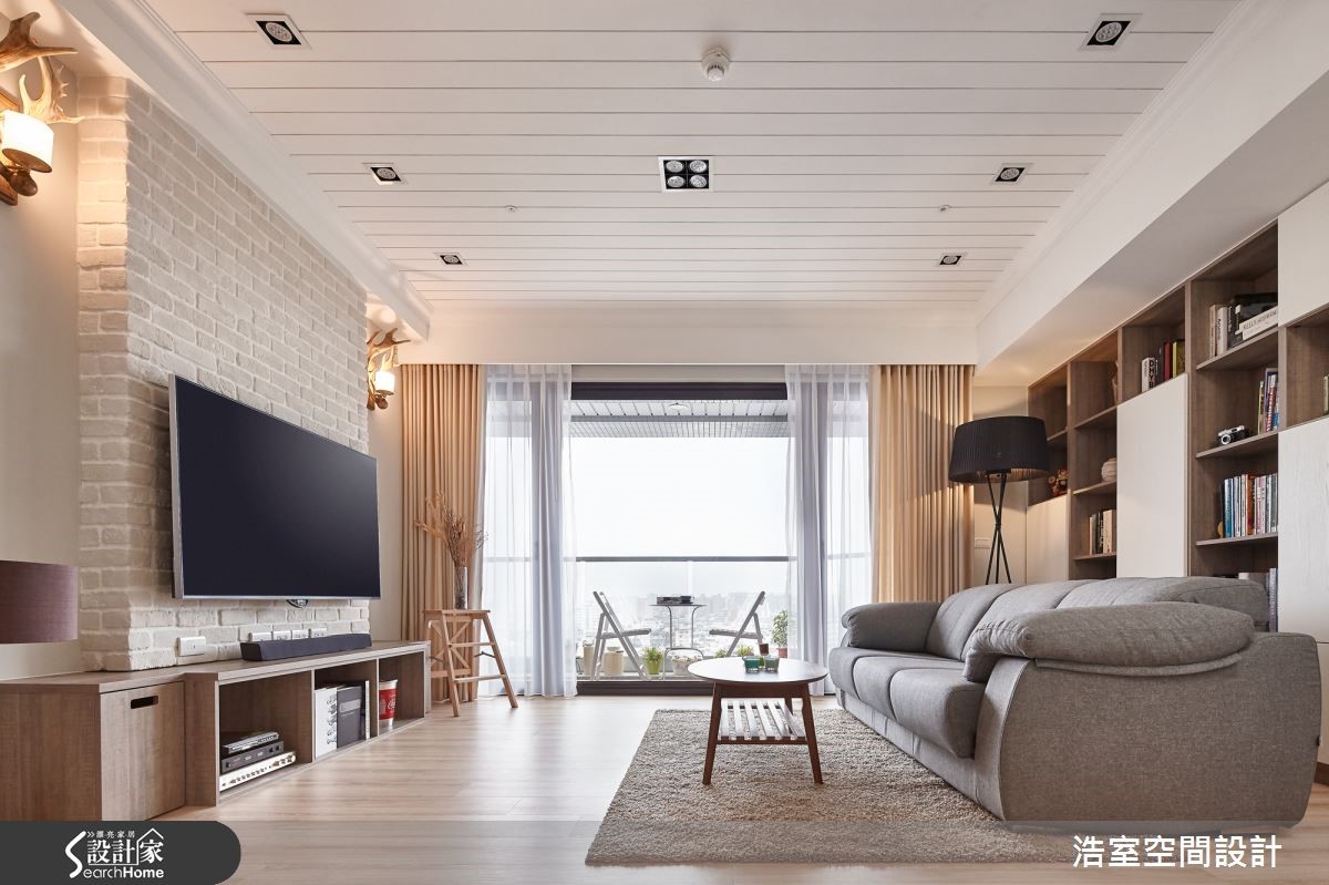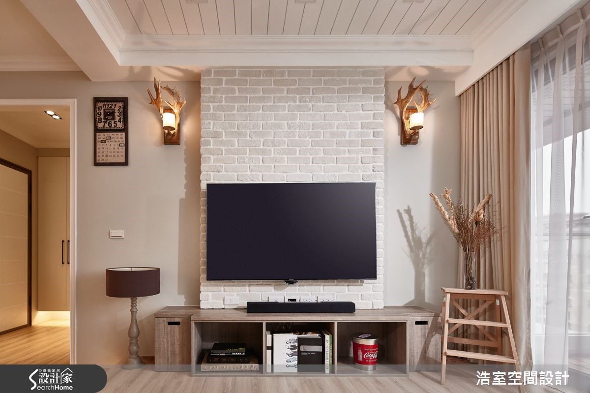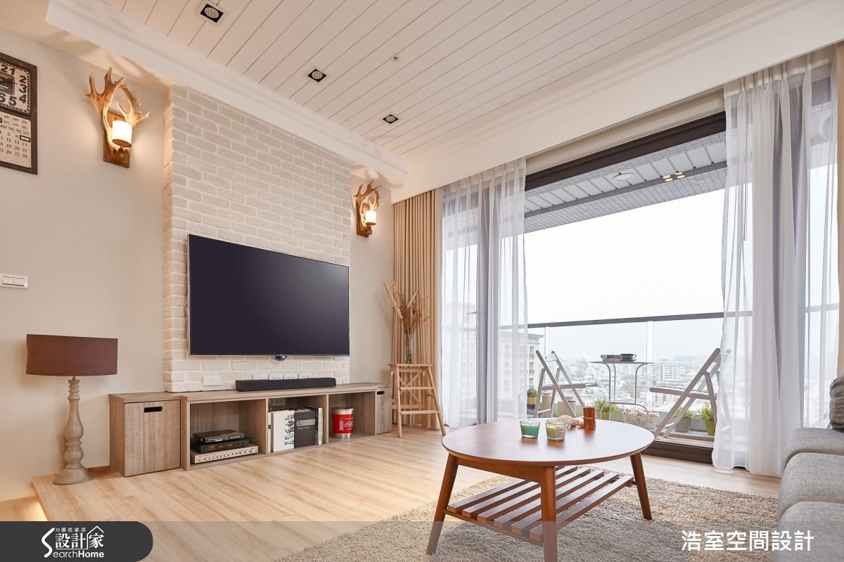 116平的新成屋,设计师以乡村风定义,搭配温煦暖意的轻浅木色调、文化石墙,再调和温柔光晕,绘制成富有秋日浪漫情思的异国居家风景。进入室内,整面落地窗将阳台处位于高楼层的绝佳视野纳入室内,成为舒心的视觉风景。【机能齐备,让小家也好好住】开放式场域以温雅色调铺陈,部分空间采文化石墙面营造润和感,而客厅处则抬升地坪,作为与餐厅间的分野界定,并在下方嵌入柔和的金色光芒,消弭界线间的冷硬锐利感,也让视觉上更加轻盈。客厅不做满的文化石电视墙,留下两侧空间摆设软件单品,鹿角壁灯、复古时钟,以及曲线雅致的落地台灯,营造有温度的异国感。 而卧室墙面则以清爽的浅天蓝色,达到纾压疗愈的效果,并以大面积的落地窗纳入明亮采光,将美好风光尽收眼底。
