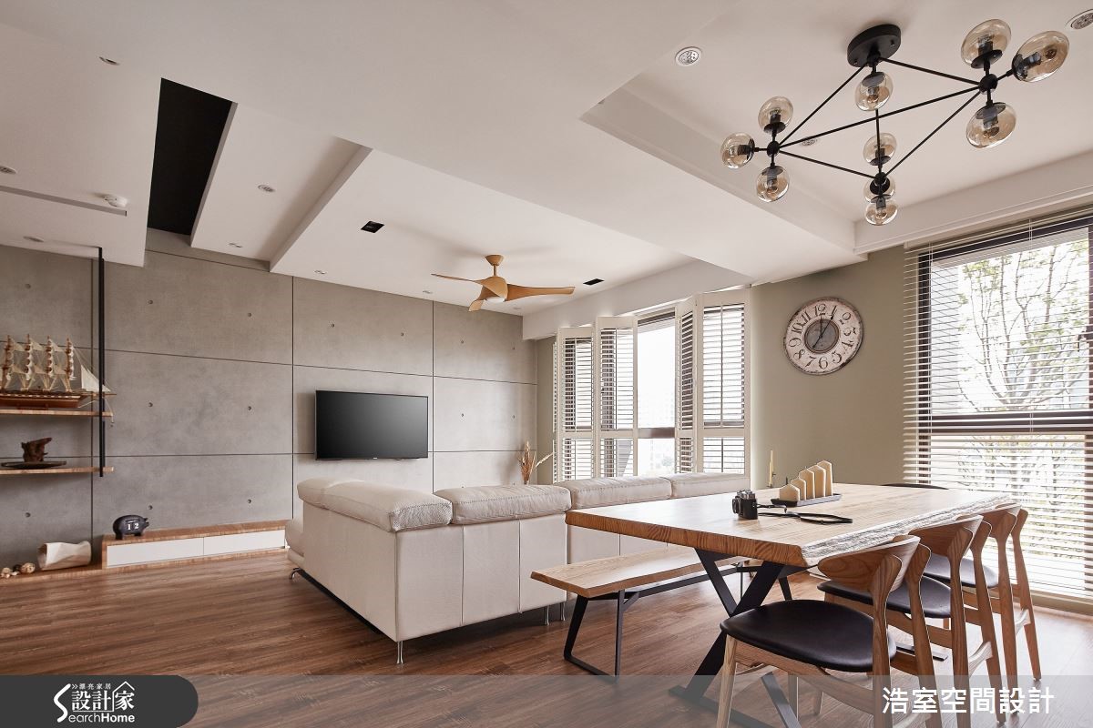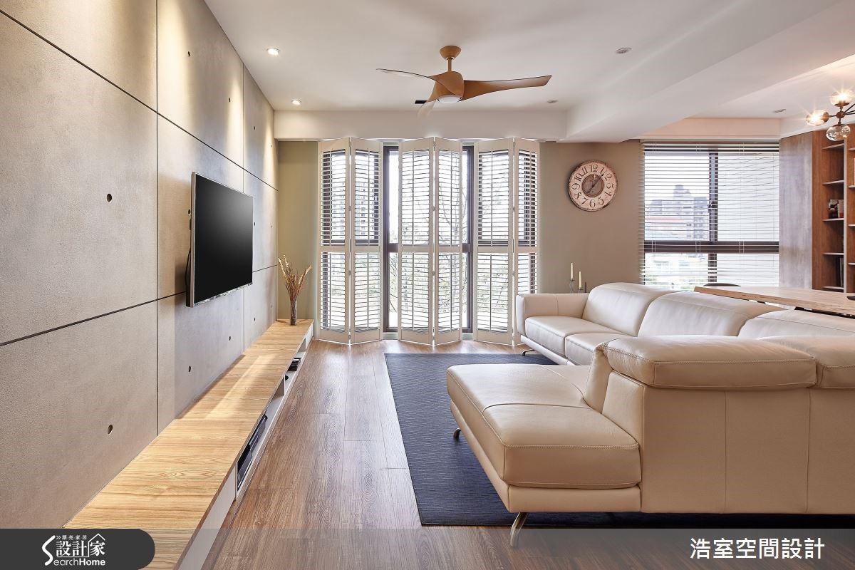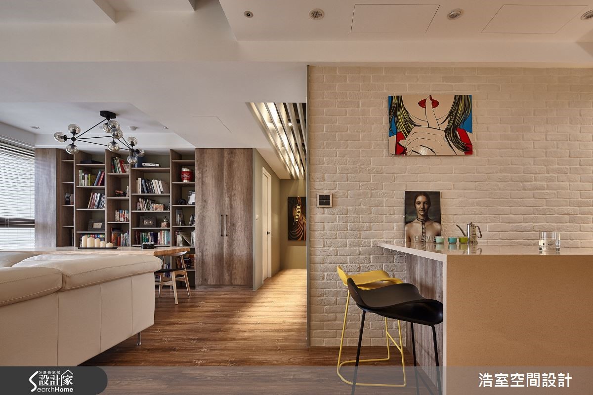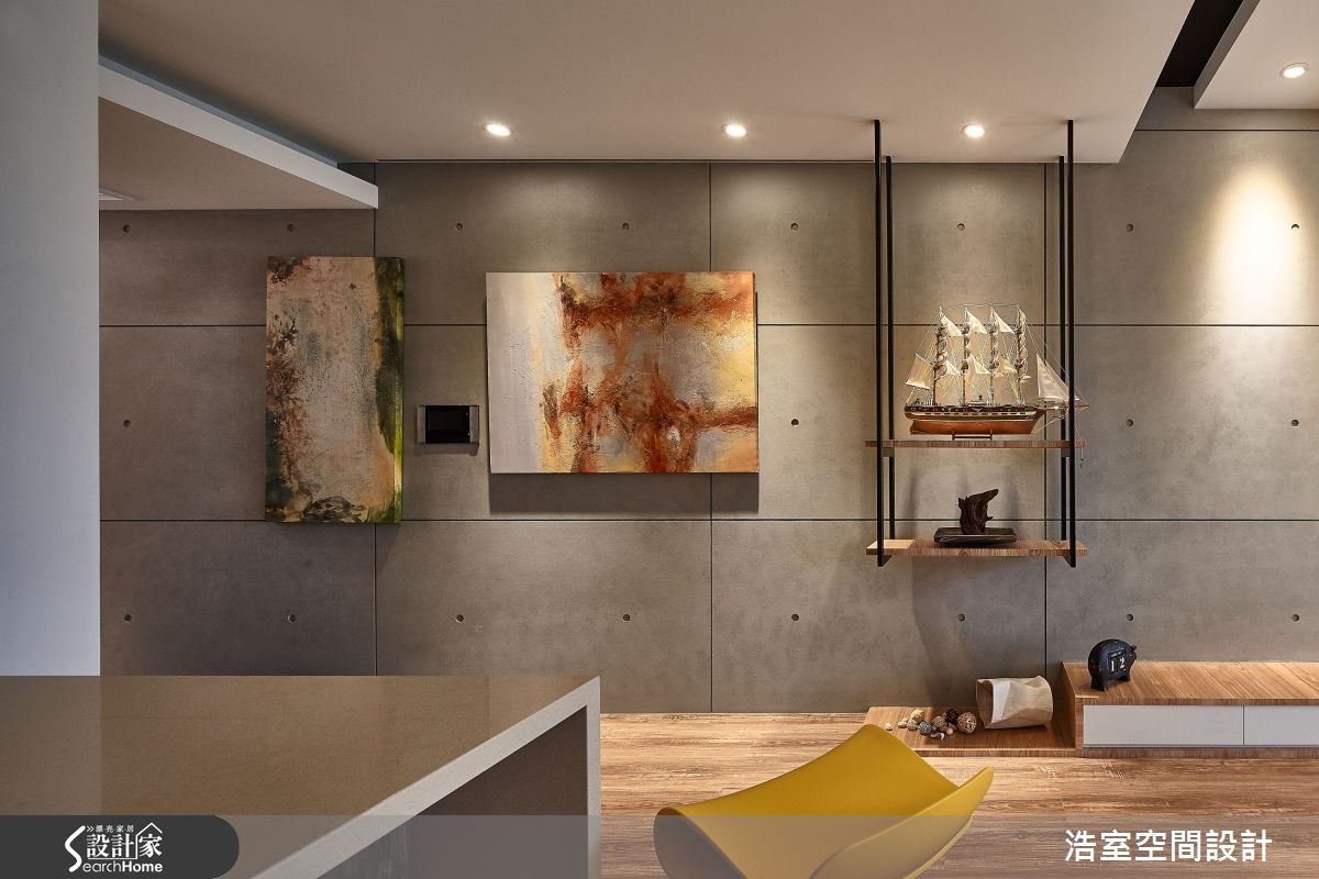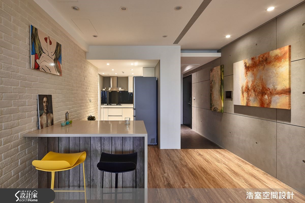 当靓酷冷调碰上温润暖色,会激发甚么样的火花呢?132平方米的混搭风宅邸,设计师利用水泥粉刷感壁面与天然木质纹理,创造独特的混搭风格,为冷暖比例演绎最新批注!【個性與溫潤材质,混搭精彩表情】玄关以水泥粉刷感板材铺设墙面,向内延伸至电视主墙,由暗而亮的光线效果,为视觉营造渐层感。进入开放式空间,设计师利用木地板、低台度电视柜与大面积木作收纳门片温柔的包覆冷调主墙,搭配皎白沙发与木百叶落地门,构筑完美冷暖比例。后方开放式书房的温润木质长桌上方搭配三角锥状吸顶灯,颇有当代艺术感,餐厨区域的墙面以文化石砌成,注入温暖气息,而精致吧台则成为左右两方场域的分野。主卧同样以富有仿旧冷调壁面搭配温暖木色,散发自然不造作的纹理况味。