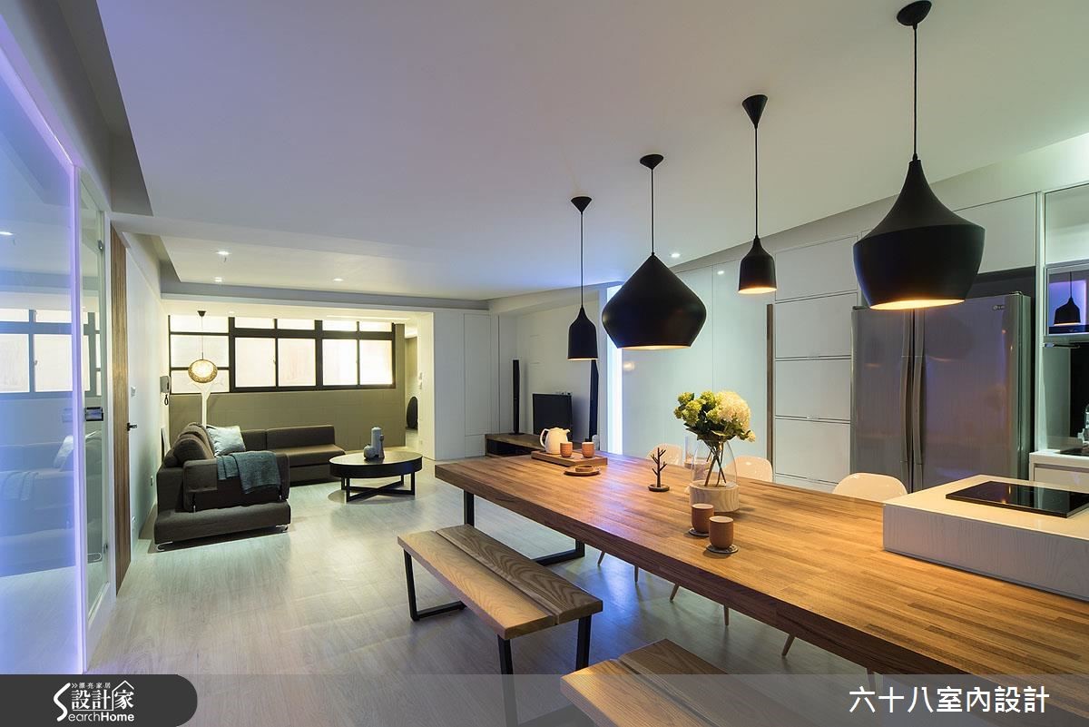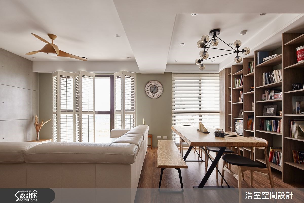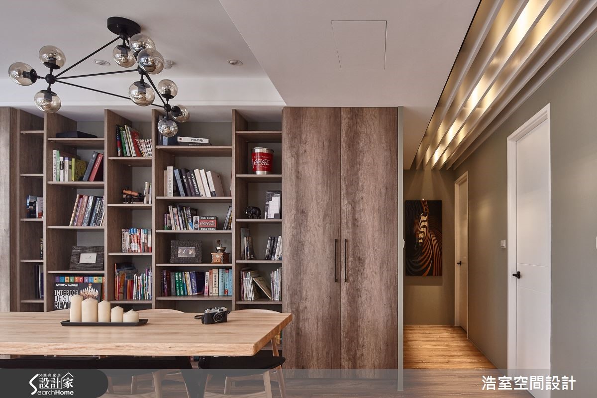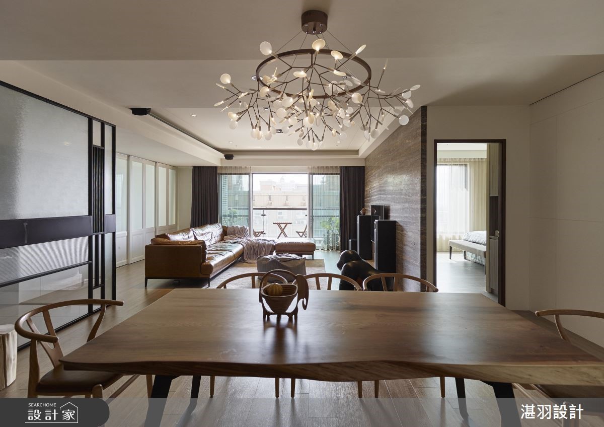 当靓酷冷调碰上温润暖色,会激发甚么样的火花呢?132平方米的混搭风宅邸,设计师利用水泥粉刷感壁面与天然木质纹理,创造独特的混搭风格,为冷暖比例演绎最新批注!【個性與溫潤材质,混搭精彩表情】玄关以水泥粉刷感板材铺设墙面,向内延伸至电视主墙,由暗而亮的光线效果,为视觉营造渐层感。进入开放式空间,设计师利用木地板、低台度电视柜与大面积木作收纳门片温柔的包覆冷调主墙,搭配皎白沙发与木百叶落地门,构筑完美冷暖比例。后方开放式书房的温润木质长桌上方搭配三角锥状吸顶灯,颇有当代艺术感,餐厨区域的墙面以文化石砌成,注入温暖气息,而精致吧台则成为左右两方场域的分野。主卧同样以富有仿旧冷调壁面搭配温暖木色,散发自然不造作的纹理况味。
