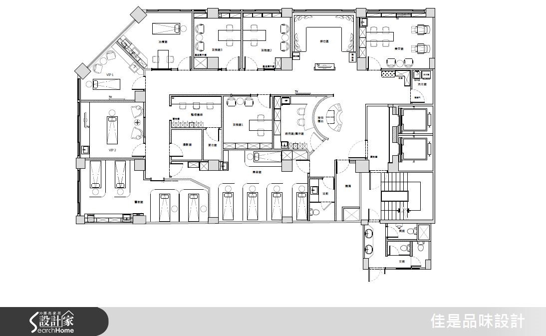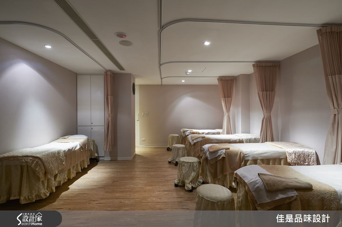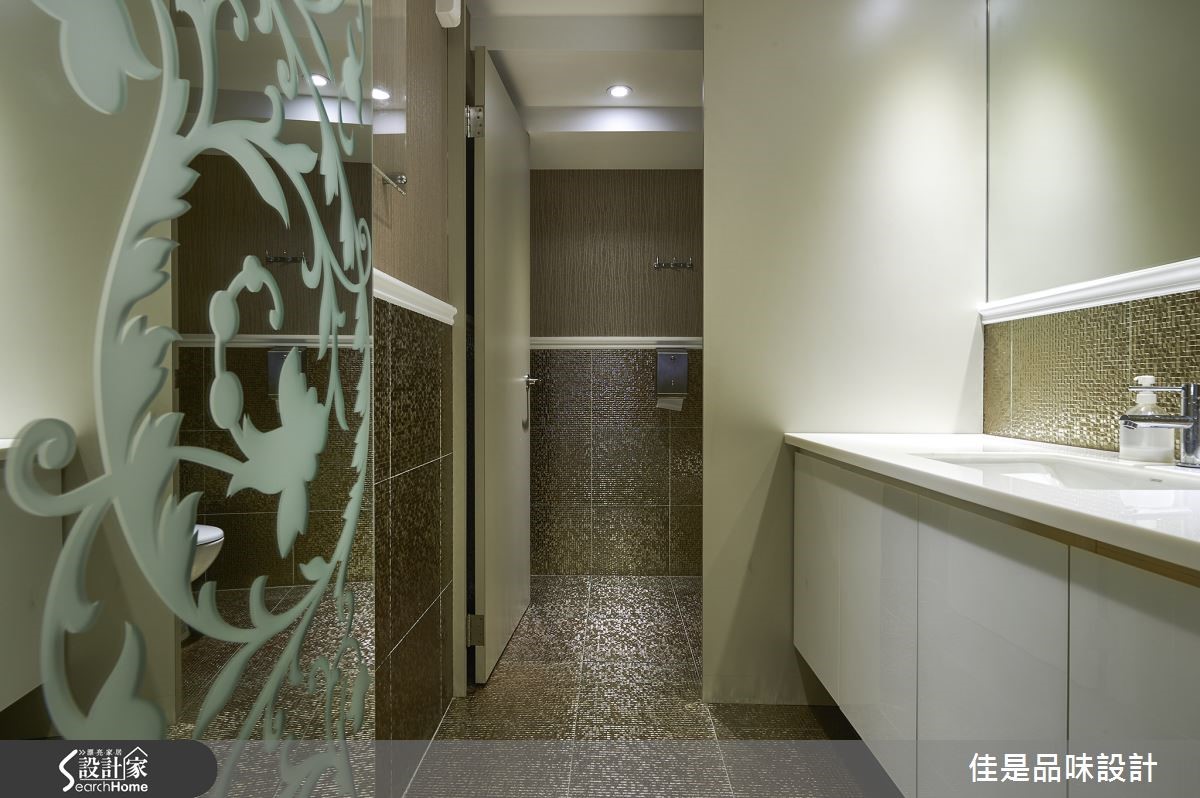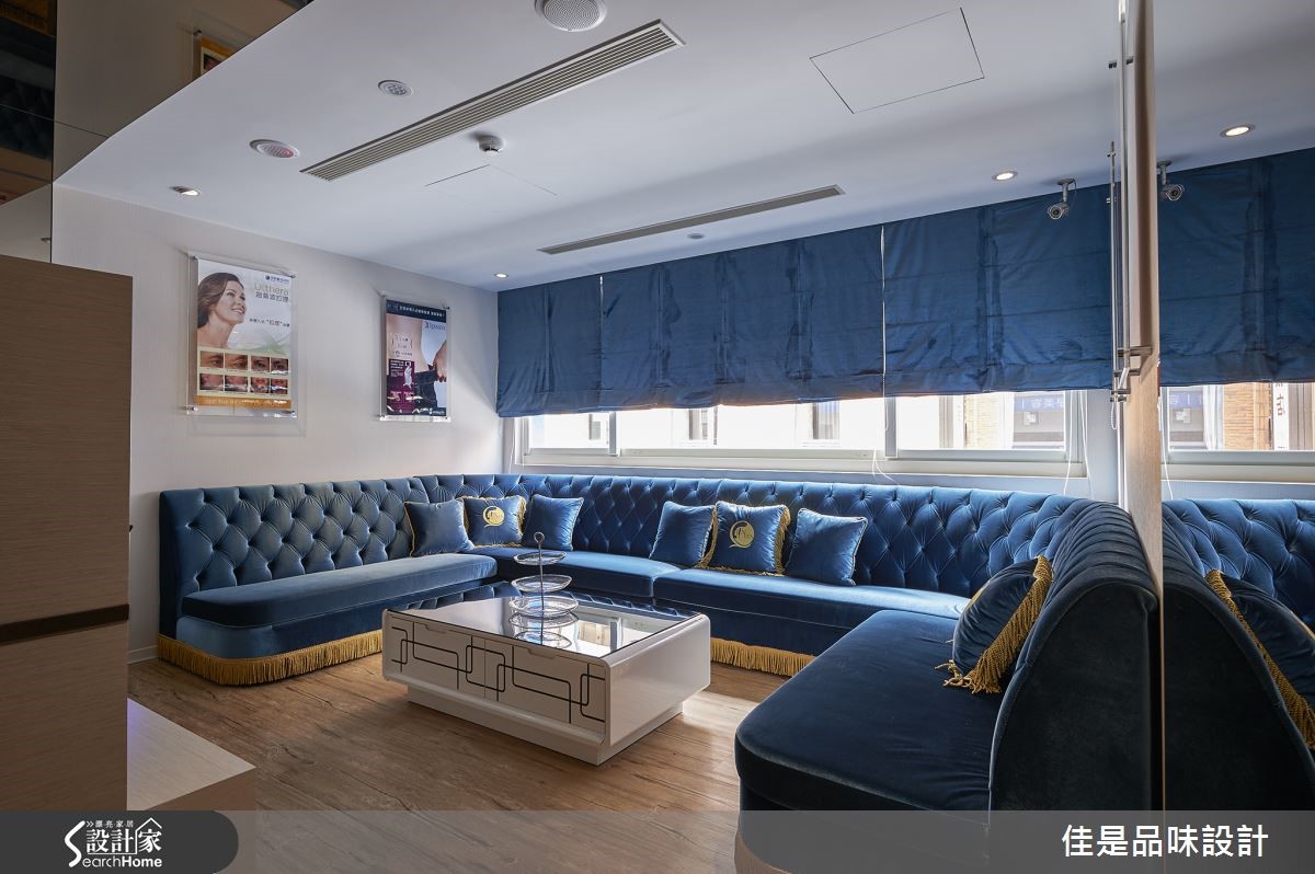 屋案原是超过40年的老屋,且改造前的格局并不符合业主的经营医美诊所的需求,再加上业主希望能跳脱一般诊所的冰冷氛围。因此希望藉由设计师独到的美感以及对于女性内心感受的细腻掌握,打造出宠爱女性身心的奢华风空间。 【善用镜面反光,金光宝蓝增奢华】此案空间虽大,但因机能与隔断需求也多,因此大厅的格局仍有局限。为改变狭窄大厅可能带来的局促感,设计师使用镜面设计来达到扩容的视感,使格局在视觉上得到松绑,更增添了大器之感。在色调上的安排,也因此案为连锁的医美诊所,所以在色彩规划也与总店呼应。以金色为主要色调,并由宝蓝色调搭配,营造出精致的古典氛围,让顾客能感受到熟悉感,却又有耳目一新的不同感受。此外,大厅的圆形图腾也是与总店的概念意象呼应,结合质感奢华水晶主灯,更创造令人印象深刻的惊艳之美。而设计师在空间其它区域也运用了相似的图腾样式,藉此营造出一致的美感和主题。更重要的是,设计师不只专注于奢华风格的空间设计。在重新整划空间的动线时,更是依照医美的疗程次序,将动线逐步的由外往内推进,藉由细腻的安排,让顾客能感受到尊贵的呵护。