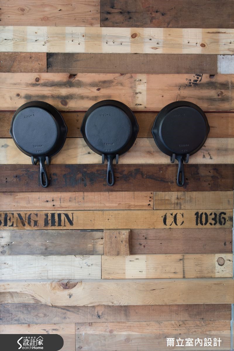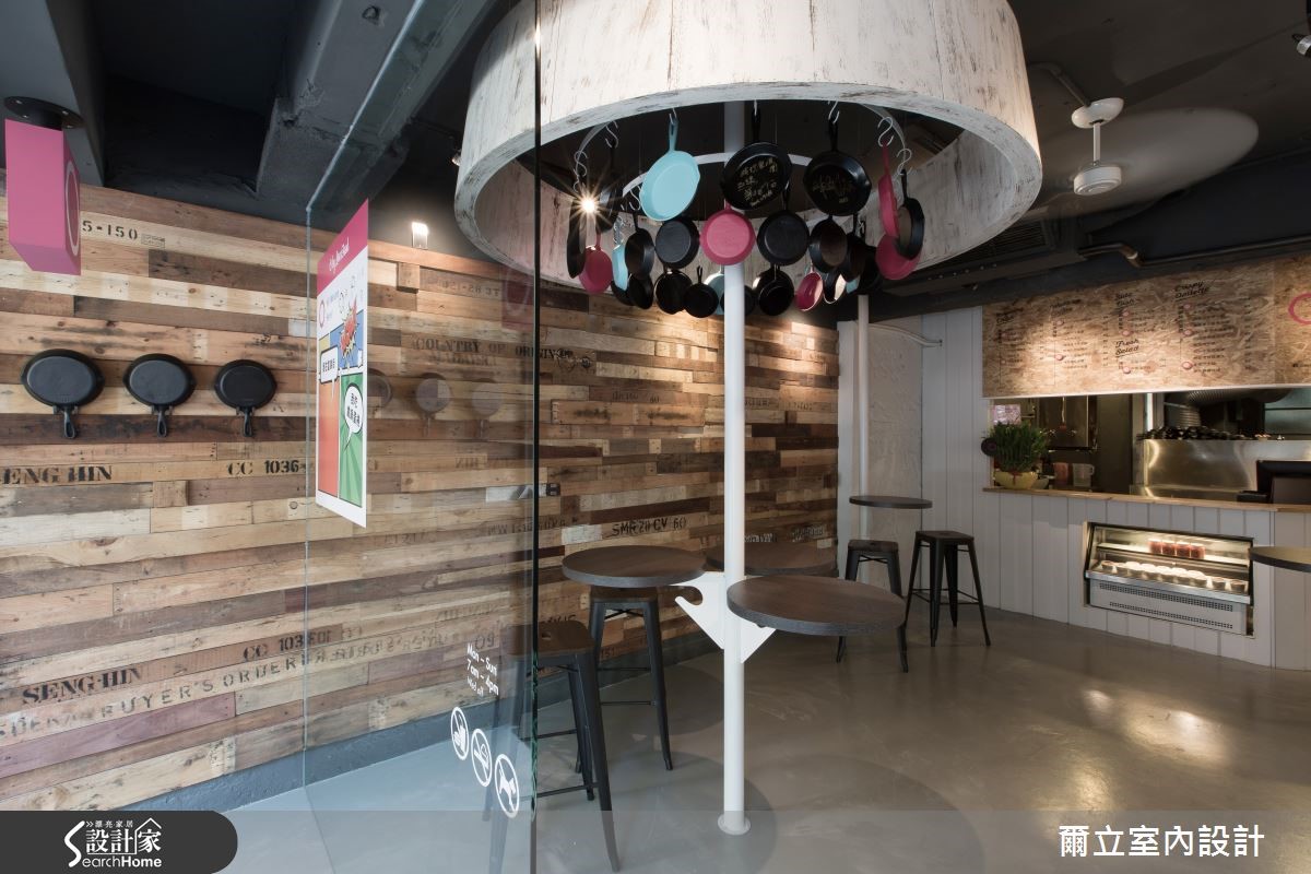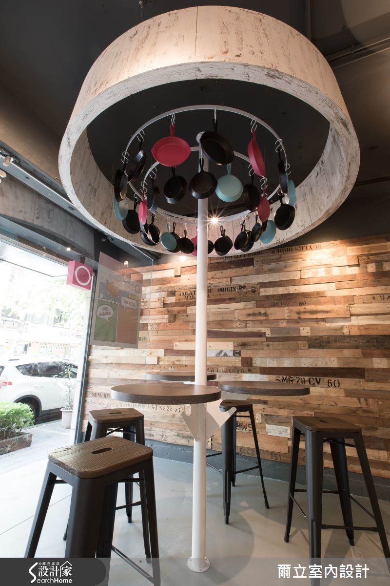 设计师改造老屋为特色早午餐店,在有限空间及店面宽度内,放入两套产品。运用铁板墙面贯串两间店面。在机能上,以达到彼此在营业可相互支持为诉求,同时规划店面的鲜明特色,以充满元气的视觉设计,带来讨喜印象。 【铁锅做墙饰,强化店面特色】店家门片以清玻打造,让店内与户外保有视觉连结。走进店内,则以质朴木头原色作为空间主色,木头主墙加入错拼层次,以手感的自然质材,创造复古怀旧表情。且刻意将铁锅化为墙饰,并选用跳色款式结合天花板,形成吸睛的悬吊装饰,阐述鲜明的店家主题。座位区则以三支铁管结合圆型桌板,架构出圆桌立食区,创造带有普普风的活泼意象。一旁的饮料店则以柠檬黄作为主调,利用回收桧木、二手复古椅凳等搭配,同时空间仿造货柜设计,给人一股"走进货柜买饮料"的新鲜体验。