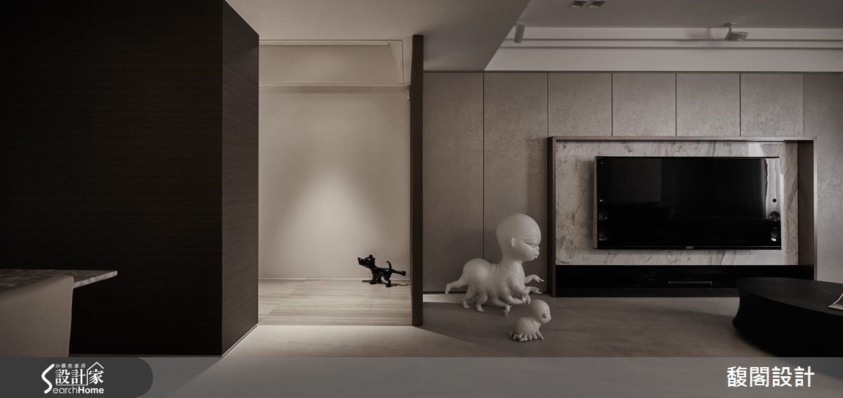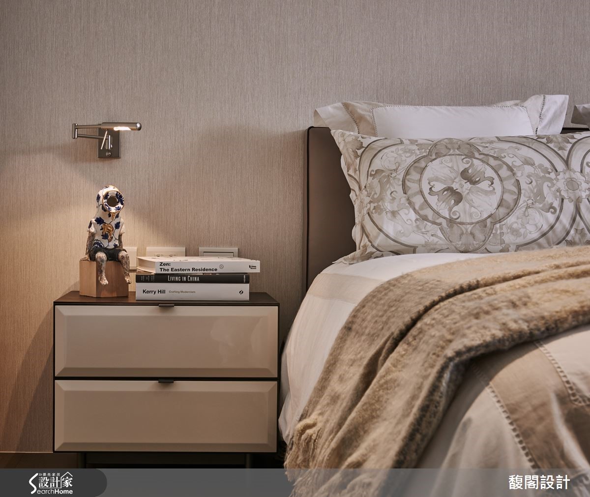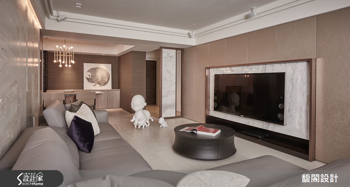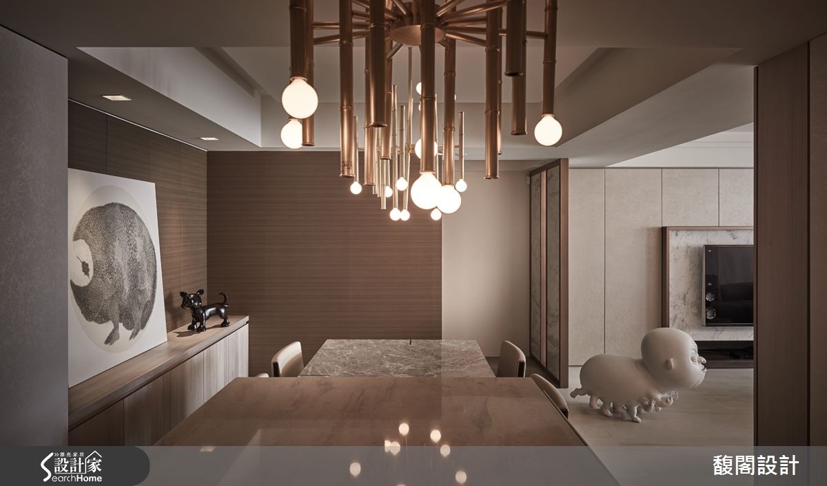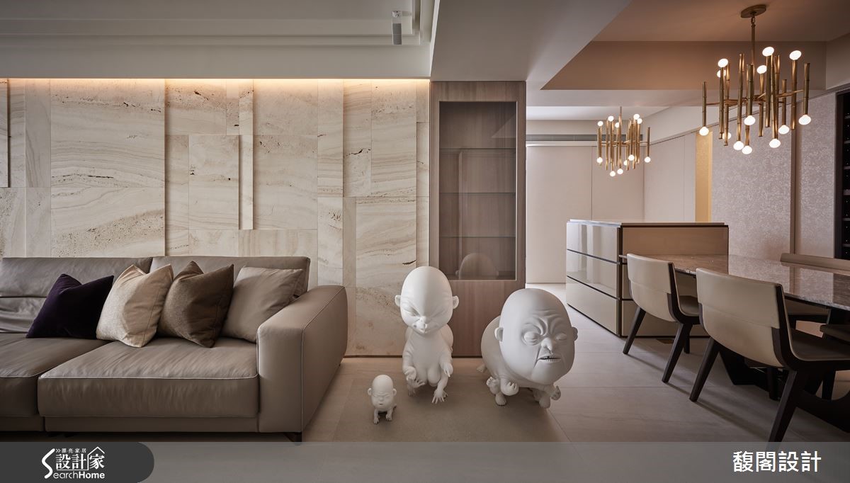 屋主喜爱低调奢华感,于是以米白色调及大地色系做为空间衬底,并点缀钛金、石材等元素,凸显出陈列艺术品的不凡格调,用一种"新古典ART DECO"的设计手法,打造出居家的独特气质。 【浅色石材搭金属家饰,造轻奢范】空间中以柔和轻浅的色调作为基底,采意大利超白洞石打造沙发背墙,做出进出面立体设计,让墙面充满丰富的层次。将横梁接合柜体作为客厅、餐厅的中介点,于地面随意陈列艺术装饰品,赋予空间艺廊般的视觉惊喜。餐厅则悬吊造型灯饰,以金色调与垂坠感注入奢华气息。一旁墙面则以木质色彩铺陈,以延伸的细腻纹理作为背景,衬托边柜上方展示的画作与铜雕。寝卧则延续素雅温润的底调,于细节处点缀金属或镜面,调和出宜人的质感色彩。