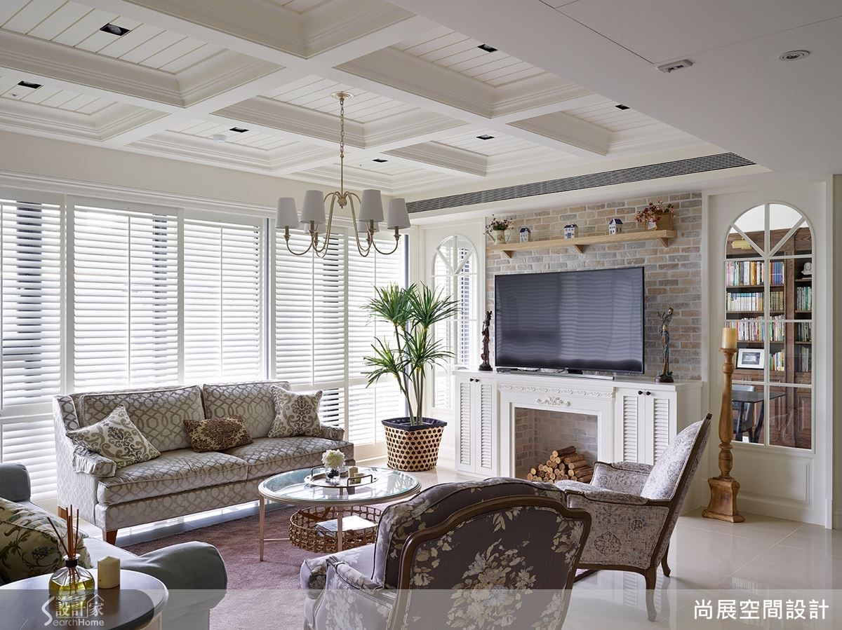 客厅采用文化石砖铺陈电视墙,并融入壁炉造型彰显美式韵味;同时天花板呈现图书馆式的格状设计,简洁有秩序的排列打造优雅质感,也让空间更显挑高大器。