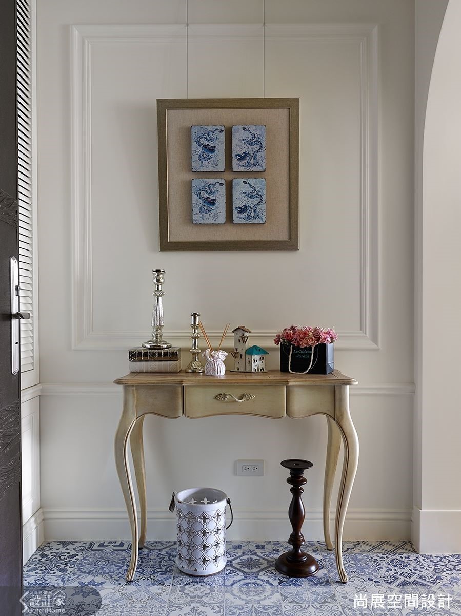 玄关处陈列一张古典桌几,搭配带有青花瓷之美的蓝色花砖,在简约中蕴含优雅韵味,入门就有好印象。并在一侧的客厅入口加上经典的白色欧式拱门,营造视觉美感。