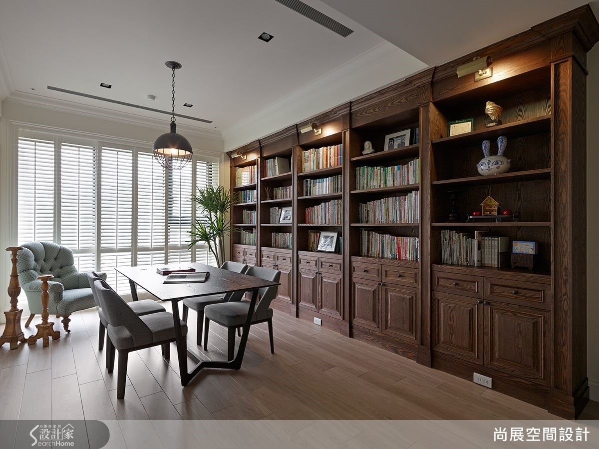 书房以全家人能在此共同读书谈天为设计主轴,打造宽敞开阔的空间。特别的是,采用如同欧美图书馆般的书墙,搭配壁灯点亮氛围,而深木色的运用让空间更沉稳,弥漫书香气息。