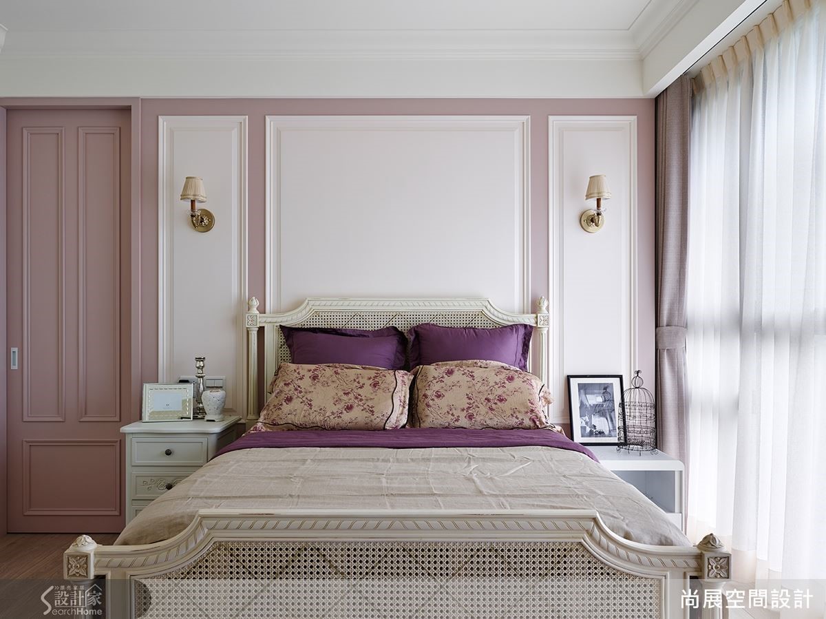 因应屋主喜爱莓红、葡萄酒紫等色系,特地在主卧墙面添入讨喜的莓紫色,搭配白色线板的对称设计,平衡端庄的床头画面。同时四件套采用深紫色呼应,注入温柔气息,营造少女般的梦幻氛围。
