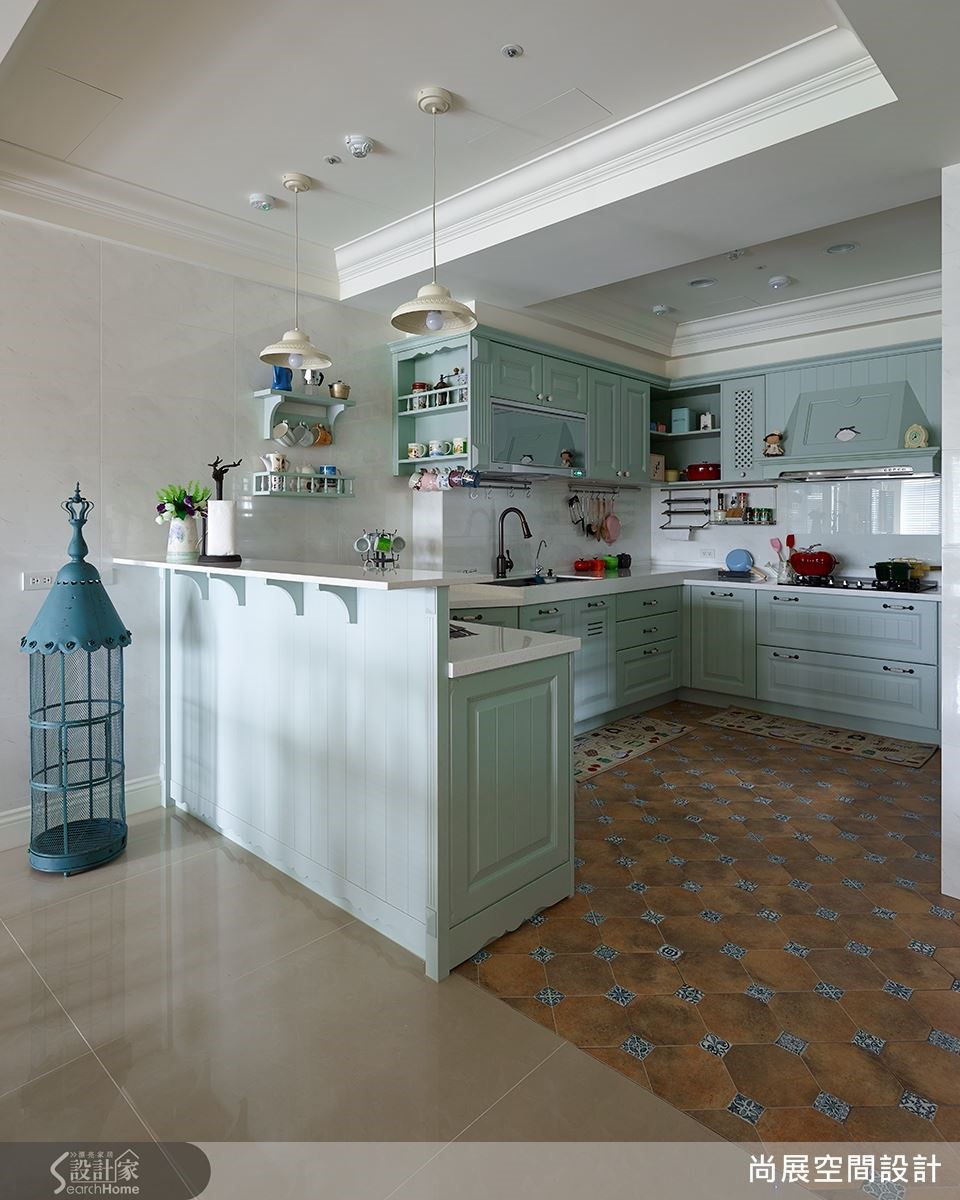 开放厨房以清新湖水绿替厨具定调,搭配上复古红砖,展现优雅的清新质感。而柜门的造型也多做琢磨,铺陈线板之外,也加上梯形的油烟罩,带出优雅的乡村气息。