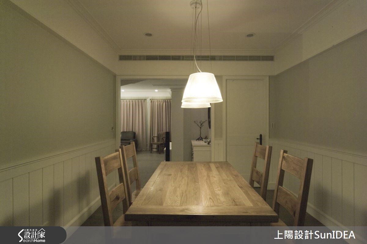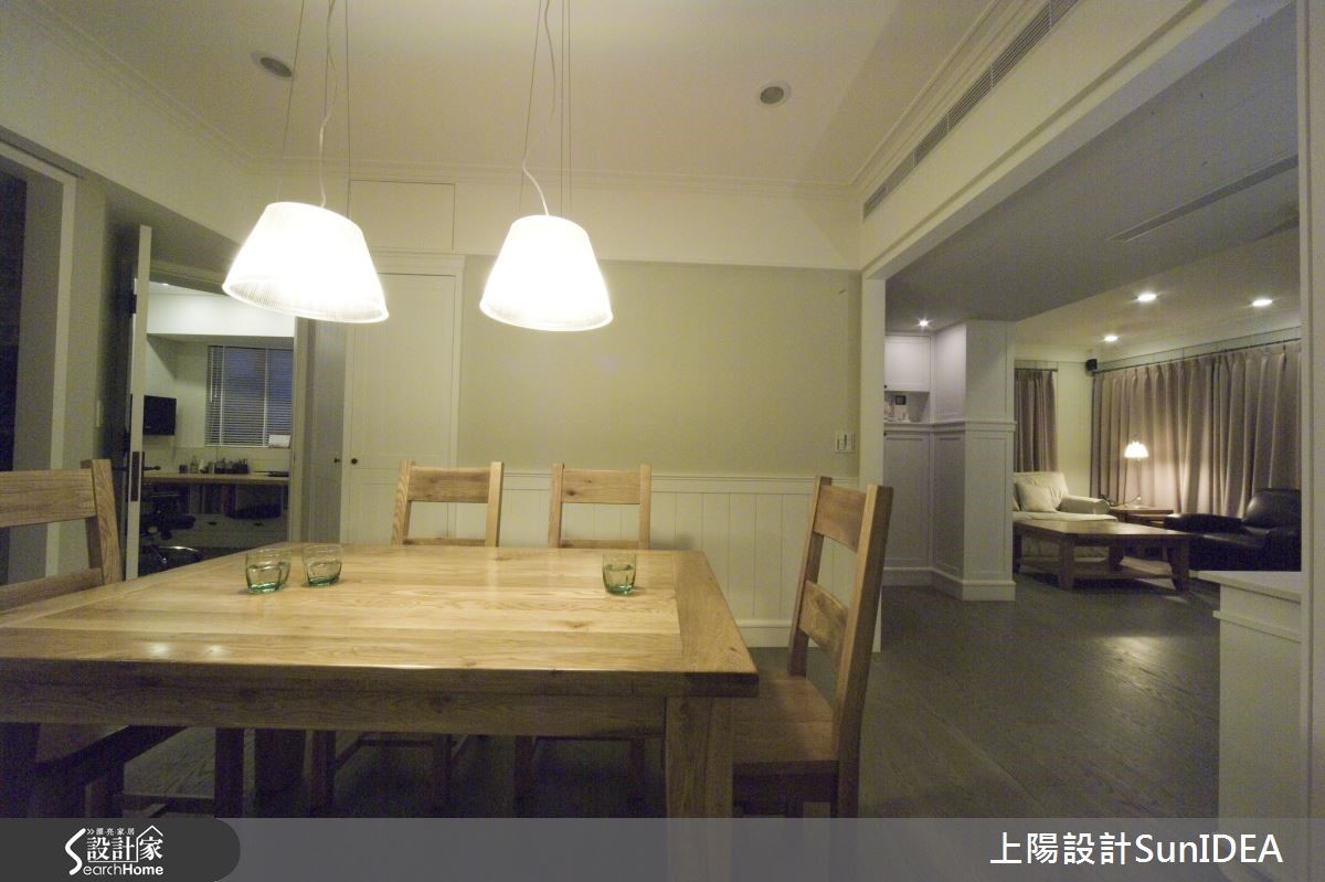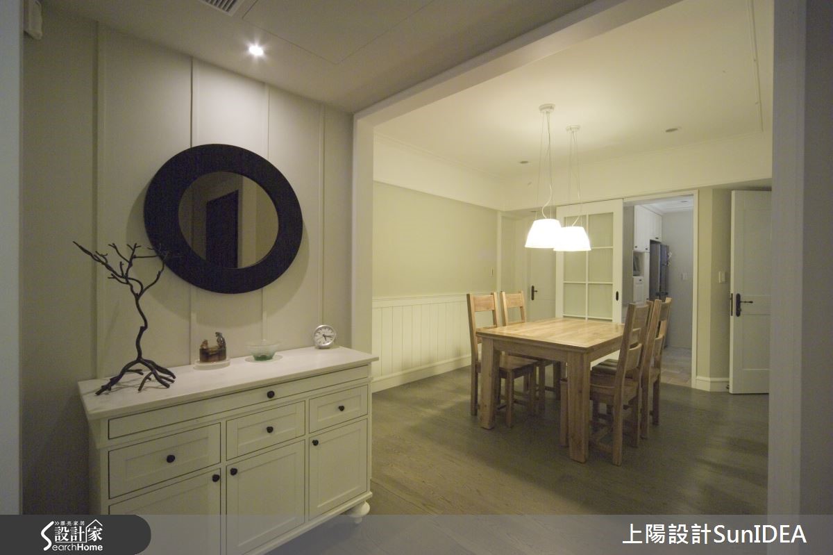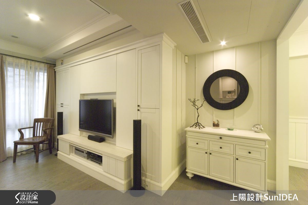 经典简约的美式居家,毫无多余的缀饰设计,利用优雅线板与无瑕色调,为一家三口构筑地道美式生活,设计师利用照明巧思,让纯白色彩在明暗之间产生不同风情,为单纯色彩注入灵活生命力!【优雅线板,创造美型收纳机能】双层落地窗帘兼具隐私与透光机能,线条优雅的线板电视墙刻意与墙面隔出厚度,创造隐形收纳机能,同时不失美型外观。电视墙旁的古典三层柜与圆形镜面,成为居住者进出玄关与客厅的缓冲区域,身兼收纳与仪容整理的任务,同时也是开放式客厅与用餐空间的过道。【实木与光线搭配营造美式温馨风情】独立用餐空间是居家中心,实木桌椅搭配晕黄光线,营造温馨气息。注重小细节的设计师,连书房及浴室格柜皆雕琢美式线条,尤其浴室天花的木板铺排更带有些许美式自然风情;主卧呈现整洁简约的氛围,利用单纯色调为居住者打造舒适放松的睡眠时光。
