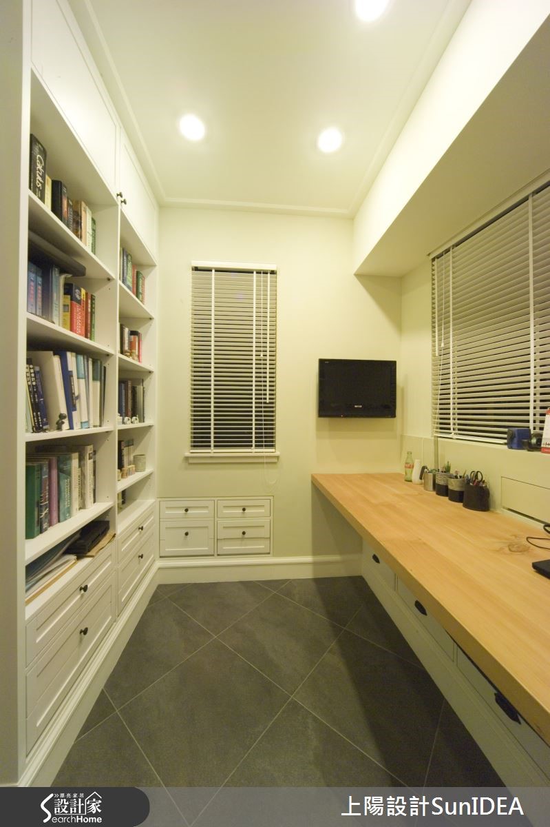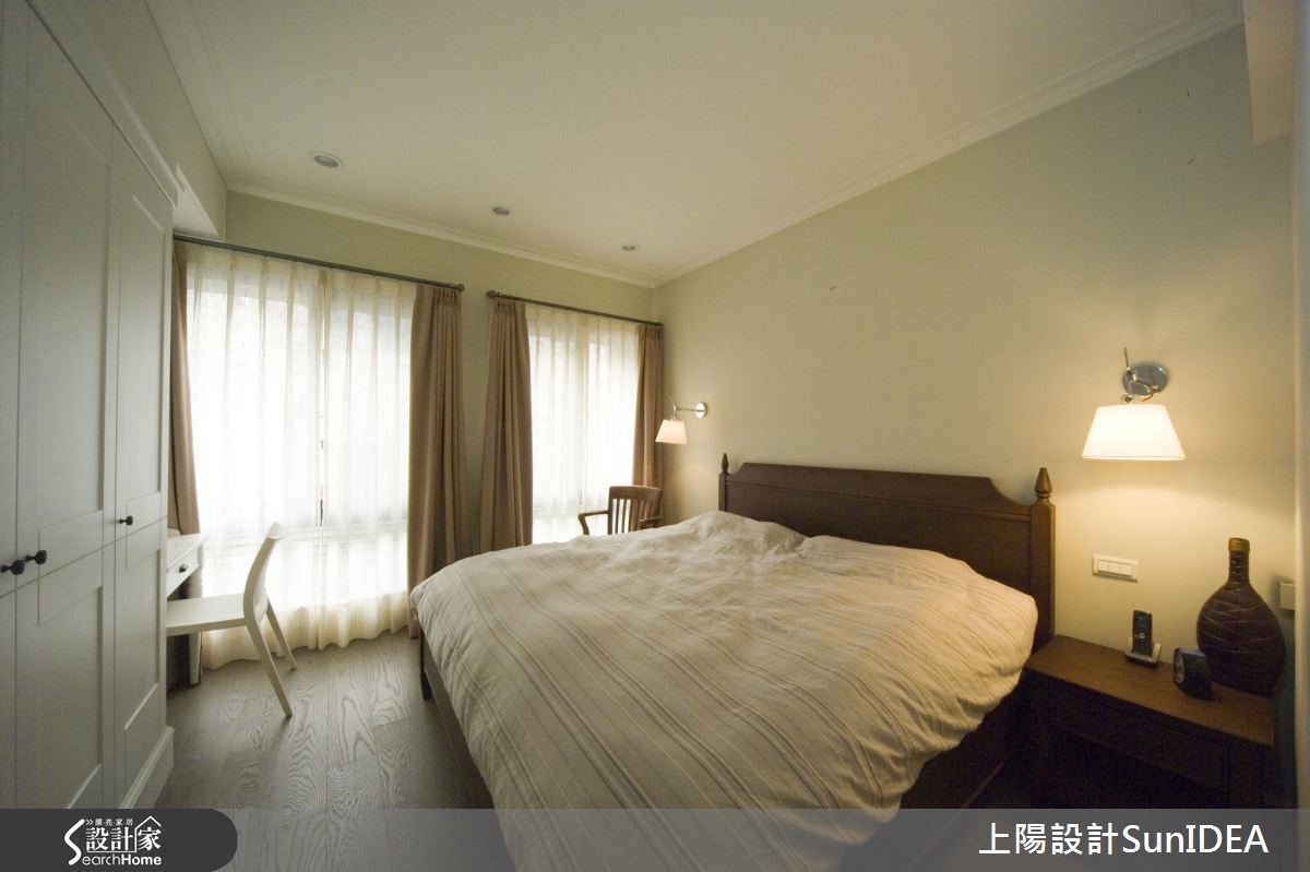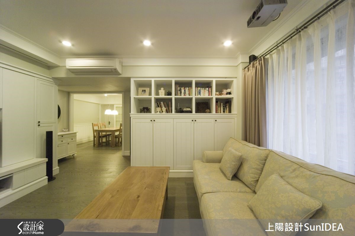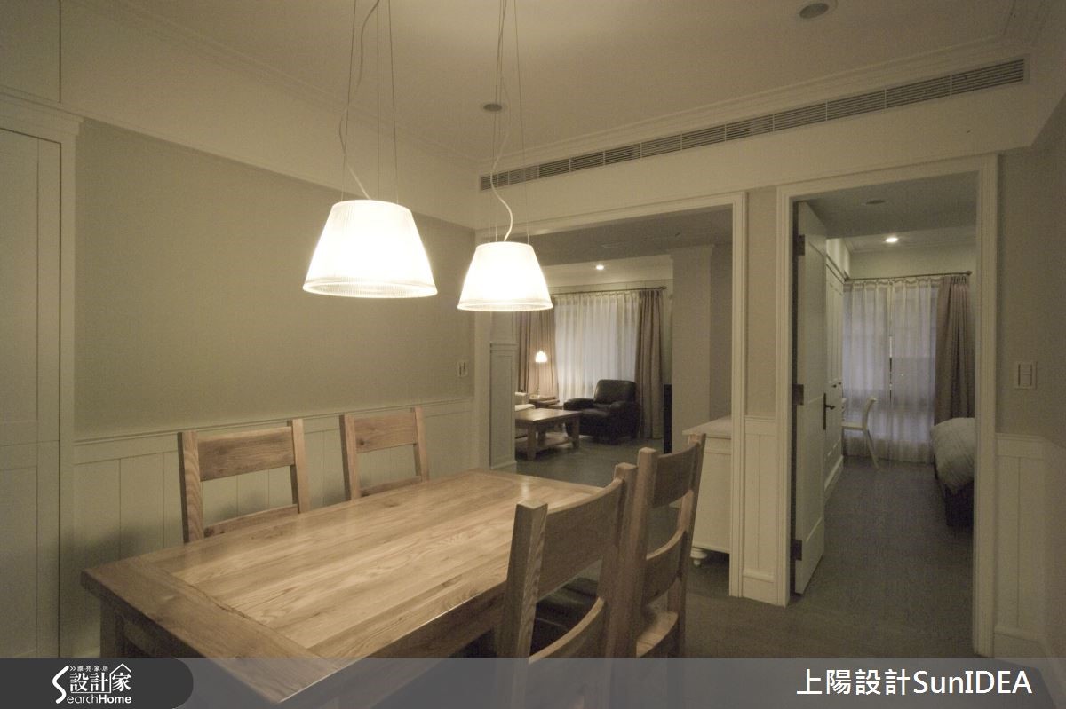 经典简约的美式居家,毫无多余的缀饰设计,利用优雅线板与无瑕色调,为一家三口构筑地道美式生活,设计师利用照明巧思,让纯白色彩在明暗之间产生不同风情,为单纯色彩注入灵活生命力!【优雅线板,创造美型收纳机能】双层落地窗帘兼具隐私与透光机能,线条优雅的线板电视墙刻意与墙面隔出厚度,创造隐形收纳机能,同时不失美型外观。电视墙旁的古典三层柜与圆形镜面,成为居住者进出玄关与客厅的缓冲区域,身兼收纳与仪容整理的任务,同时也是开放式客厅与用餐空间的过道。【实木与光线搭配营造美式温馨风情】独立用餐空间是居家中心,实木桌椅搭配晕黄光线,营造温馨气息。注重小细节的设计师,连书房及浴室格柜皆雕琢美式线条,尤其浴室天花的木板铺排更带有些许美式自然风情;主卧呈现整洁简约的氛围,利用单纯色调为居住者打造舒适放松的睡眠时光。