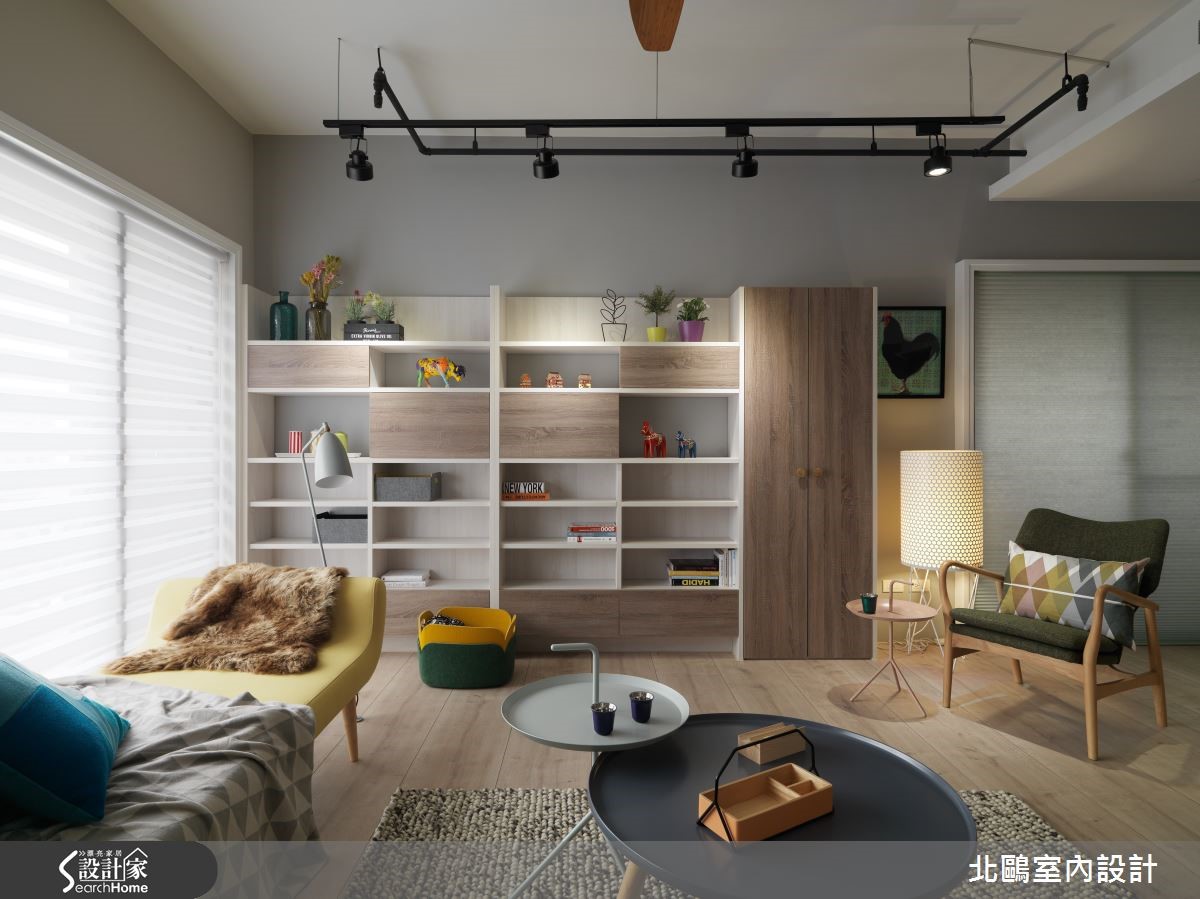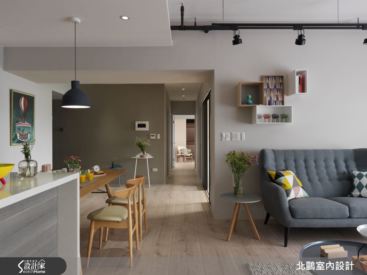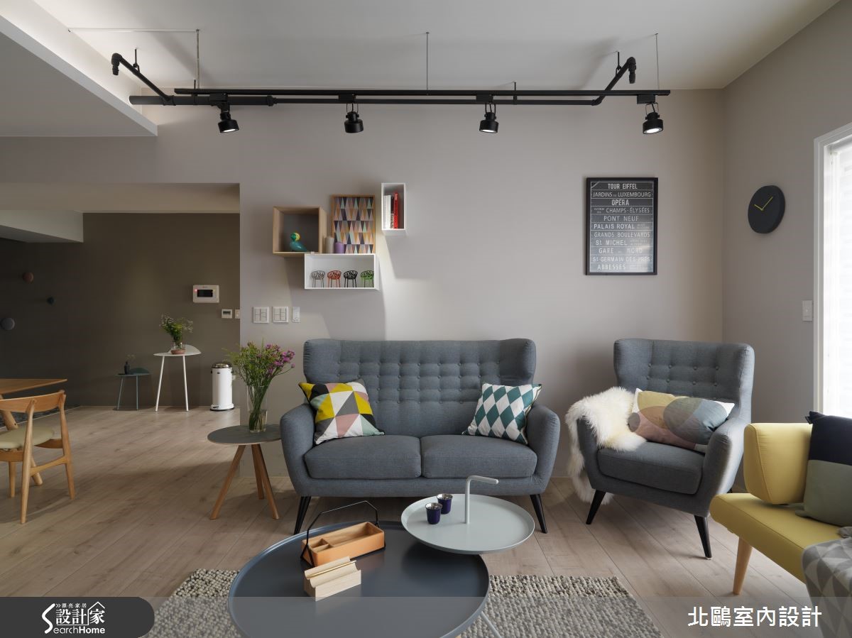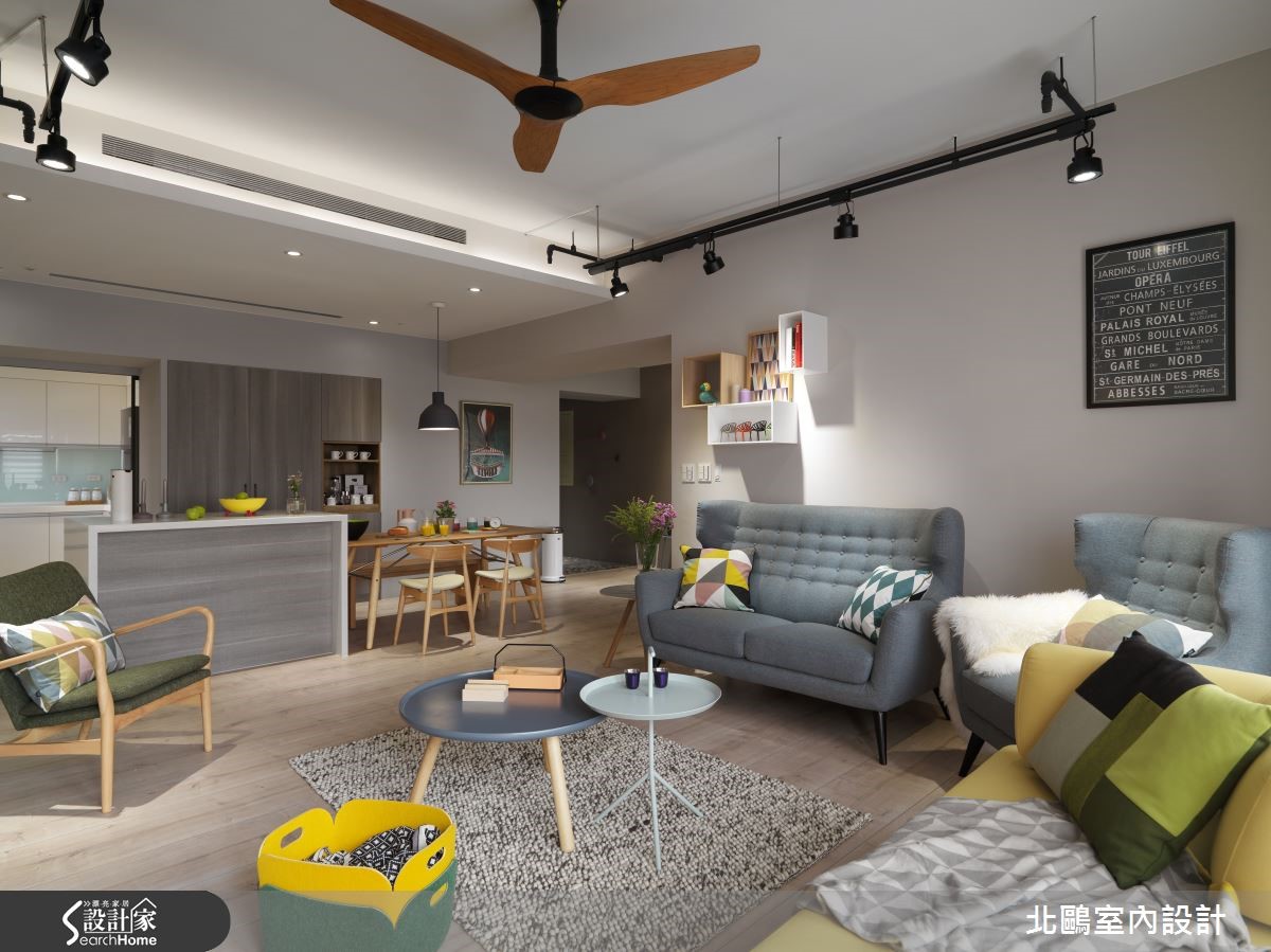 115平方米的住宅,以开放格局将一家四口的生活敞开,并纳入实用收纳机能,融汇自然的北欧风及摩登的家具,比如拉扣设计的蓝灰色沙发、亮黄色的贵妃椅;透过家具布置的巧思,塑造高雅品味的生活美学。【运用经典家具,创造空间亮点】进入室内后,玄关处铺饰复古花砖,并以黑玻镜面延伸空间感,引领进入主空间前的时髦开场。全室并以超耐磨地板铺成,木材质的自然温润奠定淡雅的北欧风基础。采光良好的客厅采用大面落地窗引进充裕光源,铁件轨道吊灯则在重点处加强照明。家具布置上,线条简约优雅的蓝灰色沙发,采用欧式贵族感的拉扣设计,增添知性的沉静氛围,并在落地窗前摆放贵妃椅,形成一处心灵角落。位于客厅后方的书房,以轻透玻璃移门与其他空间区隔,并保留生活互动感。整面背墙饰以文化石的温实触感,加上温润的浅色木质地板,让空间更具有北欧居家的温馨气息。厨房采用玻璃移门达到透光隔绝油烟的作用,外部则延伸中岛吧台及餐桌。餐厅处以柜体设计注入许多收纳机能,并将橱柜采用左右敞开的巴士门设计,相当巧妙地节省了门片开阖所需的空间。