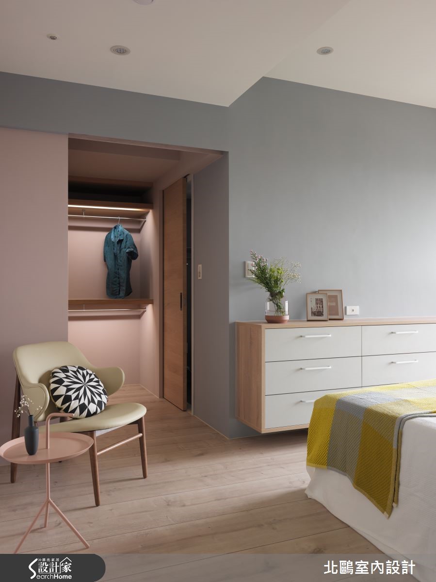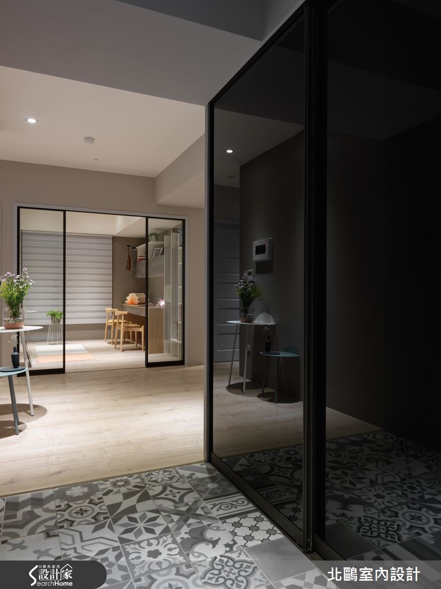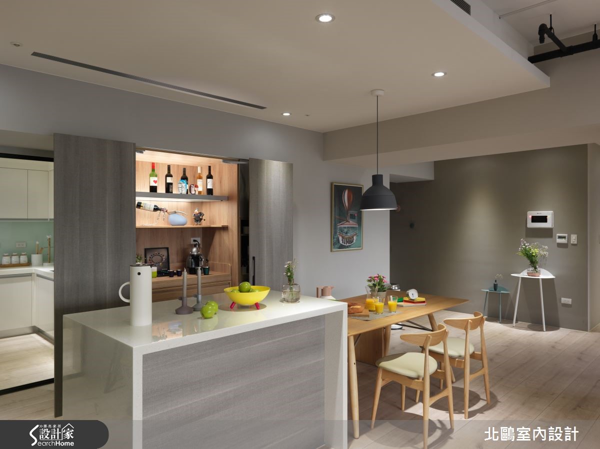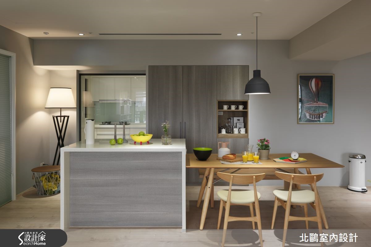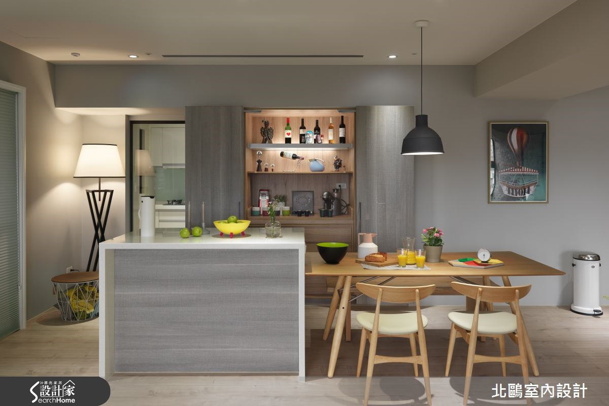 115平方米的住宅,以开放格局将一家四口的生活敞开,并纳入实用收纳机能,融汇自然的北欧风及摩登的家具,比如拉扣设计的蓝灰色沙发、亮黄色的贵妃椅;透过家具布置的巧思,塑造高雅品味的生活美学。【运用经典家具,创造空间亮点】进入室内后,玄关处铺饰复古花砖,并以黑玻镜面延伸空间感,引领进入主空间前的时髦开场。全室并以超耐磨地板铺成,木材质的自然温润奠定淡雅的北欧风基础。采光良好的客厅采用大面落地窗引进充裕光源,铁件轨道吊灯则在重点处加强照明。家具布置上,线条简约优雅的蓝灰色沙发,采用欧式贵族感的拉扣设计,增添知性的沉静氛围,并在落地窗前摆放贵妃椅,形成一处心灵角落。位于客厅后方的书房,以轻透玻璃移门与其他空间区隔,并保留生活互动感。整面背墙饰以文化石的温实触感,加上温润的浅色木质地板,让空间更具有北欧居家的温馨气息。厨房采用玻璃移门达到透光隔绝油烟的作用,外部则延伸中岛吧台及餐桌。餐厅处以柜体设计注入许多收纳机能,并将橱柜采用左右敞开的巴士门设计,相当巧妙地节省了门片开阖所需的空间。