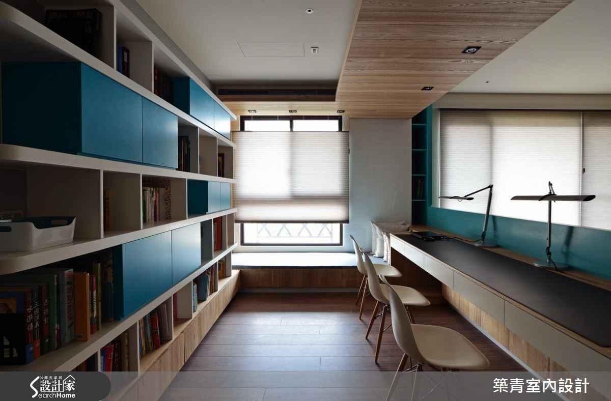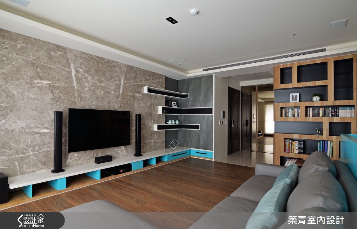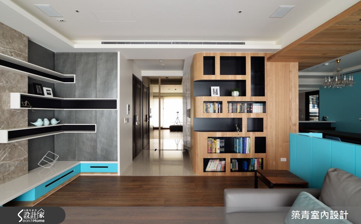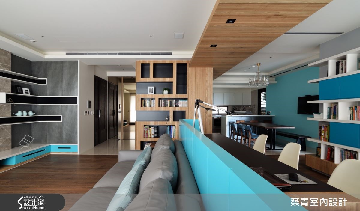 家中有三名活泼男孩的屋主夫妻,买下149平方米的新屋,并采用北欧风格为未来生活定调,融入明亮轻快的水蓝色,在木质和石材交织的自然静谧中,创造令人惊艳的视觉焦点。 【以转角柜整合储物与动线机能】蕴含大量收纳机能的玄关,在储藏间滑门上覆贴茶镜,利用镜面的映射效果延展景深。鞋柜门片使用白色钢琴烤漆,木质墙面将衣帽间入口藏于无形,并在客厅廊道处转换为开放式书柜,转角处采圆滑弧形设计,避免儿童因为碰撞而受伤。 设计师利用预售屋客变(客户变更;建设公司在施工阶段依照屋主需求,预先提供变更格局、设备等服务),退掉客厅后方的隔断,以开放式空间整合客厅、餐厨和书房,迎来更开阔舒适的生活空间。苏格兰灰石材的细腻结晶纹理,恣意蔓延在客厅电视墙面,侧边收纳柜门片覆上低调而具质感的铁灰色拓采岩,黑白层板展示格将两者在视觉上完美衔接。少了隔断的拘束感,客厅后方的开放式书房将视野展开,让大人能随时注意到孩子的活动状态。天花梁体以木材质包覆,随着直角转折向后至书房背墙,在临窗处向下延伸变成具收纳机能的飘窗,成为舒心自在的一隅。
