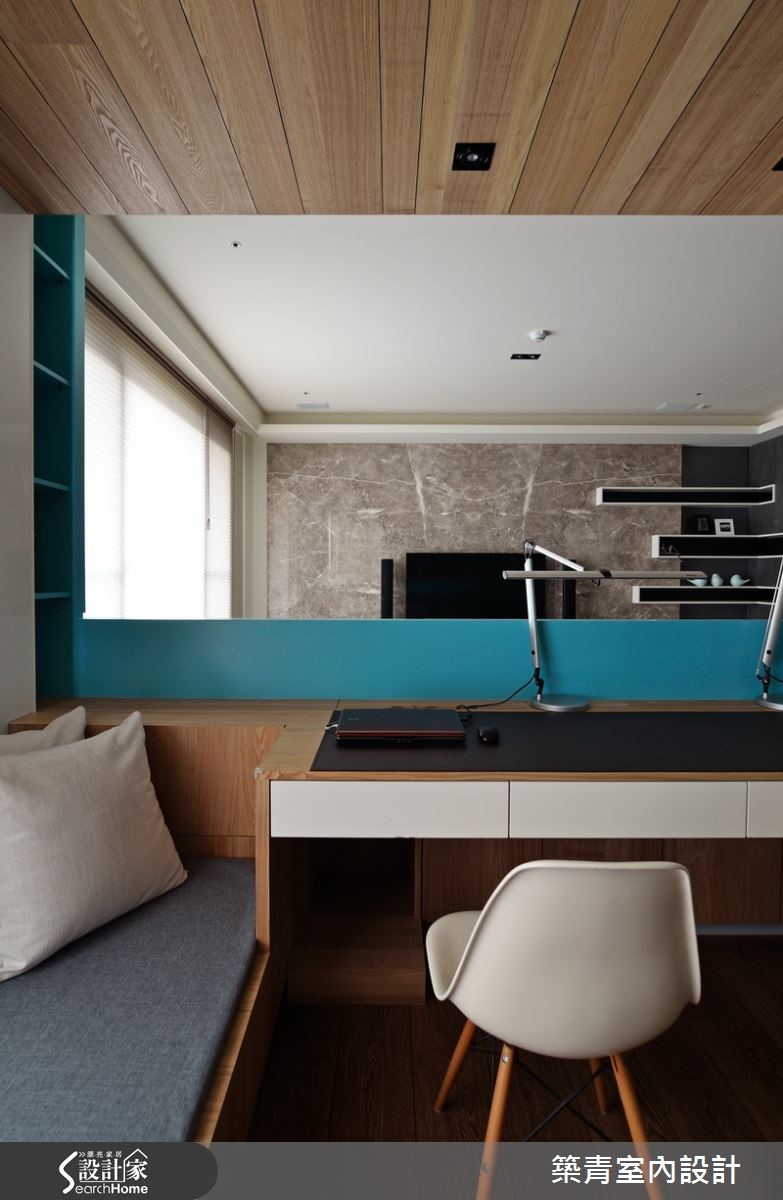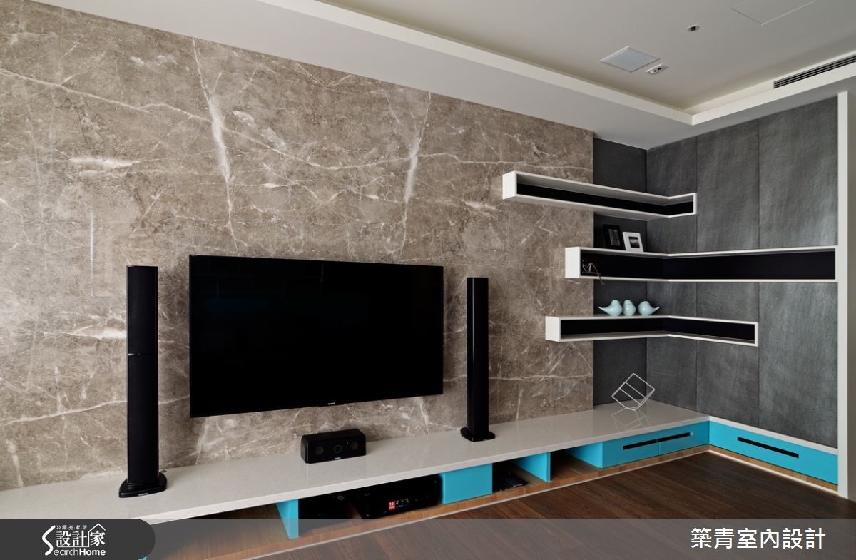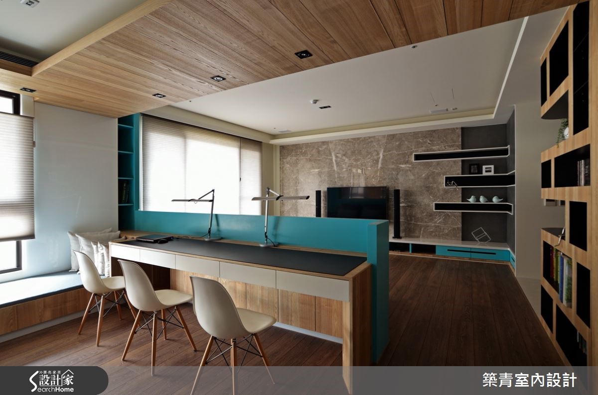 家中有三名活泼男孩的屋主夫妻,买下149平方米的新屋,并采用北欧风格为未来生活定调,融入明亮轻快的水蓝色,在木质和石材交织的自然静谧中,创造令人惊艳的视觉焦点。 【以转角柜整合储物与动线机能】蕴含大量收纳机能的玄关,在储藏间滑门上覆贴茶镜,利用镜面的映射效果延展景深。鞋柜门片使用白色钢琴烤漆,木质墙面将衣帽间入口藏于无形,并在客厅廊道处转换为开放式书柜,转角处采圆滑弧形设计,避免儿童因为碰撞而受伤。 设计师利用预售屋客变(客户变更;建设公司在施工阶段依照屋主需求,预先提供变更格局、设备等服务),退掉客厅后方的隔断,以开放式空间整合客厅、餐厨和书房,迎来更开阔舒适的生活空间。苏格兰灰石材的细腻结晶纹理,恣意蔓延在客厅电视墙面,侧边收纳柜门片覆上低调而具质感的铁灰色拓采岩,黑白层板展示格将两者在视觉上完美衔接。少了隔断的拘束感,客厅后方的开放式书房将视野展开,让大人能随时注意到孩子的活动状态。天花梁体以木材质包覆,随着直角转折向后至书房背墙,在临窗处向下延伸变成具收纳机能的飘窗,成为舒心自在的一隅。