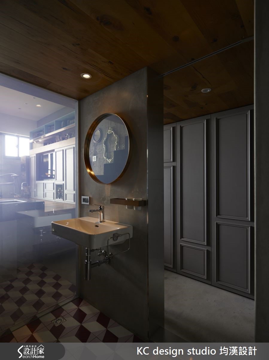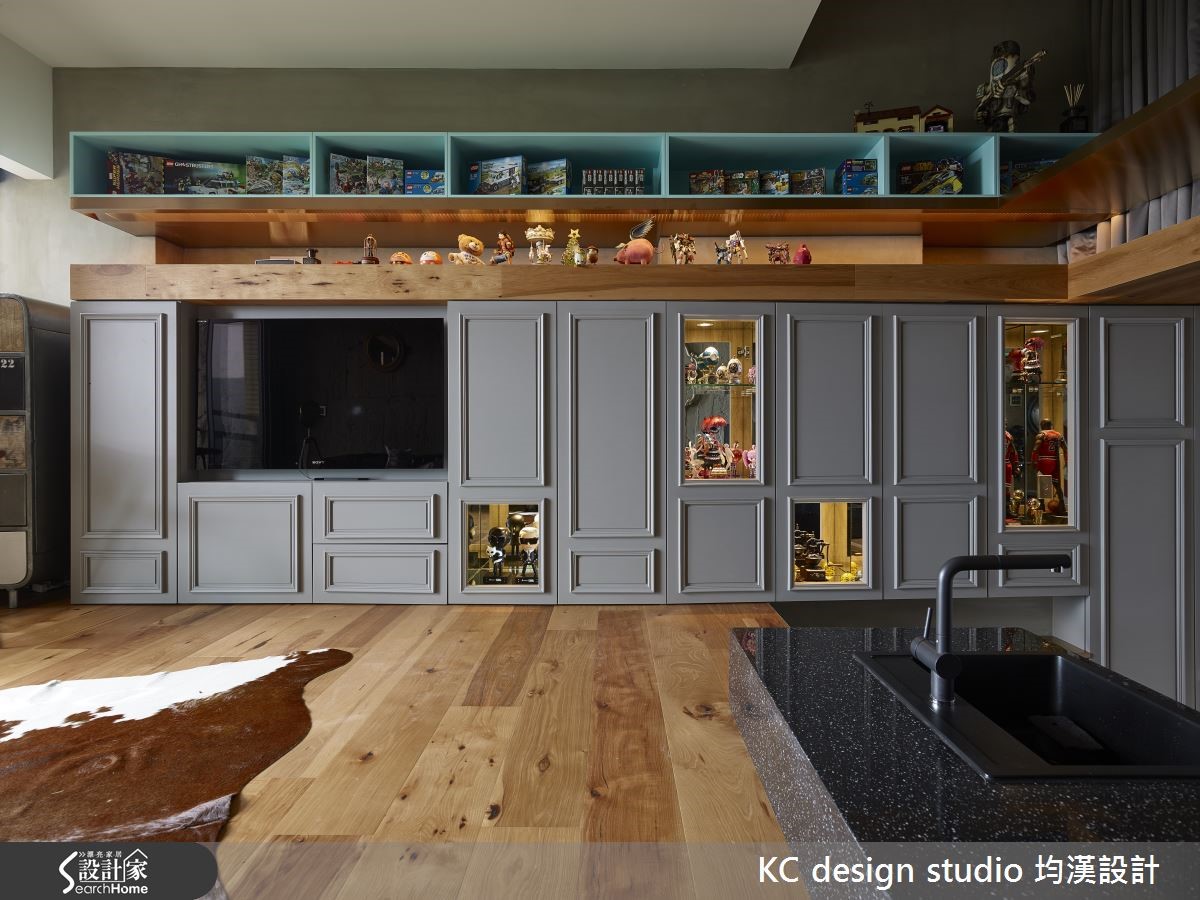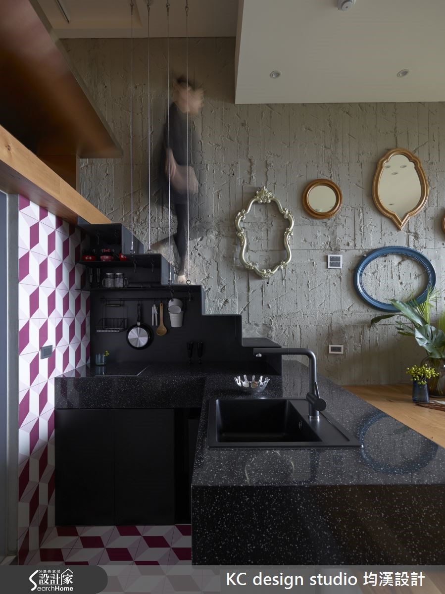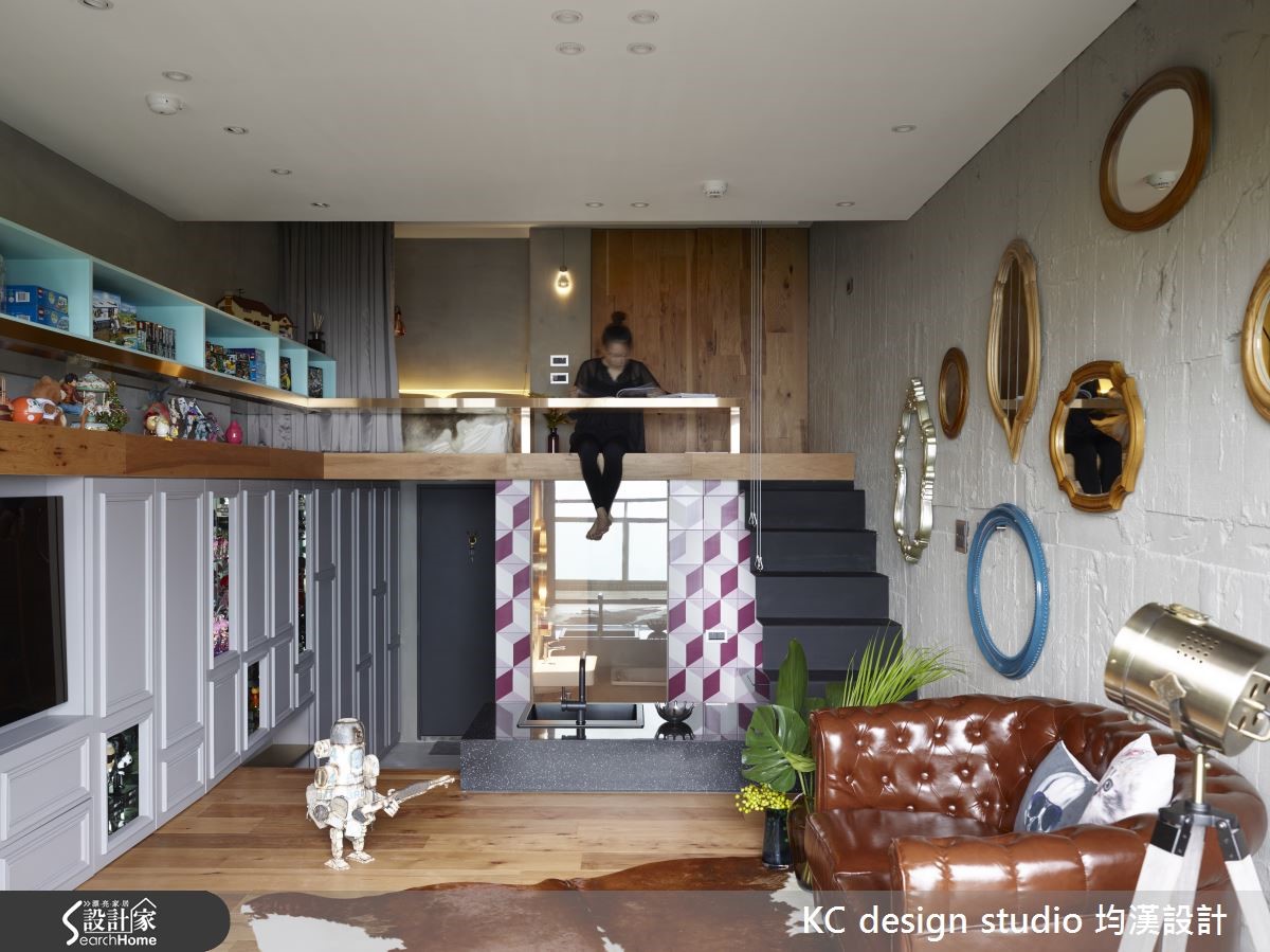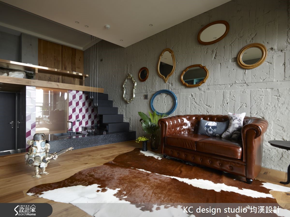 位于靠海的50平米跃层,屋主从事平面设计及流行服饰业,平时喜欢搜藏公仔及乐高,设计师结合屋主喜爱的loft混搭风格,创造有型的展示收纳空间,让原本采光、通风不佳的中古跃层,变身为极具个性魅力的潮流宅! 【柚木混搭水泥墙冲突美】进门之后,墙面铺叙玫紫色花砖堆栈立体层次,营造活泼亮眼的入口开场,接着踏上优雅金色台阶,引领动线前往客厅,地面铺设柚木地板,粗犷印象的水泥墙与冷灰色古典线板相对,形成强烈视觉对比。【古董收藏率性收纳柜】壁柜镶嵌参差错落展示格,收藏屋主的搜集品,并辅以镜面反射,更延伸空间深度,再置入屋主私人收藏的古董家具家饰,便成为一方舒适又时髦的所在。 沿着简约黑色阶梯向上则是卧室空间,扶手以香槟金镀钛材质融入精致的金属元素,上方并特别设计为宽面平台,兼具书桌的阅读机能,也可以是随手涂写的灵感天地。