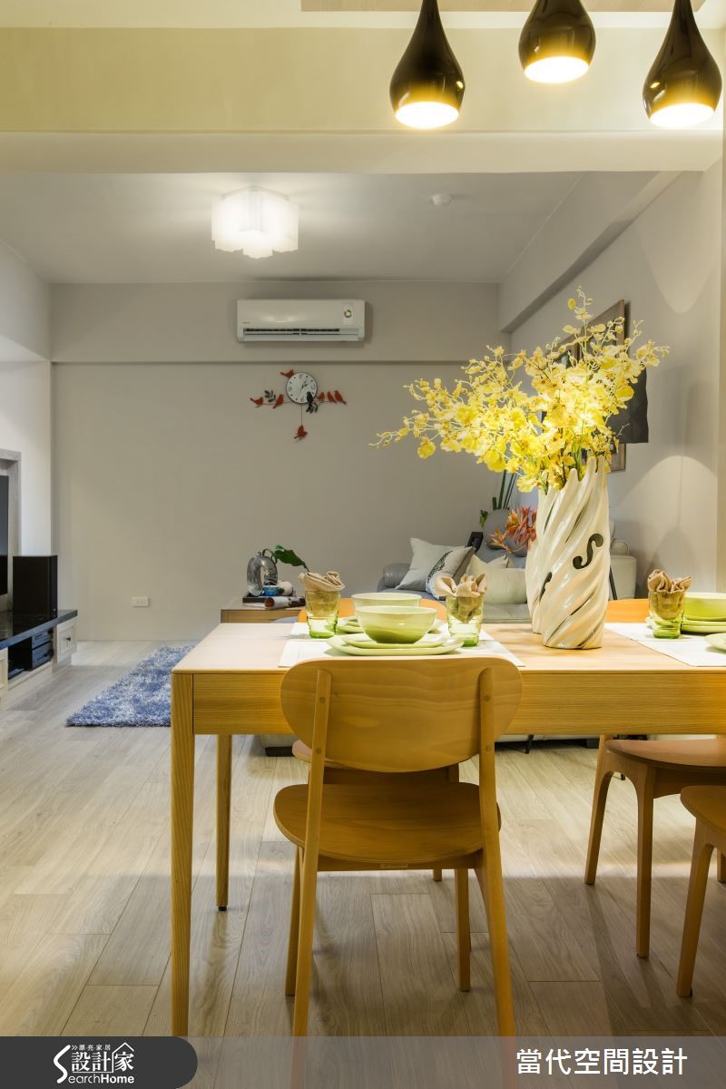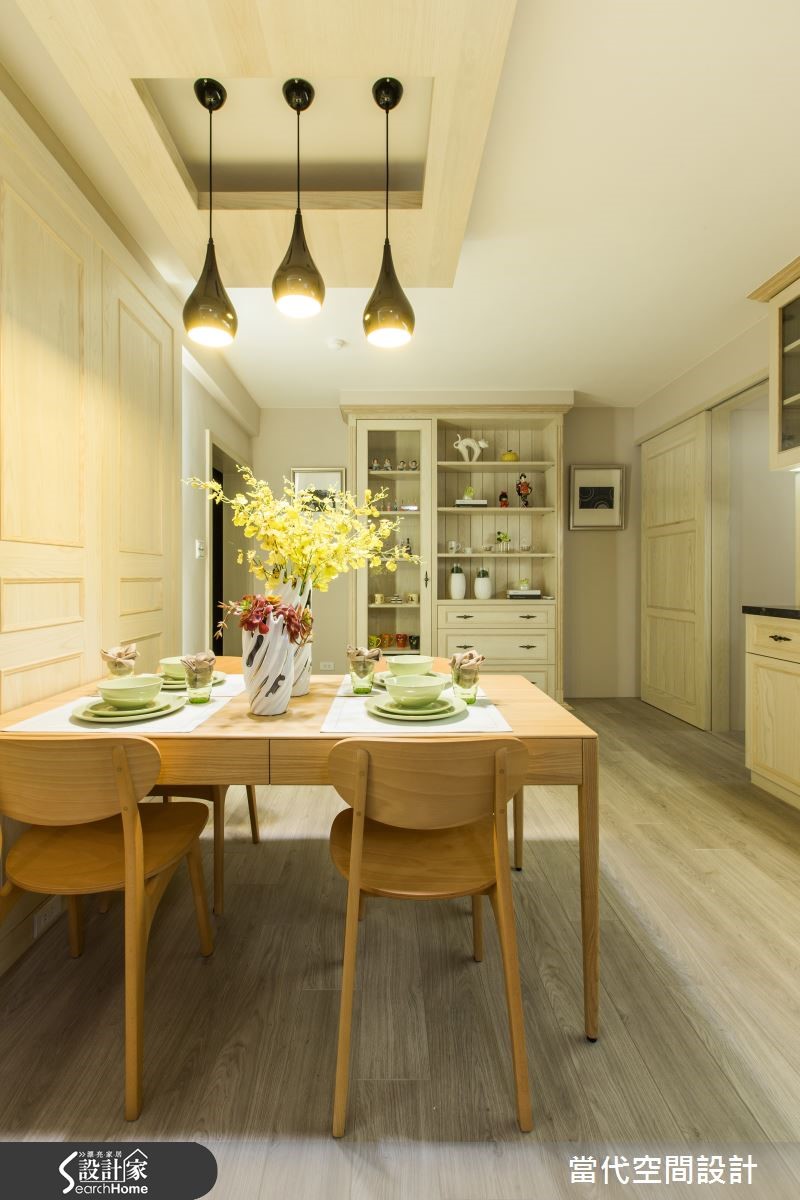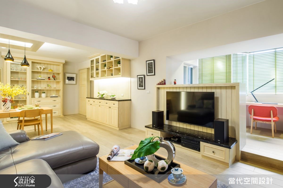 86平米老屋以乡村风为设计重点,清新舒适的浅柔色调,为3室2厅带来无压温馨感,设计师将原有格局稍加调整,创造出孩子的快乐游戏区,另外也赋予实用收纳机能,迎接一家3口的新生活! 【双面柜不做满有效达到扩容效果】开放式设计解开空间拘束感,展开宽阔视野范畴,浅木色地板提升整体明亮度,为室内铺叙柔和底衬。客厅处伫立一道双面柜体,分别作为电视柜及儿童游戏区柜用途,后方地坪架高自然划分领域,电视柜不做满的设计,留下让光线自在流淌的弹性。 【乡村风格餐厅,充满温馨感】餐厅设置餐边柜和吊柜,柜体门片饰以典雅线板,隐约可见的木纹肌理,汇入自然气息,流露低调而温馨的乡村氛围。设定在及腰高度的柜体,更加方便物品的放置与拿取,餐边柜台面选用相当具有质感的黑金锋大理石,提点出视觉重心,也不容易有吃色问题。