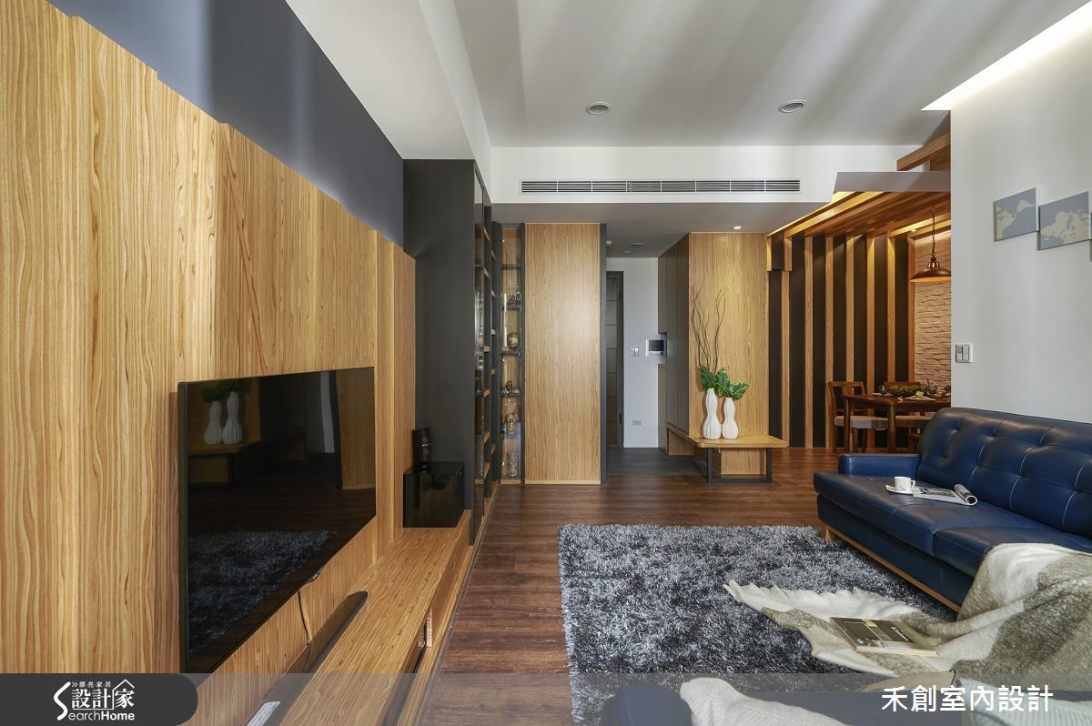 屋主喜爱不奢华的风格,于是以休闲风格型塑这132平方米的住宅。考虑家有宠物,将原先石英砖地板更换为木地板,并融入大量木作收纳,辅以软装与光影映衬,打造出美好的生活景象。 【嵌灯轻化柜体,木条拉高视觉】客厅在天花配置嵌灯,使格局显得利落简练,电视墙则采以浅色木质打造,加入垂直线条做出立体表情。雅致的深蓝沙发与空间木色成对比,佐以间接灯光投射的带状光影,增添视觉上的细腻层次。电视墙旁以黑玻结合木作层板规划展示柜,内嵌灯光让柜体更形轻盈。餐厅有大梁横亘压迫,采木作格栅作修饰,让线条自壁面延伸向上拉高空间视野;搭衬白色文化石墙面,营造温馨的用餐氛围。主卧收纳充足,于靠窗处还规划书桌与飘窗,让空间更清新闲适。