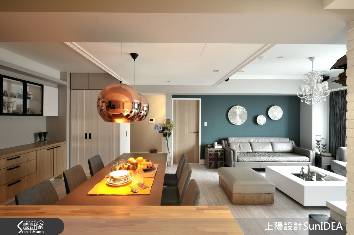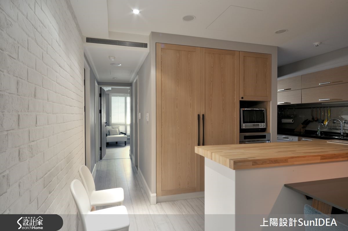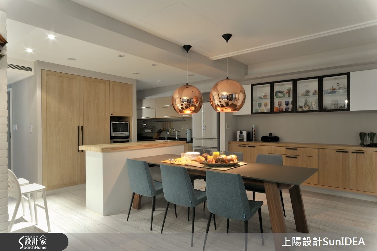 设计师替132平方米居宅加入北欧风格,以白色底调营造雪国般的优雅印象,搭配一墙森林苍绿,并加入木质素材挹注暖意,营造浪漫想象。【纯白基底,营造雪国般浪漫气息】以落地窗纳入明亮采光,映照在纯白底调的文化石墙,使空间多了知性品味,并于沙发背墙铺述浓郁绿底,加入金属装饰画龙点睛,呼应北欧自然的原味气息;餐厅则于柜体、吧台等处加入木质调,型塑温暖感受,并于天花上方悬吊金色圆型灯饰,制造聚焦的视觉效果。【墙面铺陈,建构温馨空间氛围】主卧在床尾规画整排衣柜,赋予大量的收纳机能,右侧角落结合梳妆台,有效利用立面空间,并藉由花色墙纸延续大地风情,展现春夏的温暖活力!次卧为格局不甚方正的畸零空间,以浅绿色铺述墙面,缓解视觉狭隘感,并加入大片百叶窗设计,瞬间建构温馨的空间气氛!