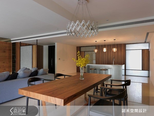 屋主选择在老家买下这间新成屋,主要作为逢年过节时回家的度假居所,考虑屋主喜爱木头带来的温暖及放松氛围,加上不爱华丽的装饰,于是设计团队便以木头为概念发想,寻找多种木材来互相搭配,表现自然纾压的居住气氛。【多元拼贴手法,彰显丰富层次】雾面玻璃搭配实木材质为屏风,异材质的结合也能展现协调美感。进到开放式客餐厅,空间动线流畅且宽阔,在简约大器的架构下,电视、餐厅主墙以厚实木墙构筑,水平、垂直的拼贴手法具丰富层次,搭配明亮采光条件,增添温暖的生活温度。【树枝造型装饰,增添童趣感】往内走至卧房空间,床头主墙改为采取浅色且鲜明的木纹铺饰,柜体部分则改为深色稳重的木材,小孩房则巧妙利用木材打造树枝造型装饰,同时也是趣味的书架,透过不同木纹的肌理质感,散发出来的自然疗愈,让家成为合宜的度假天堂。