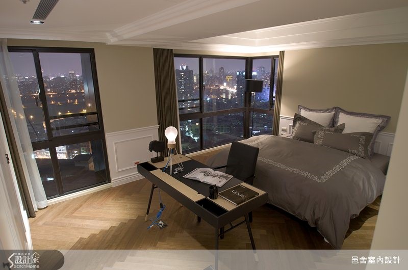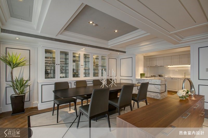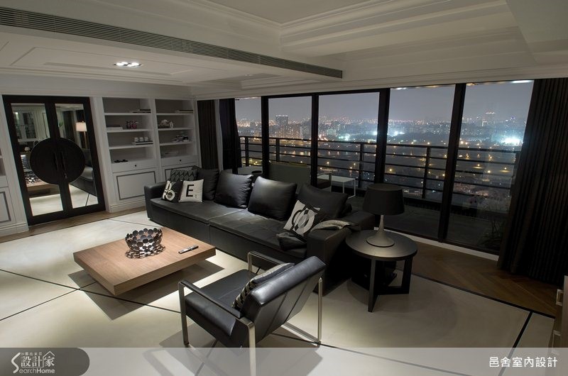 本身从事设计的屋主对于美学有着十分独到的眼光,希望拥有大面开窗、视野辽阔的居家空间,邑舍设计于是将原有的430平方米4室的格局重整,让公共空间内外连成一线,创造开放而通透的居宅。【全方位落地窗与室外景色相连】室内每一处几乎都拥有对外窗景,其中宽敞华丽的户外露台,更以穿透式天花板的设计,白天享受阳光洒落,夜晚看尽繁星点点。而室内在自然光线的移动之下,无论清晨、午后、落日、深夜,每时每刻都能拥有不同的风光,仿佛置身于缩时电影的场景。呼应露台磅礴豪气的格局,客厅居宅的大器氛围则不遑多让。客厅与餐厅为一字型动线,让公共空间更为集中,并以新古典元素为主轴,加入了金属现代感,透过玻璃、烤漆和大理石的混材结合,让空间中的每一墙每一地,都带着细致与质感。而为了创造空间的宽敞无压,特别将四室减成两室,让格局变得单纯,也让公共空间更为宽敞明亮。原先的客房作为更衣室与主卧串联,格局并调整成二进式,让主卧室保有隐私。考量屋主喜欢新古典风格,设计师在天花板上做了细腻的沟缝设计,不仅修饰了大梁,也让空间充满层次,呈现华丽的古典质感,整体空间也以黑、白、灰色为主色彩,让空间视觉更为典雅。