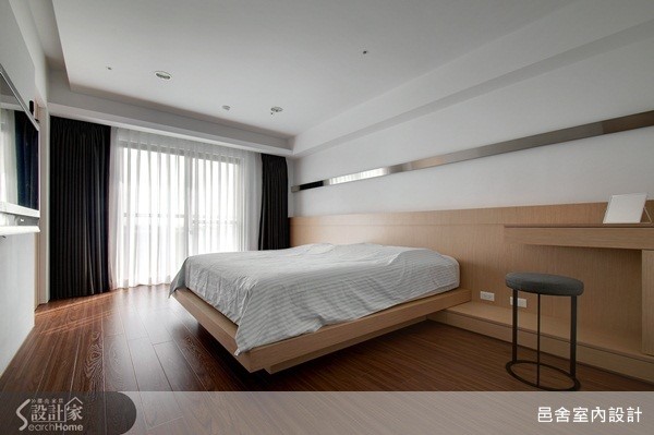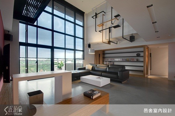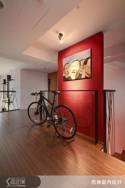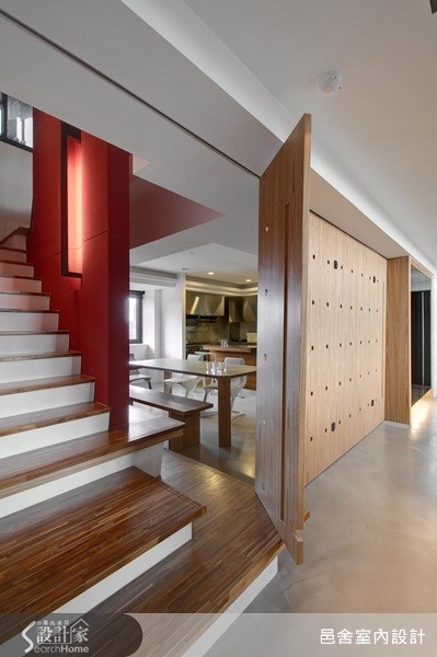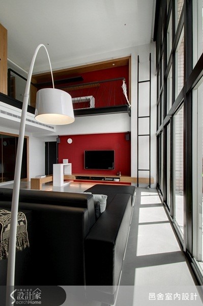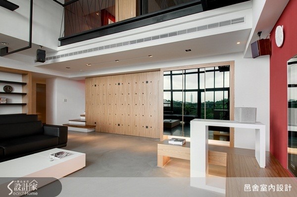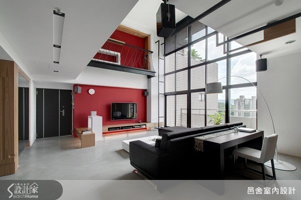 拥有得天独厚的挑高复式楼总是为家带来了梦幻想像,设计师运用简单的红、黑、白及原木色,无限的排列组合,每一个角落都有戏,轻轻松松把窗外景致揽进屋里,毫无招架力的爱上这里。【黑白红三色,创造无穷变化】这座屋宅巧妙布局舒适的居住动线、便利的生活机能;透过别出心裁的黑色方框窗棂,毫不拖泥带水的把室外窗景裁剪最自然的拼贴画,无论白昼晨曦、黄昏夜晚,都是与室内百搭的美景。空间仅以黑、白、红三种原色,搭上原木材质,用方框、方体的方棱线,构筑了整个室内视觉,看似单纯却是变化无穷;挑高墙面巧妙运用横直交错的造型支架,拉长了上方空间。木墙近楼梯处的暗门内其实别有洞天,设计师把餐厨区域包在这里,简化了客厅空间,也让用餐不受干扰;拾级而上的过程可以察觉到光线的变化,然后惊讶于上方空间也藏有俏皮复古的兴味。