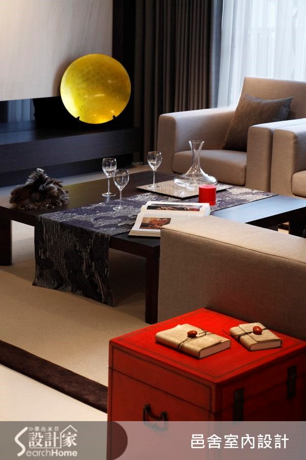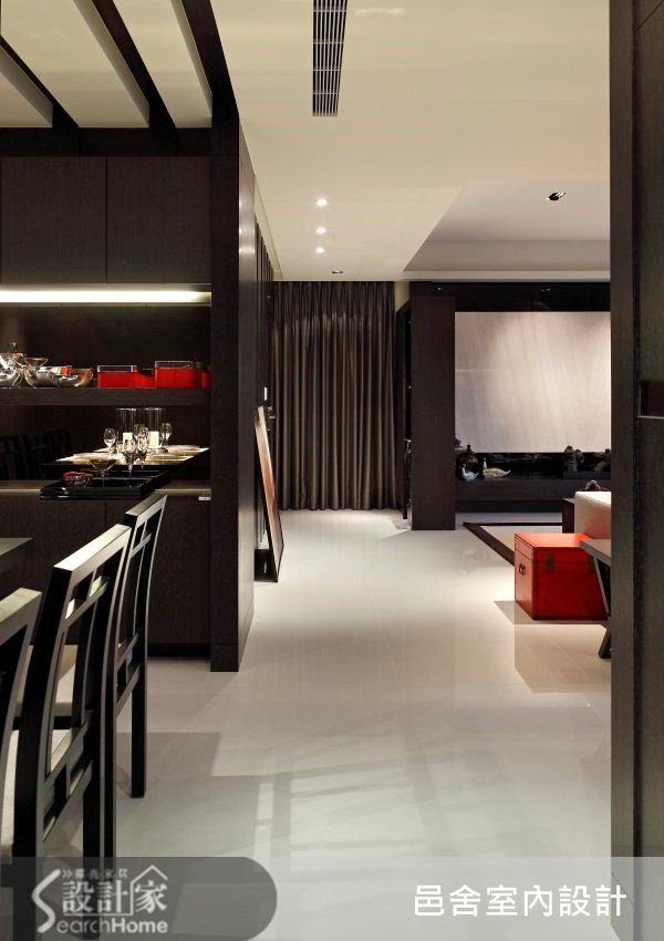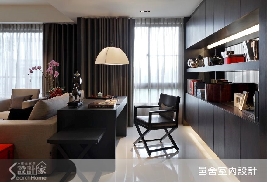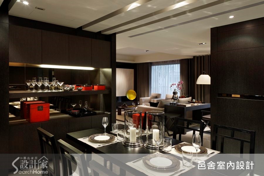 这户106平方米居宅,一入门透过厚实沉稳的深色木皮铺陈墙面,大面积的运用凝塑入门印象,营造迎宾的大器风范。再搭配经典品牌的家具家饰点缀其中,立即感受稳重高雅的不凡品味。【同质不同色,呈现视觉层次】纵深较长的公共区域不浪费一丝空间,运用沙发巧妙分隔出客厅与书房,型塑秾纤合度的空间比例,也隐晦暗示空间的过渡分界。搭配经典品牌的沙发和家饰,精致细腻的织品,在细微处展现主人的优雅品味。开阔的客、餐厅将动线连成一气,流畅的行走动线能够优雅不受拘束的悠游其中。书房柜体则适时发挥实用机能,提供充足的收纳量,柜体选用和壁面相同色系,营造一体视感;同时下方辅以灯光,创造悬浮轻盈感受,避免深色柜面带来的压迫。转入餐厅,能立即看见细长天花的整齐排列,同时灯具内嵌,将照明机能与造型合为一体。细长线条从天花延伸至柜面,让视线连成一线,创造延伸视觉,一致的造型形成餐厅的美丽风景。