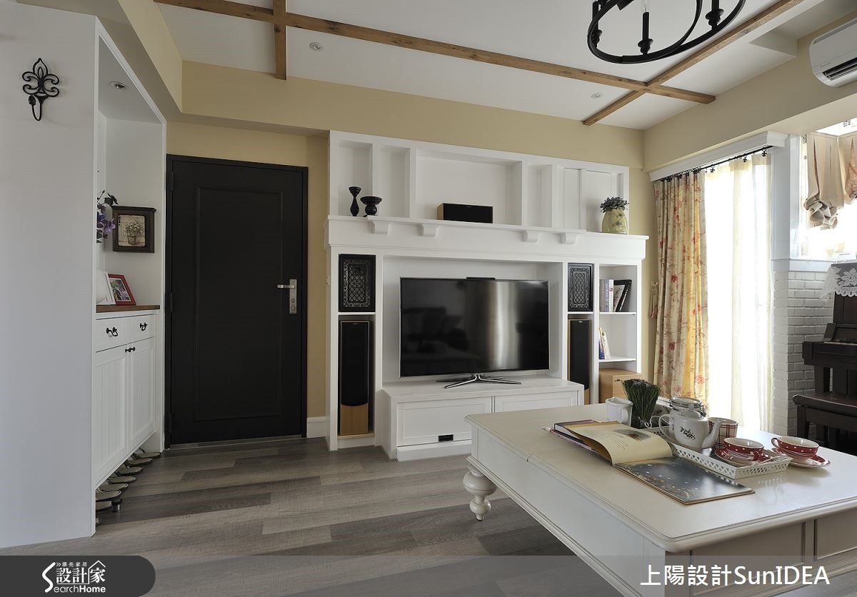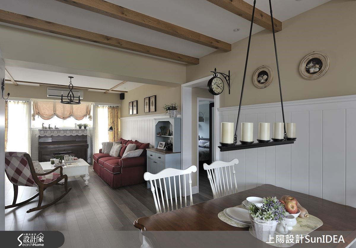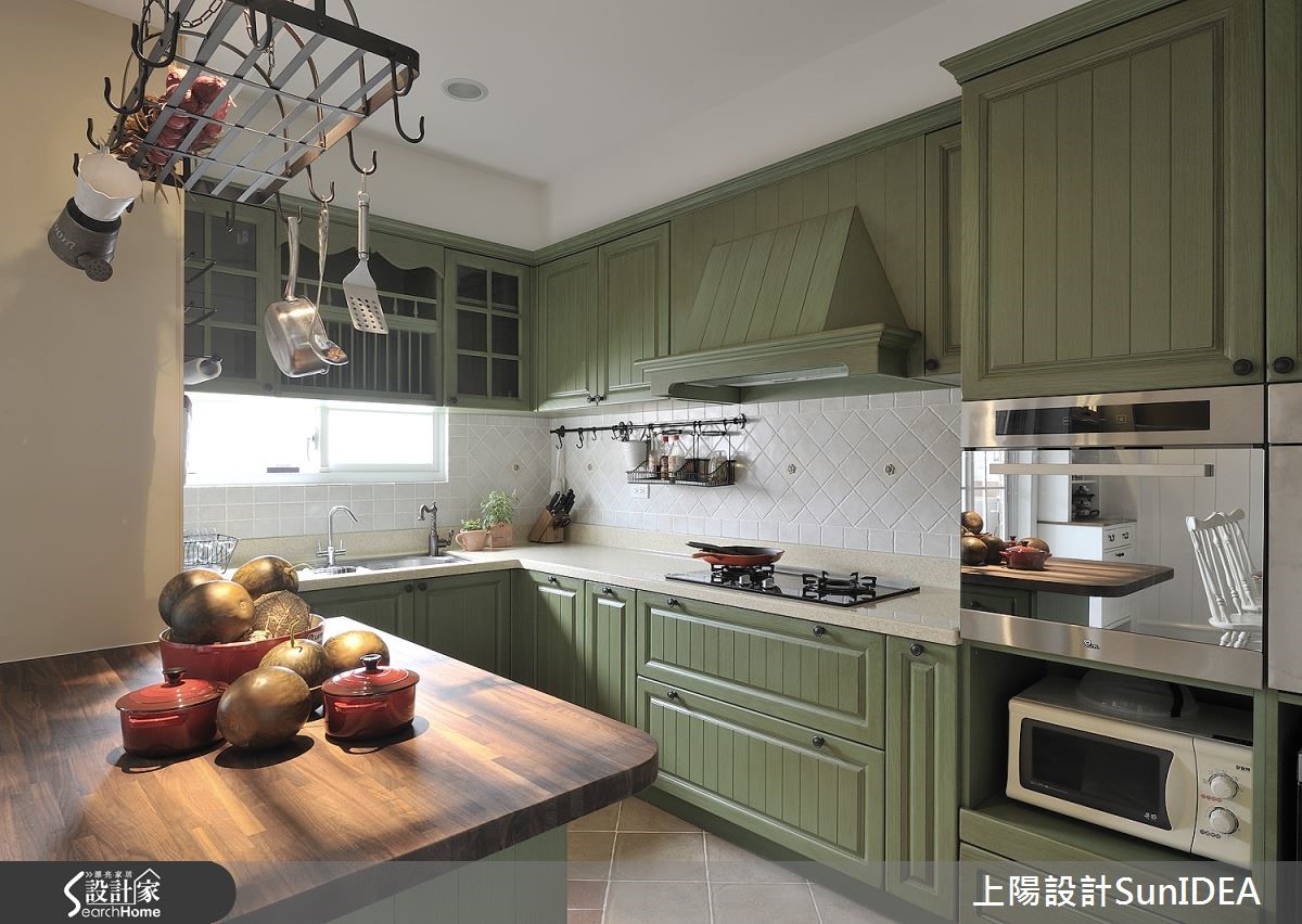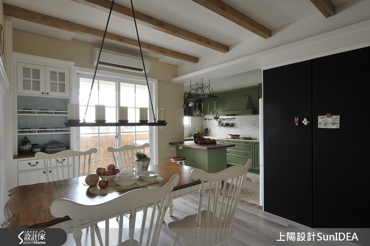 116平方米居宅,设计师于空间中加入乡村风格,并发挥色彩掌控力,注入缤纷色调,演出轻快宜人的居家氛围。【手感家具陈设,增添乡村气息】客厅电视墙以白色为底,融入展示收纳机能,铺排出简约的墙面表情,同时透过带有手感的家具陈设,增添乡村感质朴韵味;餐厅天花则加入木作条设计,营造多层次视感,一旁黑板墙不仅可作为备忘留言板,更身兼储藏室门片,不着痕迹地将机能隐于立面。【墙纸与木百叶,谱出自然格调】厨房以整片浓郁饱满的橄榄绿为主调,同时纳进阳台的充沛采光,使空间盈满活力和元气;居室透过墙纸注入休闲感,并配置木百叶窗筛落光影,谱出自然生动的格调!阳台采用茶色复古砖、自然石材等营造质朴感,并搭配植栽与日光妆点,创造现代生活中的清新感受!