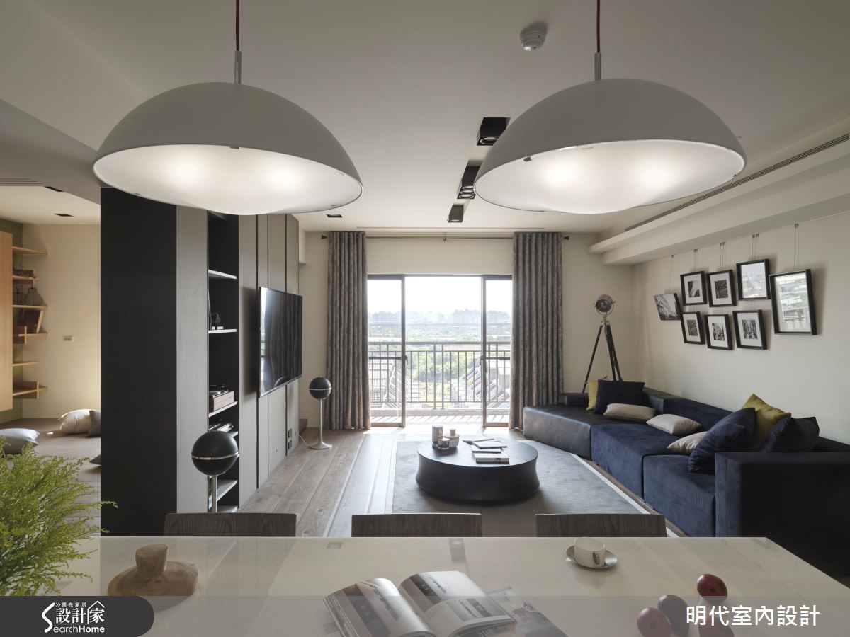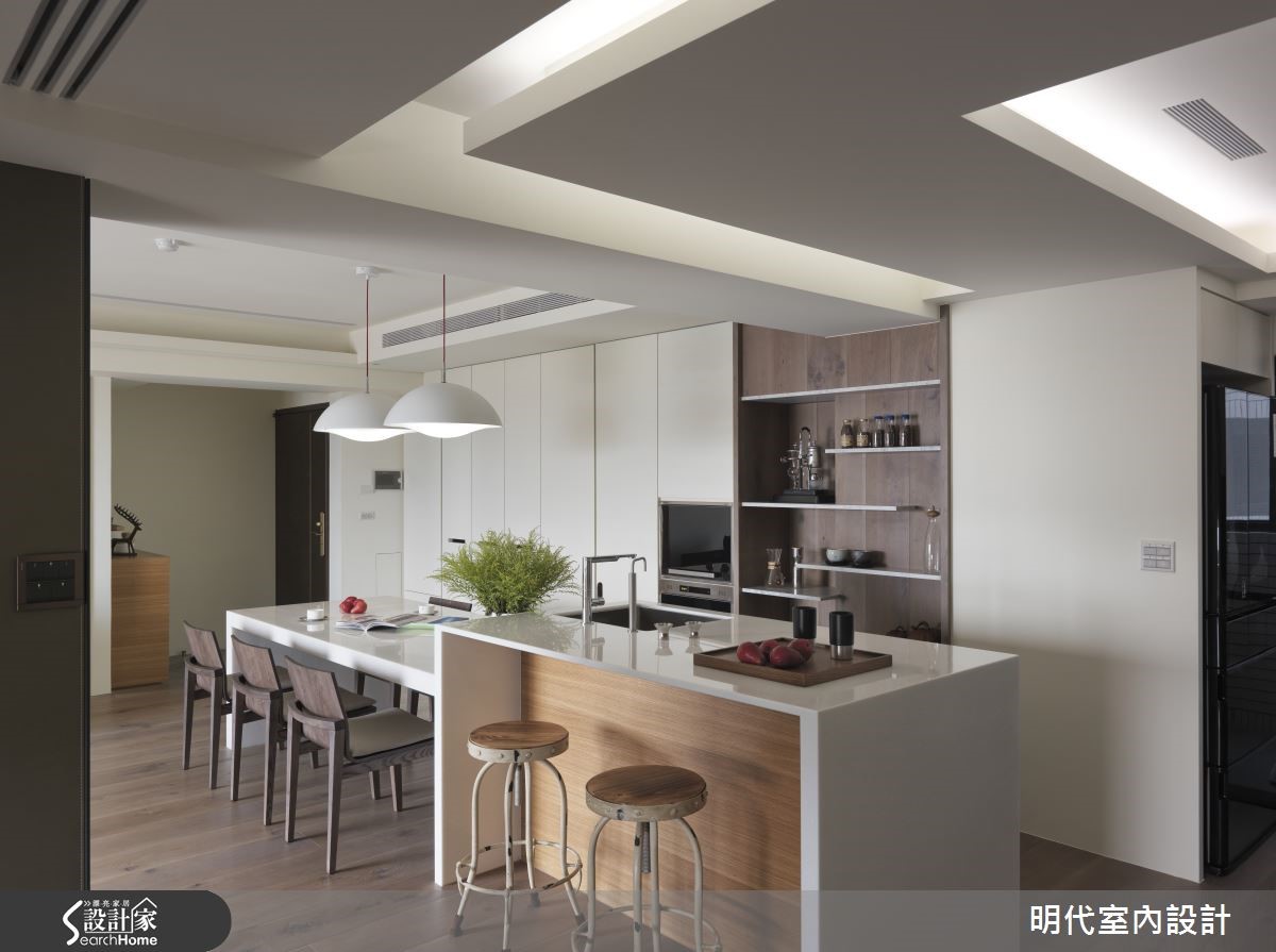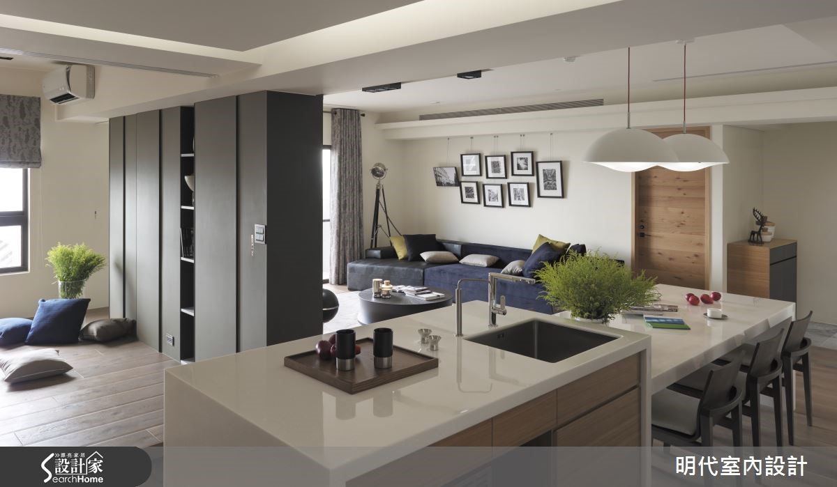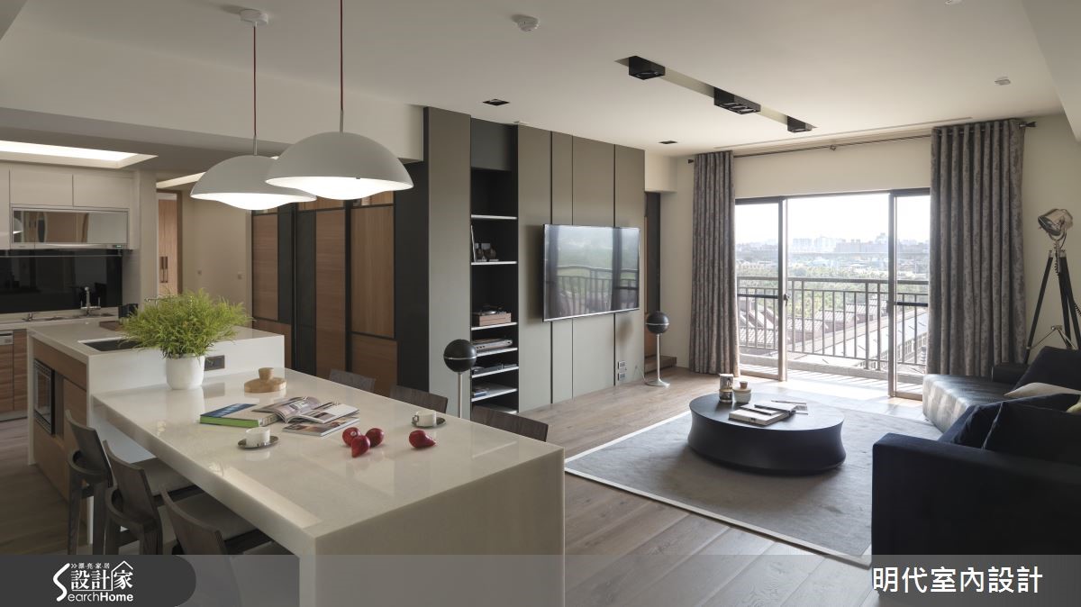 142平方米空间在设计师的规画之下,融入游戏场概念,注入通透流畅的动线,让居者可在房子之中自由穿梭与移动,同时加入材质、色彩的合宜运用,让家展现让人着迷的气度。【流场开放的层次生活感】公领域整体挹注流畅动线,形成场域彼此互通的生活型态,于客厅电视墙铺述墨绿色皮革,让墙面结合天花横梁,弱化压迫的视觉感,并纳入位处高楼的美好采光,天花则做出富有层次的高低变化,结合间接灯带、吸顶灯等,将隔断线条修饰得更为利落。飘窗区则采用弹性规划,配置隐藏门片,让飘窗可隐蔽或开放,兼具寝卧、书房、休憩等功能,同时保留与其他场域之间的串联过道,达成共享采光与自由动线;餐厅则将吧台结合餐桌,并将机能设备收整于墙,采用橡木材质为背景嵌合大理石层板,让空间显得纯净利落!