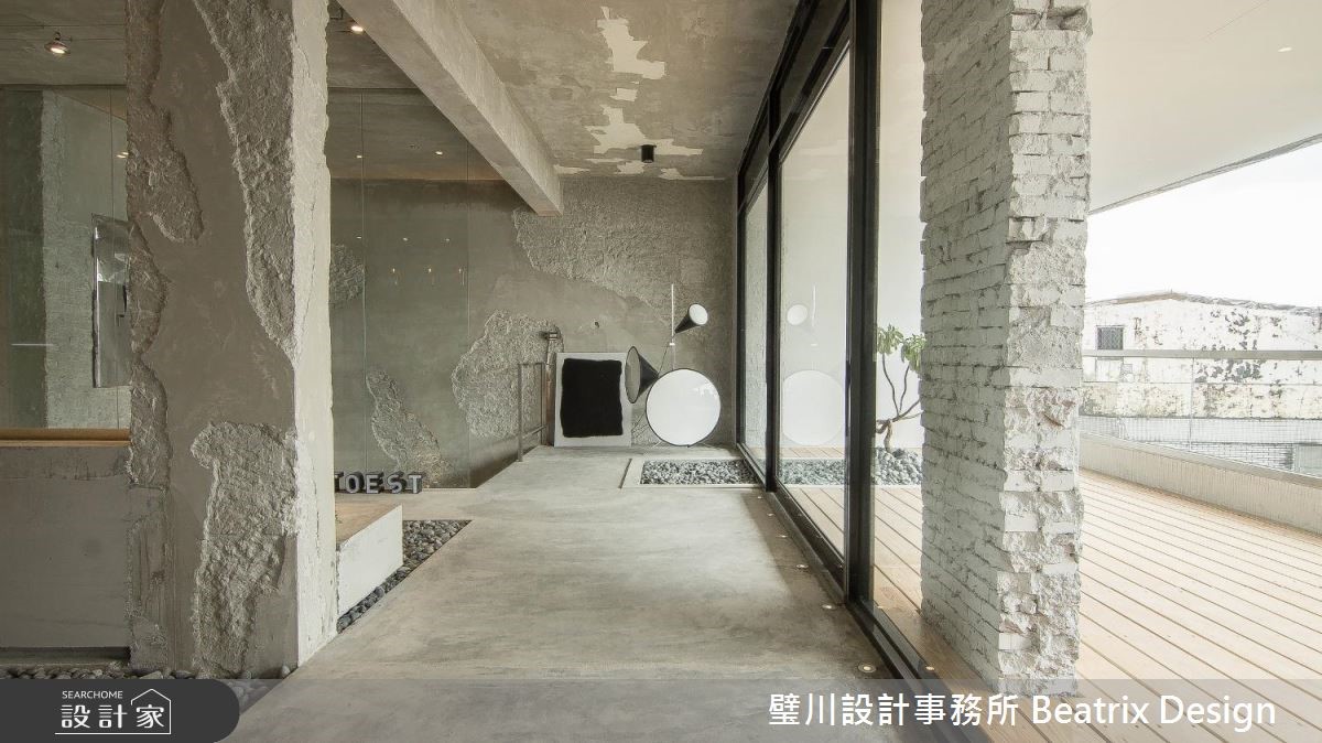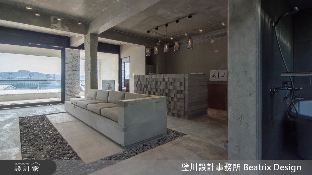拥有绝佳景观83平米居宅,坐落于半山间并正临台湾北部基隆港,设计师解开格局的拘束,开放式空间中铺饰水泥原色,作为质朴底衬,并以大面积开窗让自然山光水色映透室内,成为屋主家中自傲的绝色焦点。 【180度港湾景色近在眼前】屋龄超过 20 年的老屋,屋主是一对从事金融业的顶客族夫妻,平时喜欢接触大自然,也相当重视生活与环境的连结,设计师将原有三居室格局拆除,迎来开阔的空间感,前阳台处以整面大开窗将基隆港景色以 180 度在眼前摊展,无论在何处都能享受疗愈自然景色。【水泥裸材质避开潮湿气候】避开山边潮湿及易有昆虫腐蚀木材的问题,台面和家具皆由水泥制作,包含橱柜、中岛吧台、沙发底座及边几等,并且刻意打掉表面批土,裸露砖痕,刻划粗犷自然的力度。【玻璃光景串联内外风情】藉由通透玻璃材质的铺陈,引入室外风景,也在室内点缀些许绿意与卵石,为每天生活开启与自然环境的对话,静静欣赏着窗外美景,连心都变得开阔了!