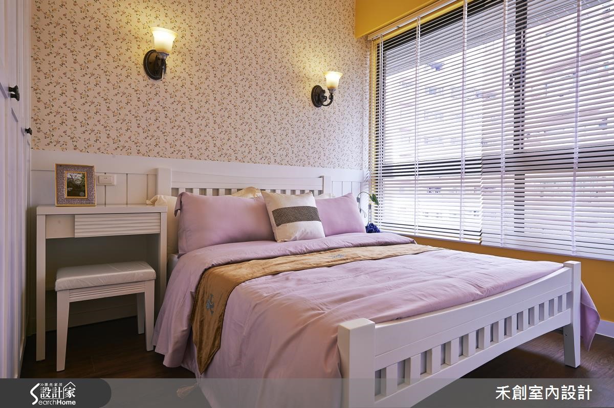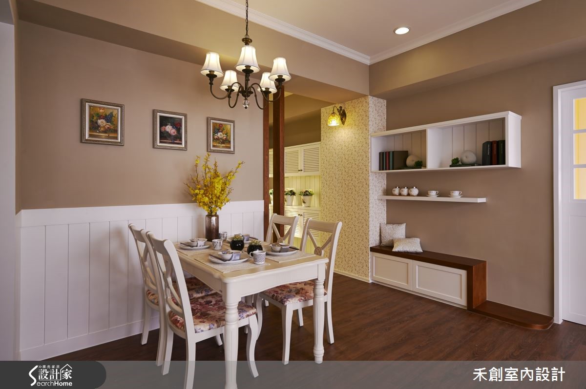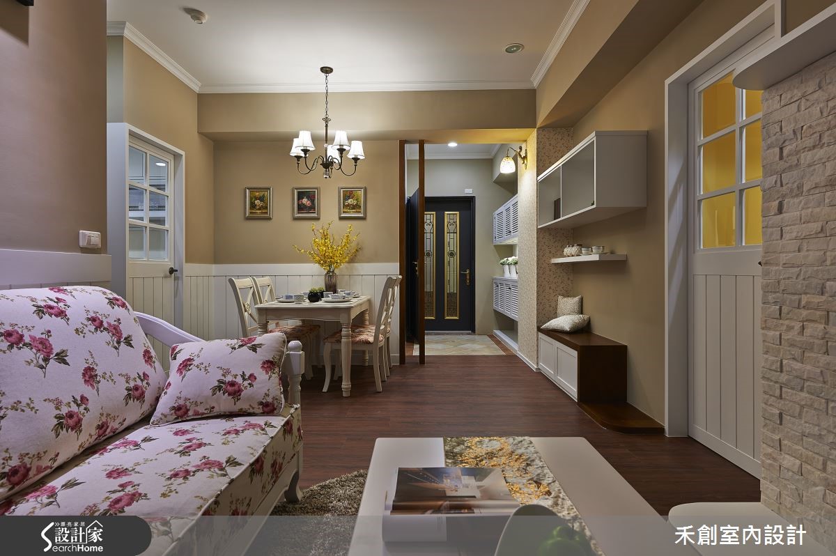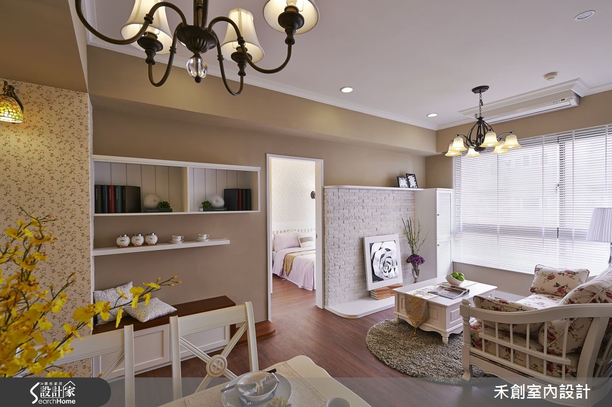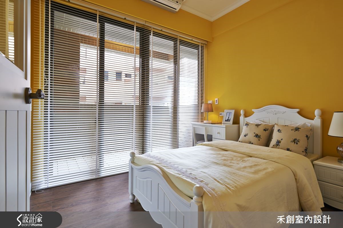 92平方米的居宅用温馨奶茶色营造暖感,同时加入文化石、格子门和百叶窗等设计,勾勒出带有美式风的电影场景,并搭配各式乡村元素与家具延伸,让整体风格更形强烈。【巧用白色衬托,暖色空间更明亮】客厅大面积采用暖色调,并加入白色腰带线板提升整体精致层次。电视墙以白色文化石打造,并保留上方展示空间,妆点家饰增添美感。一旁的百叶收纳柜,则兼具收纳及营造美式风格功效。餐厅旁的结构柱链接展示收纳柜,上方配置悬吊柜体,缓解尴尬的畸零角落,成为赏心悦目的墙面表情。选配线条柔美的餐桌椅,搭配吊灯开启餐区明亮感。卧房铺陈浓郁的鲜黄色型塑年轻气息,并透过整排落地窗纳进采光,揽进宽敞通透的户外视野。