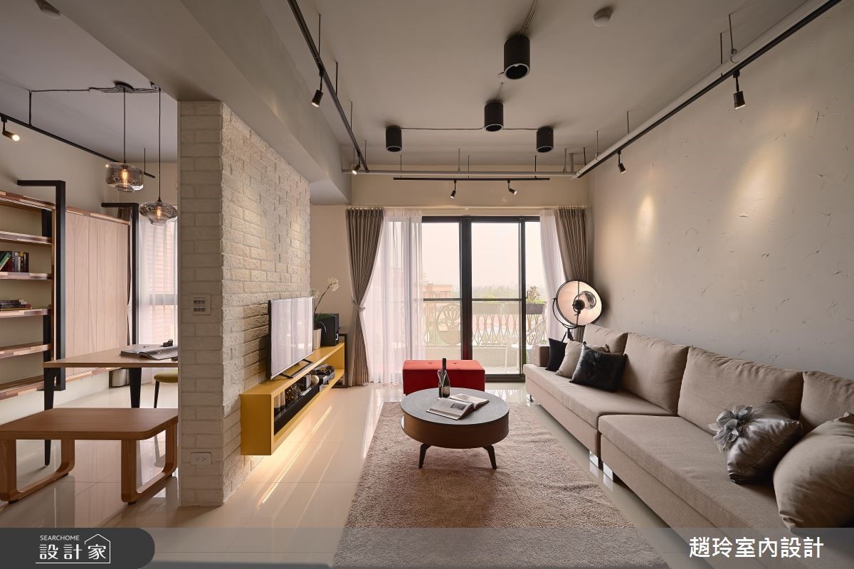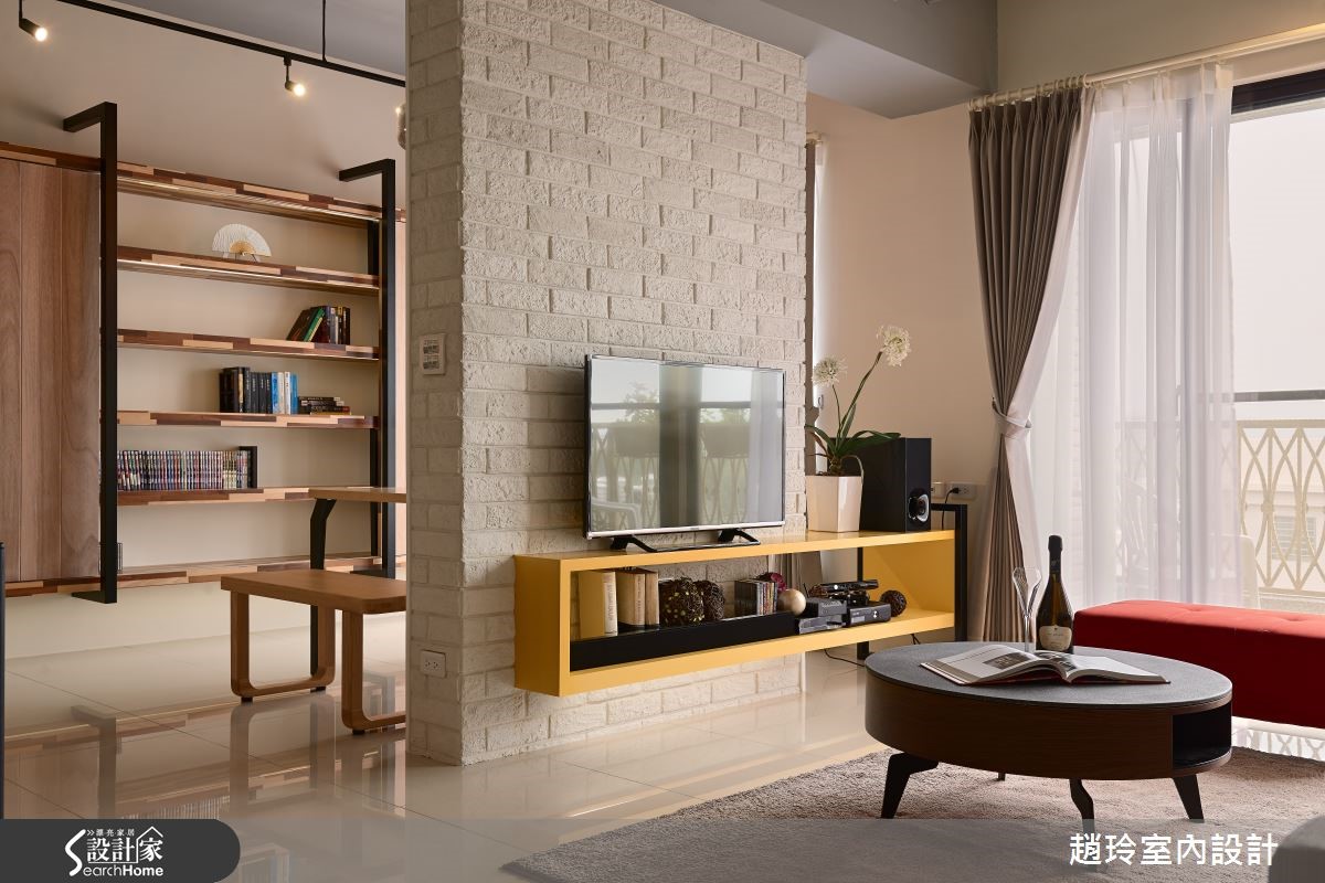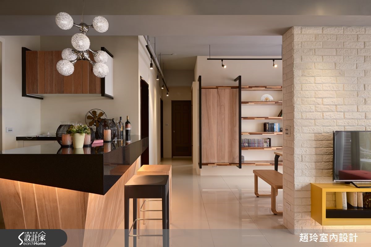 132平方米居宅,屋主为一对年轻夫妻,对于居家设计有着鲜明且独特的想法,于是设计师根据屋主需求跳脱一般配置,在格局与陈设上注入创新巧思,打造出专属两人的美好生活景况。【兼具实用收纳与美感的巧思设计】空间透过手感文化石墙界定客厅、餐厅场域,在墙面下方嵌合黄色柜体,挹注收纳机能,同时保有墙面的局部透空,形成居家中的流通视野,并配置落地窗引进采光景致,让户外室内有所串联,达成宽广延伸的空间感。餐厨吧台采用光亮材质结合木作,融合立体切割造型,与悬吊的科技感灯饰相得益彰,具实用与艺术感;餐厅兼具书房功能,在电视墙背向嵌入木作层板,可展示及置物,同时以木作、铁件规划整排展示书墙,挹注人文休闲感。