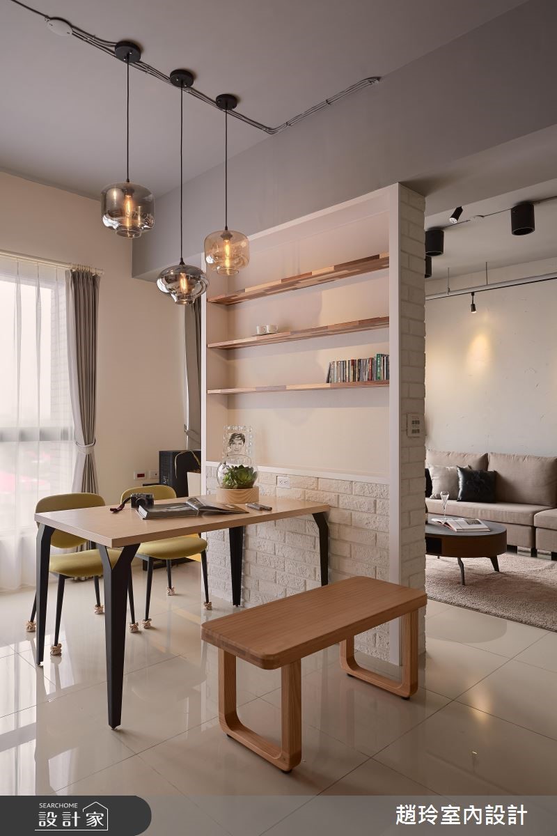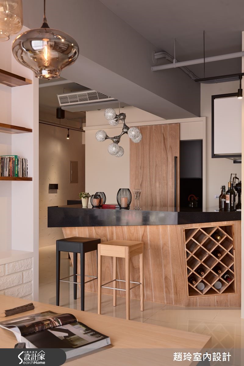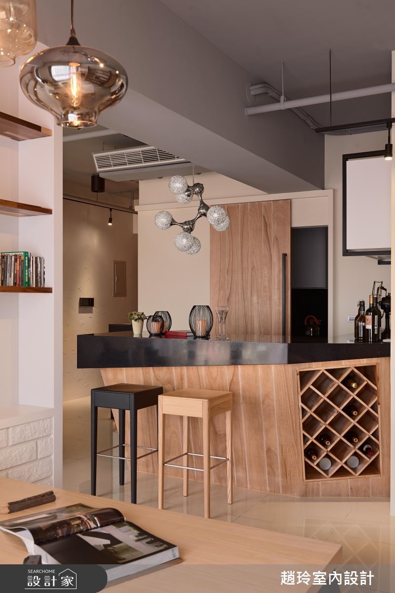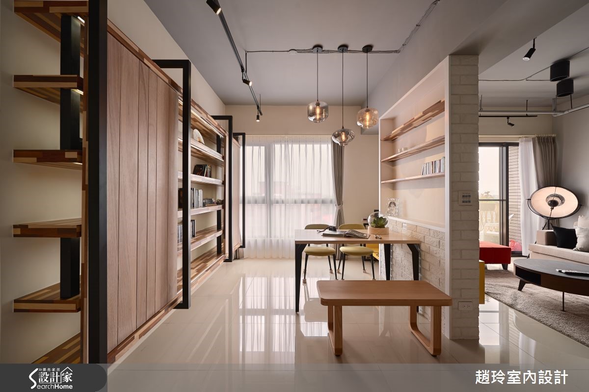 132平方米居宅,屋主为一对年轻夫妻,对于居家设计有着鲜明且独特的想法,于是设计师根据屋主需求跳脱一般配置,在格局与陈设上注入创新巧思,打造出专属两人的美好生活景况。【兼具实用收纳与美感的巧思设计】空间透过手感文化石墙界定客厅、餐厅场域,在墙面下方嵌合黄色柜体,挹注收纳机能,同时保有墙面的局部透空,形成居家中的流通视野,并配置落地窗引进采光景致,让户外室内有所串联,达成宽广延伸的空间感。餐厨吧台采用光亮材质结合木作,融合立体切割造型,与悬吊的科技感灯饰相得益彰,具实用与艺术感;餐厅兼具书房功能,在电视墙背向嵌入木作层板,可展示及置物,同时以木作、铁件规划整排展示书墙,挹注人文休闲感。