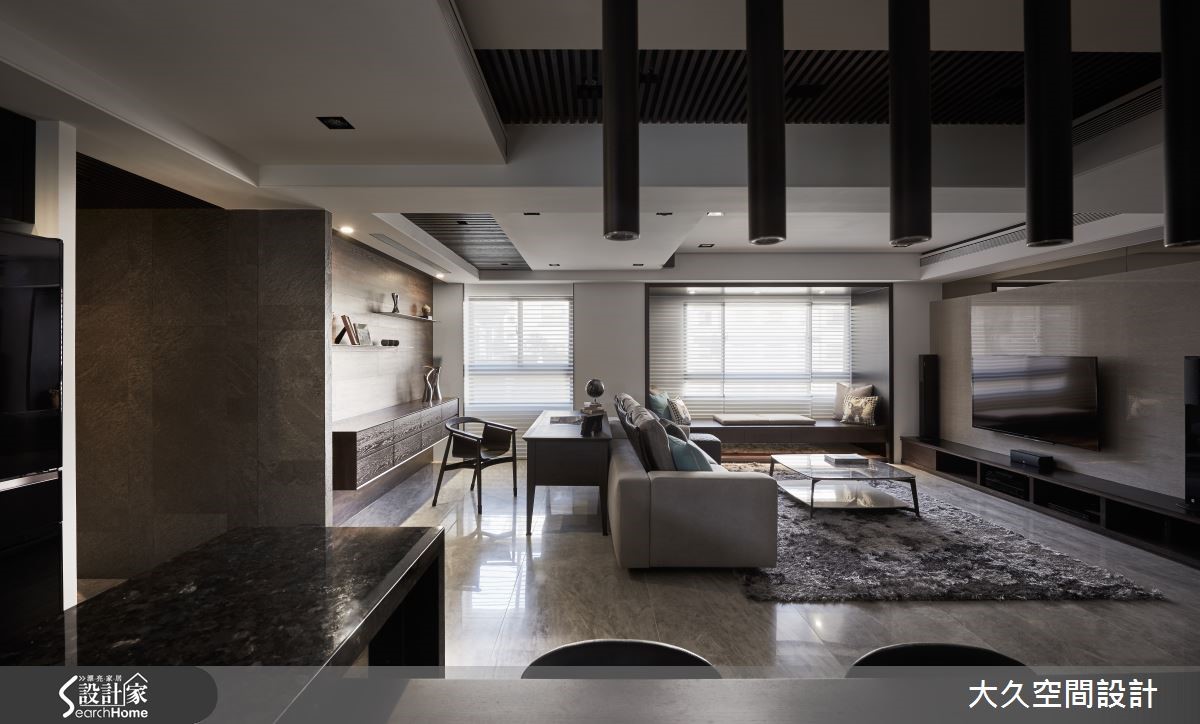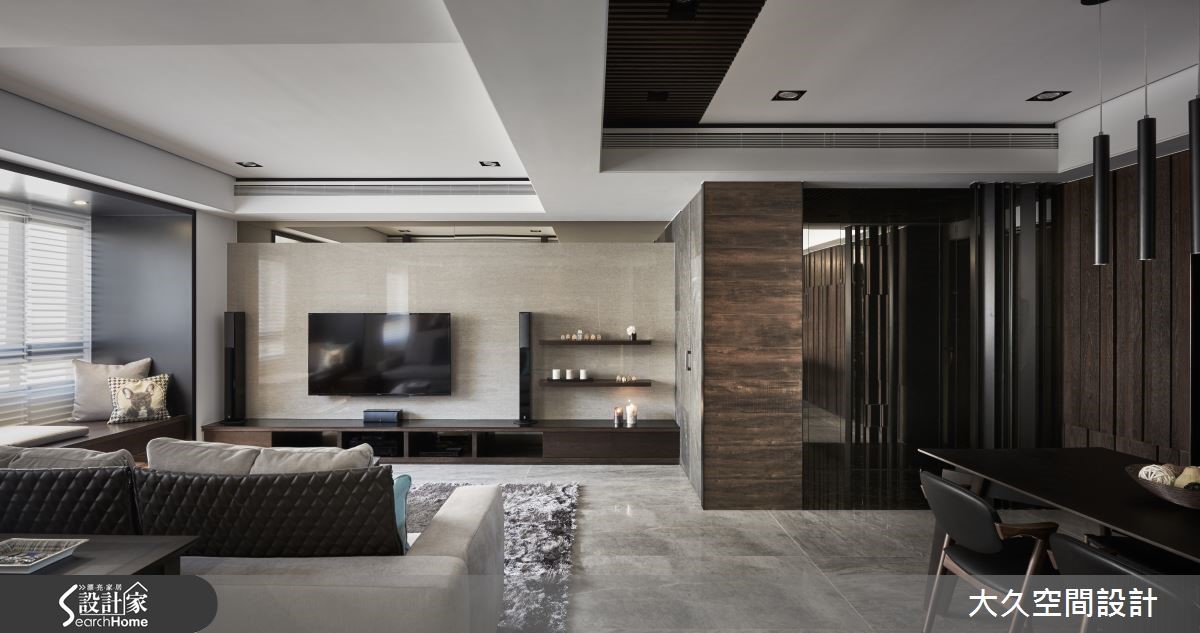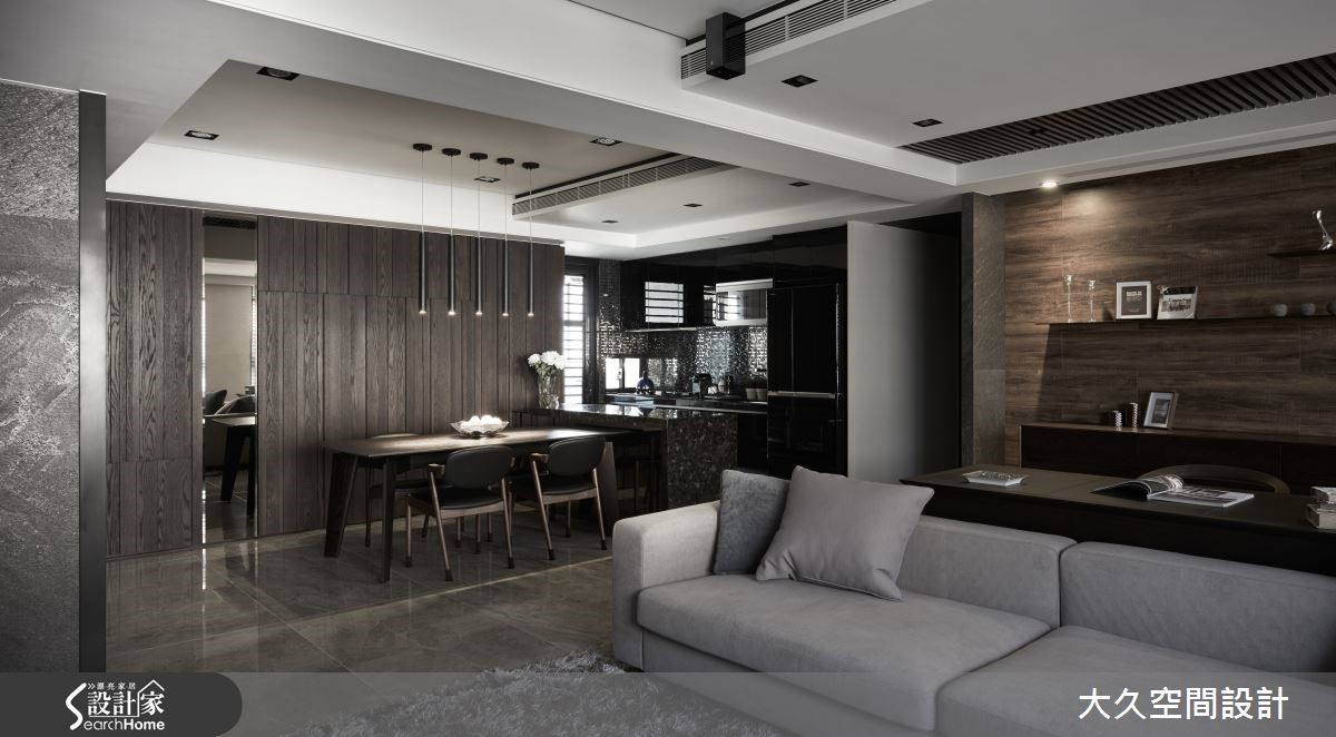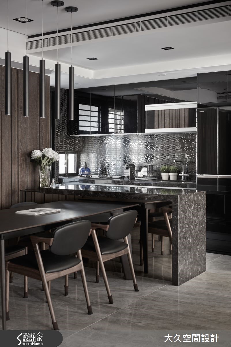 这间二手房以酒店风为设计概念,利用简约线条及石材打造沉静的氛围,将生活质感营造出如精品旅店般的生活场景。【金属马赛克砖,点亮餐厨氛围】在室内占有较大比例的公共领域,串连客厅、餐厨、书房等机能性,搭配沉静木质、石材的深色调,调制都会人文的舒适氛围。玄关、电视墙上方加入镜面材质,延伸空间深度,带有浅琥珀金属光泽的镜面更显生活精致度,地面则以石材的自然纹理,增添山水画般的笔触。 客厅旁利用梁柱下方延伸飘窗区,除了适合独处冥想外,有亲友来到家中时,也能作为临时座位区。开放式餐厨则采用黑色亮面材质与马赛克拼贴。另外,居家的实用性也不容忽视,设计师将收纳巧妙隐匿于设计中,利用材质的衬托让收纳空间不显突兀果。