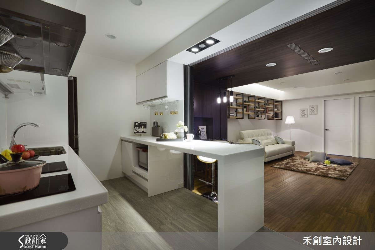 这间89平方米老屋进行彻底翻修,调动格局与动线后,破除空间狭长问题,同时导入现代风和微工业设计,创造出兼具时尚感与便利机能的居家空间。【悬吊柜及黑玻,减少压迫感】考虑到格局狭隘,为减缓空间压迫感,让柜体配置呈悬吊形式,并透过黑色烤玻材质给予时尚感,使柜体沿着电视墙形成延续铺排,展现黑白对比个性。沙发背墙则嵌上铁件、木作共构的悬吊展示架,赋予墙面的独特表情。餐厅区以深色木皮天花连结墙面渲染优雅,搭配黑板刷沟文化石墙、造型灯与木质家具点缀营造温馨氛围。清玻拉门做出餐厅、厨房的机能界定,且规划轻食区结合吧台,丰富生活机能。寝卧则在柜体铺陈朴质木皮并引入窗外采光,营造明亮纾压氛围。