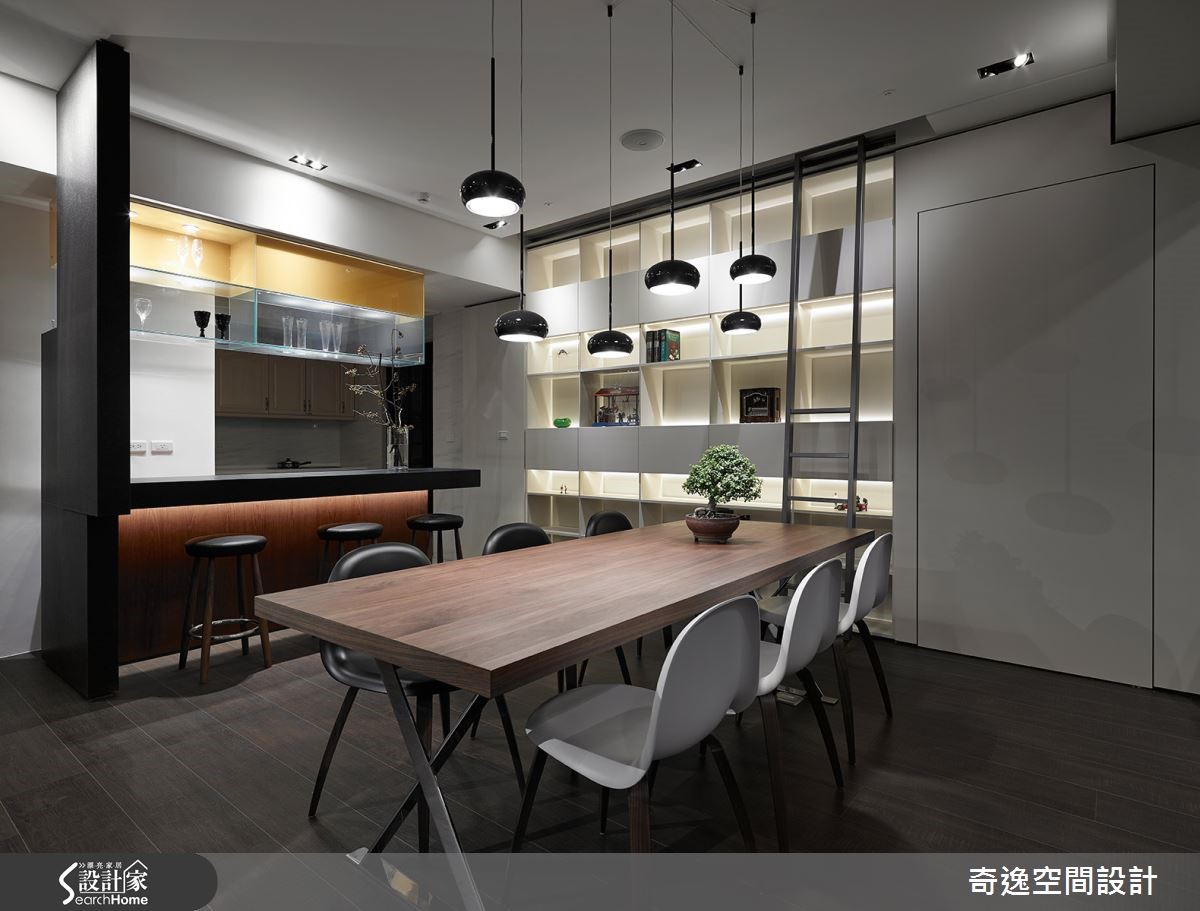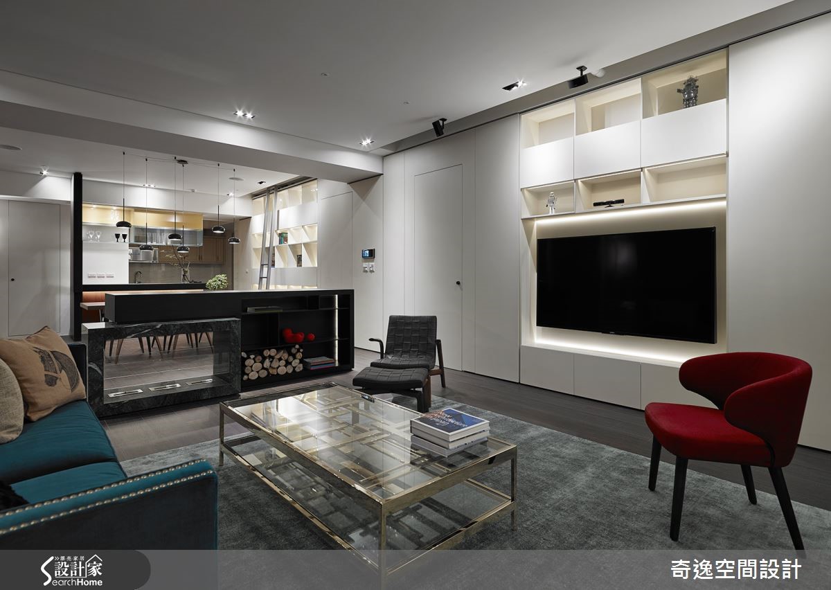 这户165平方米居宅,原先建商规划三室设计,使得公领域遭到严重压缩,采光、动线都不符合生活所需,于是设计师重整布局,将原先三室变更为五室,区隔出独立书房及透明琴房,打破视觉界限,使居宅别具时尚感。【重整布局,更符合生活需求】设计师将玄关至琴房路径规划为弧型动线,并配合玻璃推拉门结合玫瑰金喷漆金属镶边,做出时尚的穿透门片设计,藉此扩大空间视感;同时在客厅、餐厨之间规划仿壁炉隔墙,形成开放流通的视野,并让白色电视墙一路延伸,隐藏孝亲房及女儿房入口。透过简白立面扩大客厅的视觉范围,且规划格状展示空间,搭配高脚梯装饰,缓解柜体沉重感,形成轻盈带文艺感的墙面表情;一旁则配置轻食吧台,并为了避免造成压迫感,在吧台上方采用玻璃层板展示兼收纳,让柜体也兼具视觉穿透感!