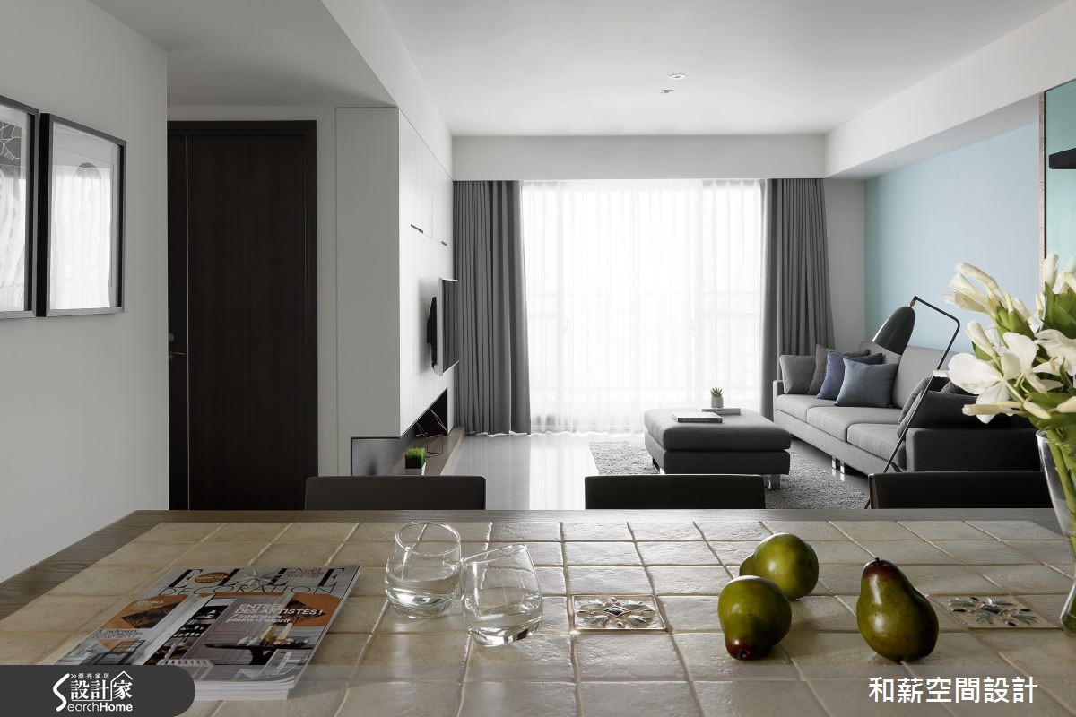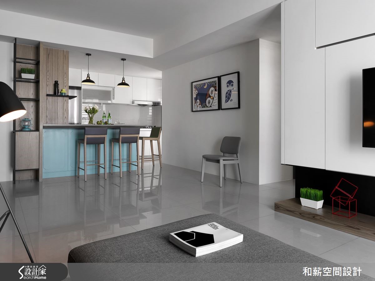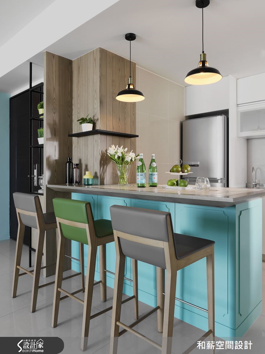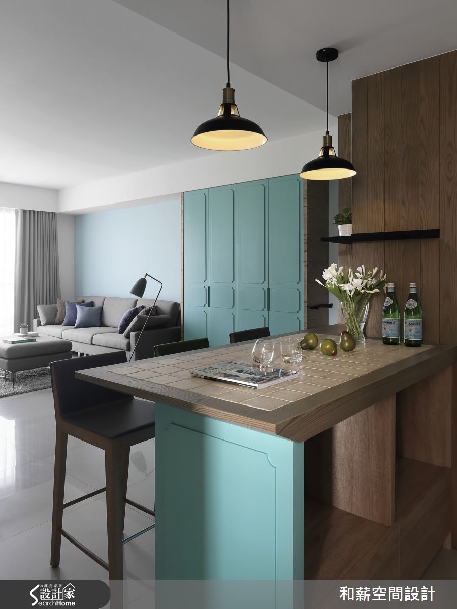 将局部立面柜体作为家中视觉主角,是一件看似挑战十足的任务。设计师将位于居家入口的大面积鞋柜,透过简约优雅的线板设计并注入蓝绿色调,成为居家特色的一大焦点!【灰白底色衬托,空间更清新】蒂芙尼蓝的唯美色调成为居家空间的主角,正满足了女屋主的少女心愿望。整体以灰白简约色调为主轴的客厅,利用不规则切分设计,让纯白电视主墙兼具收纳功能,并提升视觉立体度。而蓝绿沙发背墙则充满淡雅清新的气息,成为和谐对比,空间氛围衬托得更为娇嫩。设计师打通餐厨,将中岛吧台视为多功能餐桌,佐以蓝绿色线板与复古陶砖,呼应女主人的乡村梦与吧台想望,更为公领域增添宽敞利用空间。书房木作层架的交错设计,让整体视觉更具层次感,长桌一分为二的阅读区块,同时保留了互动与独立兼具的可能性。