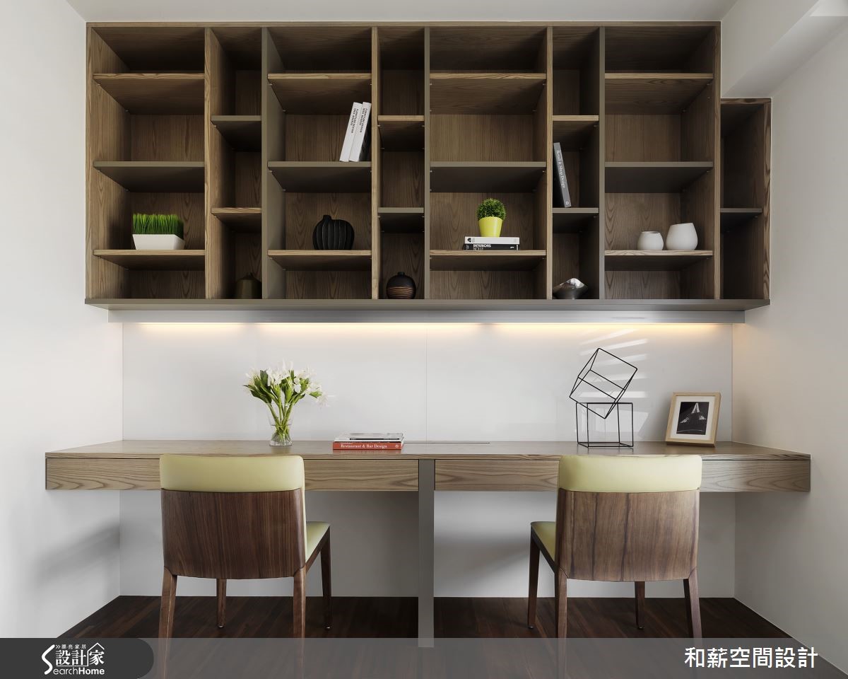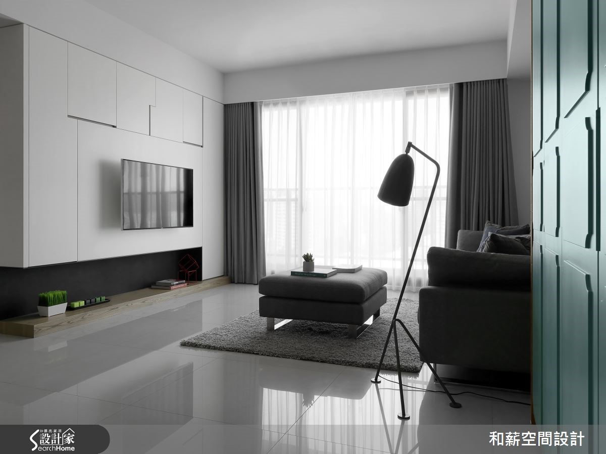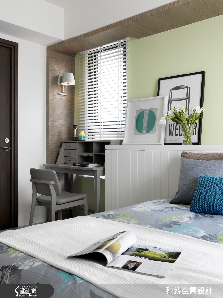 将局部立面柜体作为家中视觉主角,是一件看似挑战十足的任务。设计师将位于居家入口的大面积鞋柜,透过简约优雅的线板设计并注入蓝绿色调,成为居家特色的一大焦点!【灰白底色衬托,空间更清新】蒂芙尼蓝的唯美色调成为居家空间的主角,正满足了女屋主的少女心愿望。整体以灰白简约色调为主轴的客厅,利用不规则切分设计,让纯白电视主墙兼具收纳功能,并提升视觉立体度。而蓝绿沙发背墙则充满淡雅清新的气息,成为和谐对比,空间氛围衬托得更为娇嫩。设计师打通餐厨,将中岛吧台视为多功能餐桌,佐以蓝绿色线板与复古陶砖,呼应女主人的乡村梦与吧台想望,更为公领域增添宽敞利用空间。书房木作层架的交错设计,让整体视觉更具层次感,长桌一分为二的阅读区块,同时保留了互动与独立兼具的可能性。