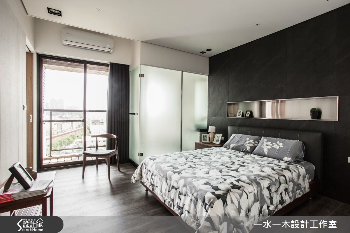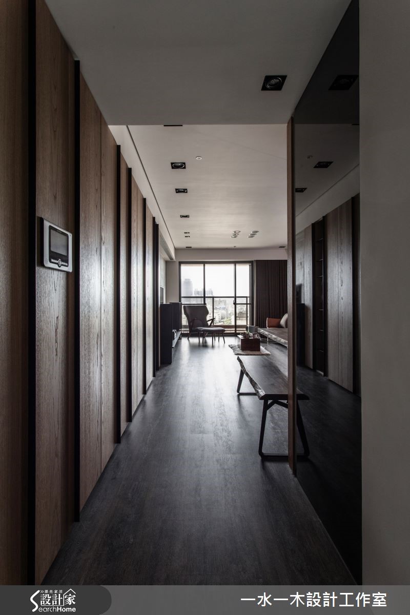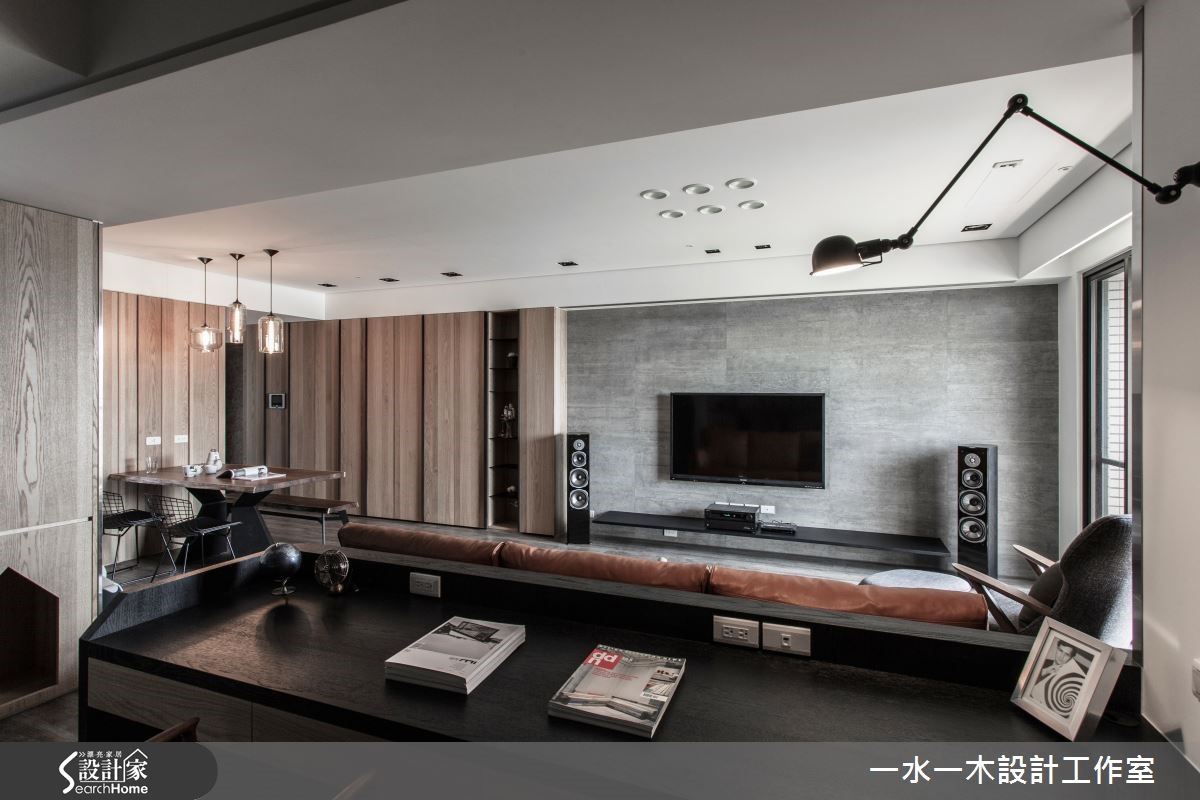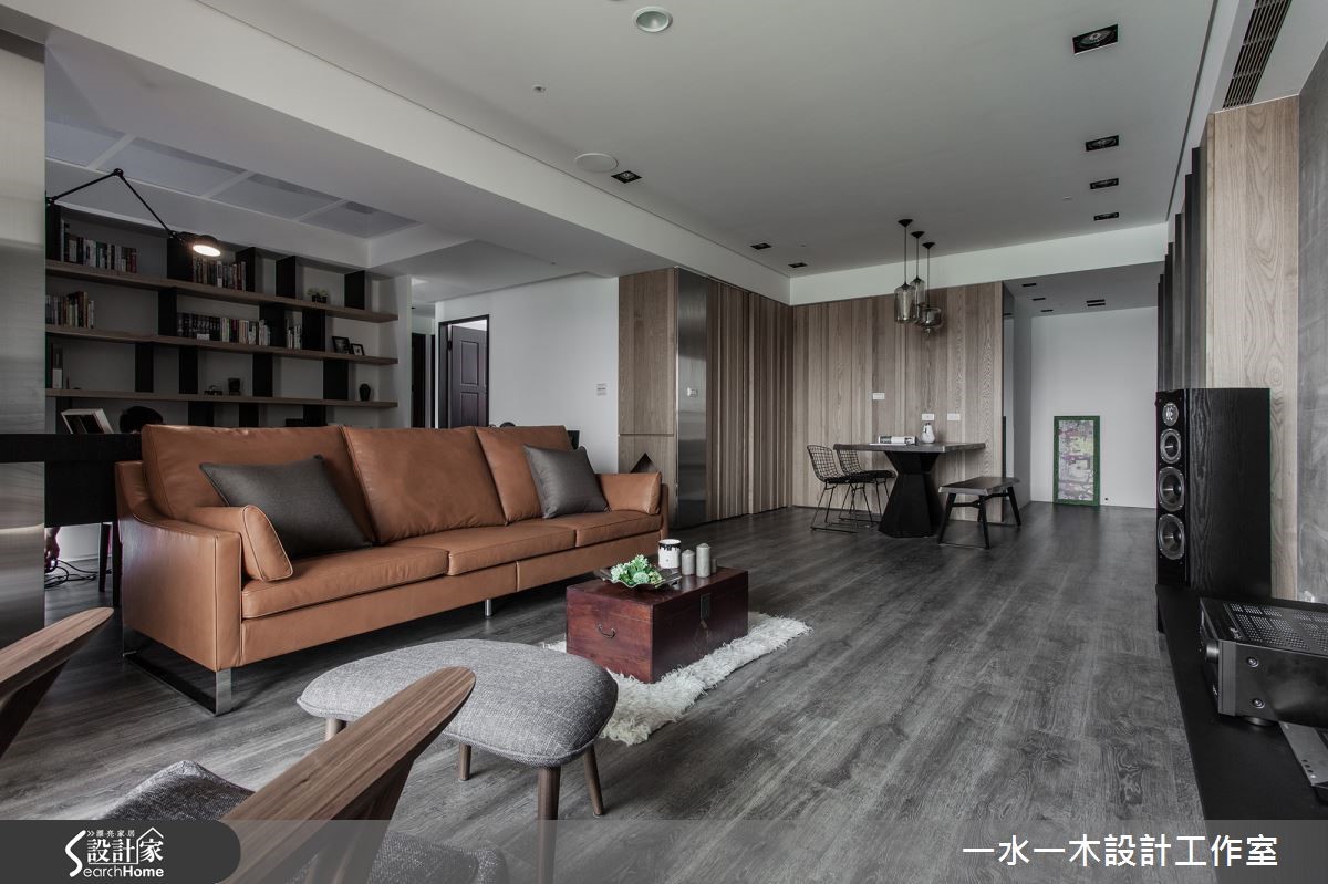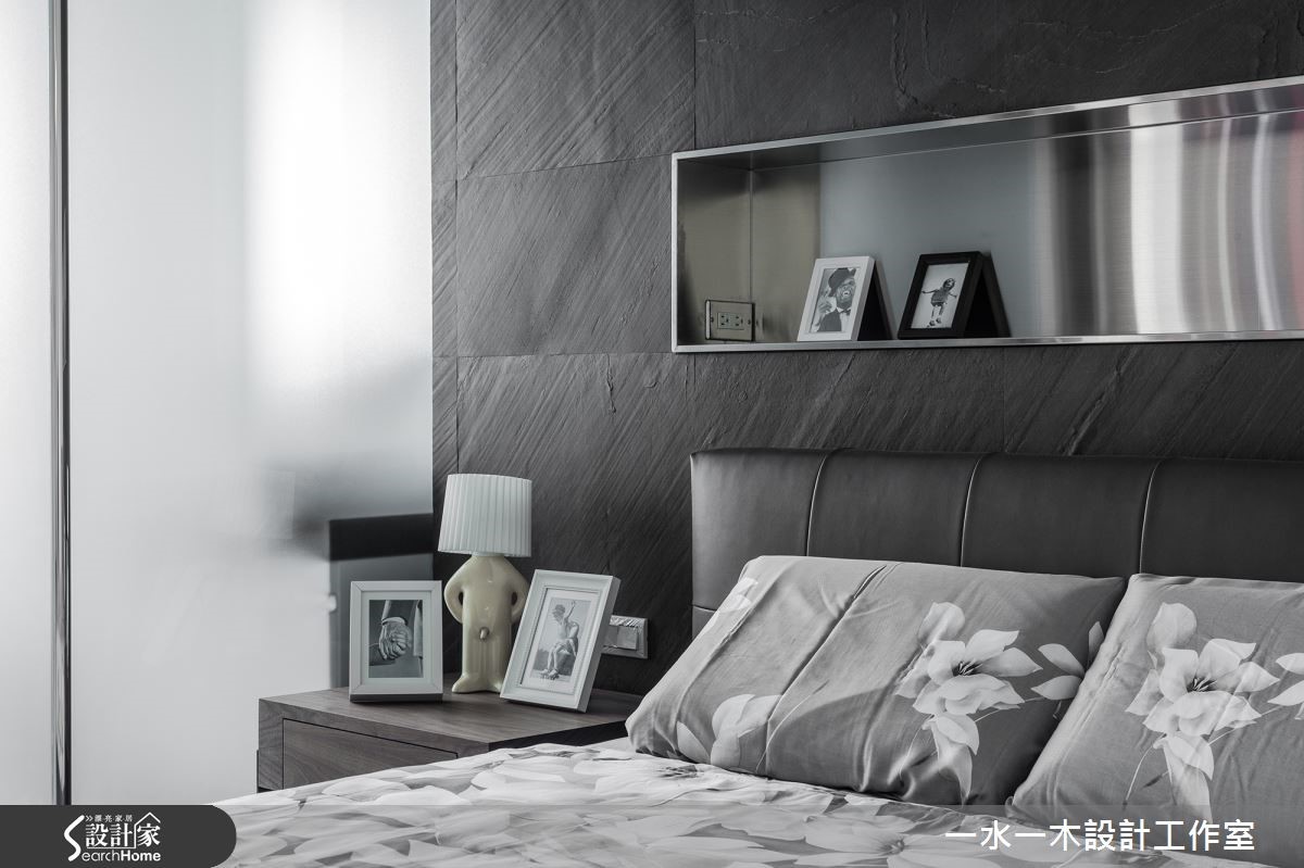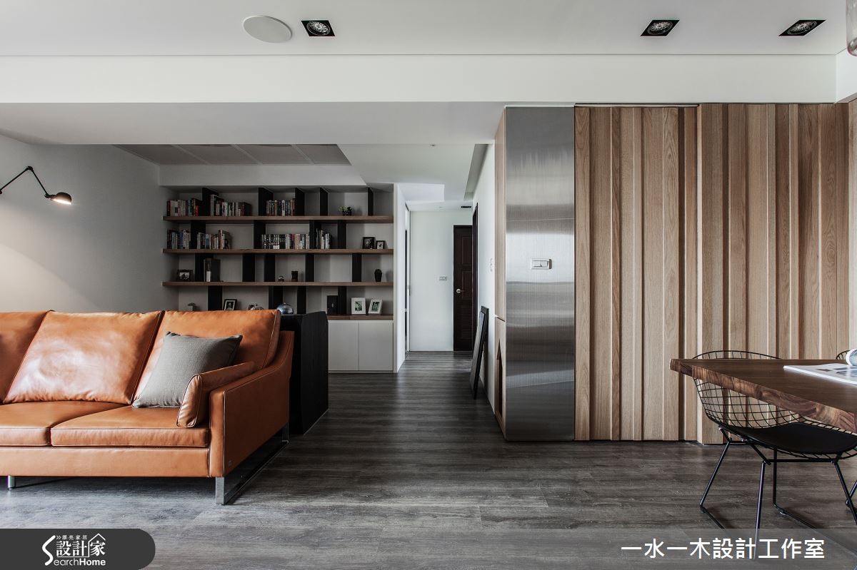 一冷一暖之间如何达到平衡?是设计师透过舒适温馨的元素加上冷调气息,让空间达到交错的特殊穿透性,迸出另类的宽阔感,使整体居家画面和谐大器。材质间的搭配与选择则充满个性与品味,打造优雅人文宅 。 【大地色融合金属质感,创造对比】设计师将原有瓷砖全数敲除,改为富有天然纹理的木地板,奠定温润基础。而玄关与餐厅接壤,沿墙规划造型柜体,柜面运用立体造型配合不锈钢壁面,产生鲜明对比。餐厅则搭配实木桌椅,呈现浓厚的暖调木质氛围。客厅后方增设书房,体现毫无阻隔的穿透美学,由此提升一家人在公领域的互动度。设计师更适度包覆天花,除了为居家景象营造层次感外,更解决梁柱过多问题。主卧以板岩质感壁面作为床头墙造型,中间的金属挖空设计降低沉重感,提升时尚气息。一旁以雾面玻璃隔出的卫浴空间则经过设计师大幅改造、贴砖,呈现精巧的外观。