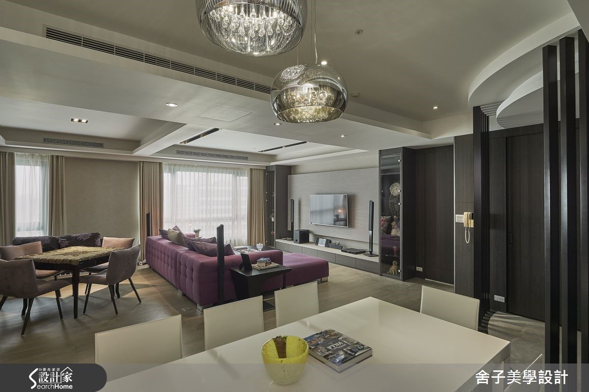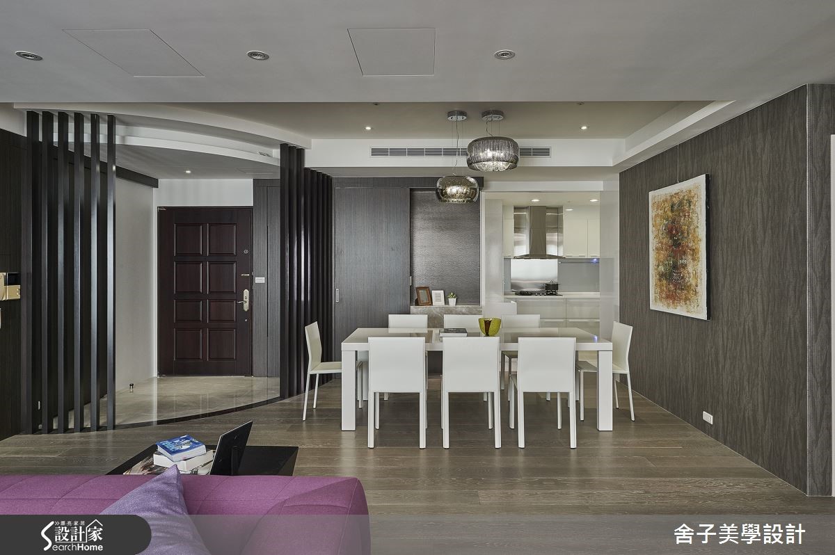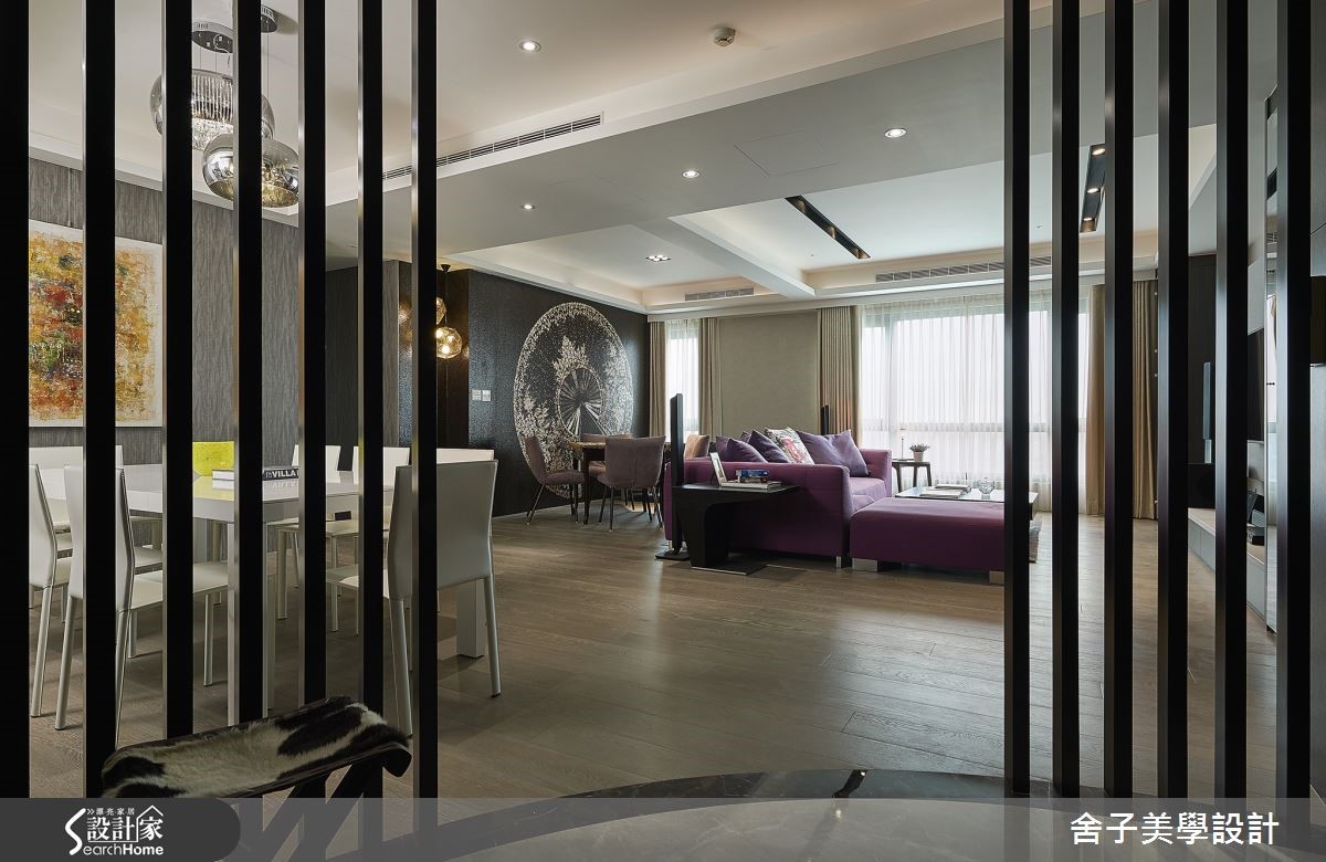 玄关以圆弧线板与金属格栅作为内外空间的缓冲,客厅采用开放设计,并在沙发背墙妆点雕饰与大型挂画,为整体视觉注入精致的艺术感,鲜亮对比吸人眼球,同时大量的间接照明更让整体空间呈现温馨的氛围。