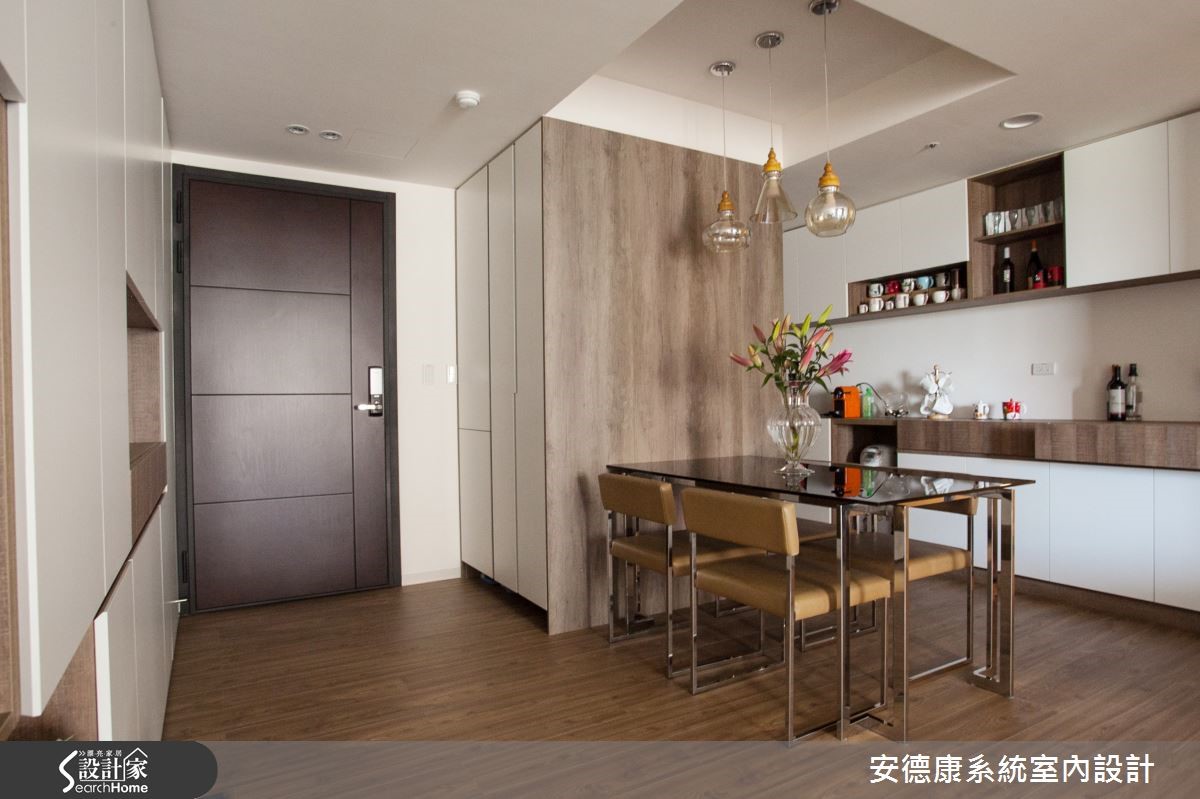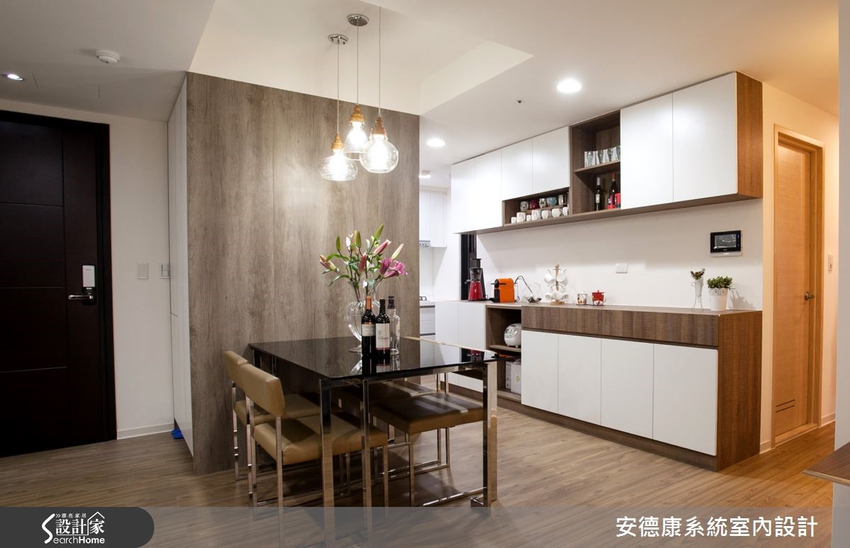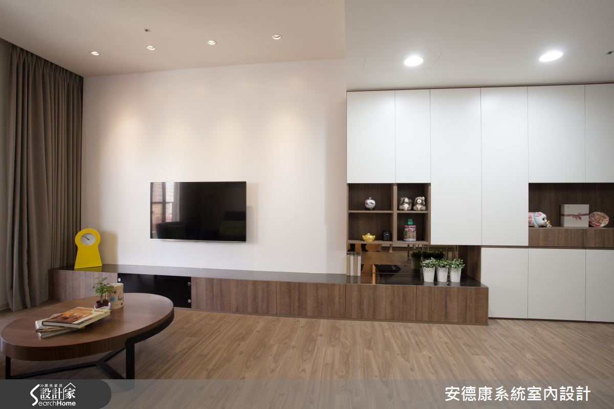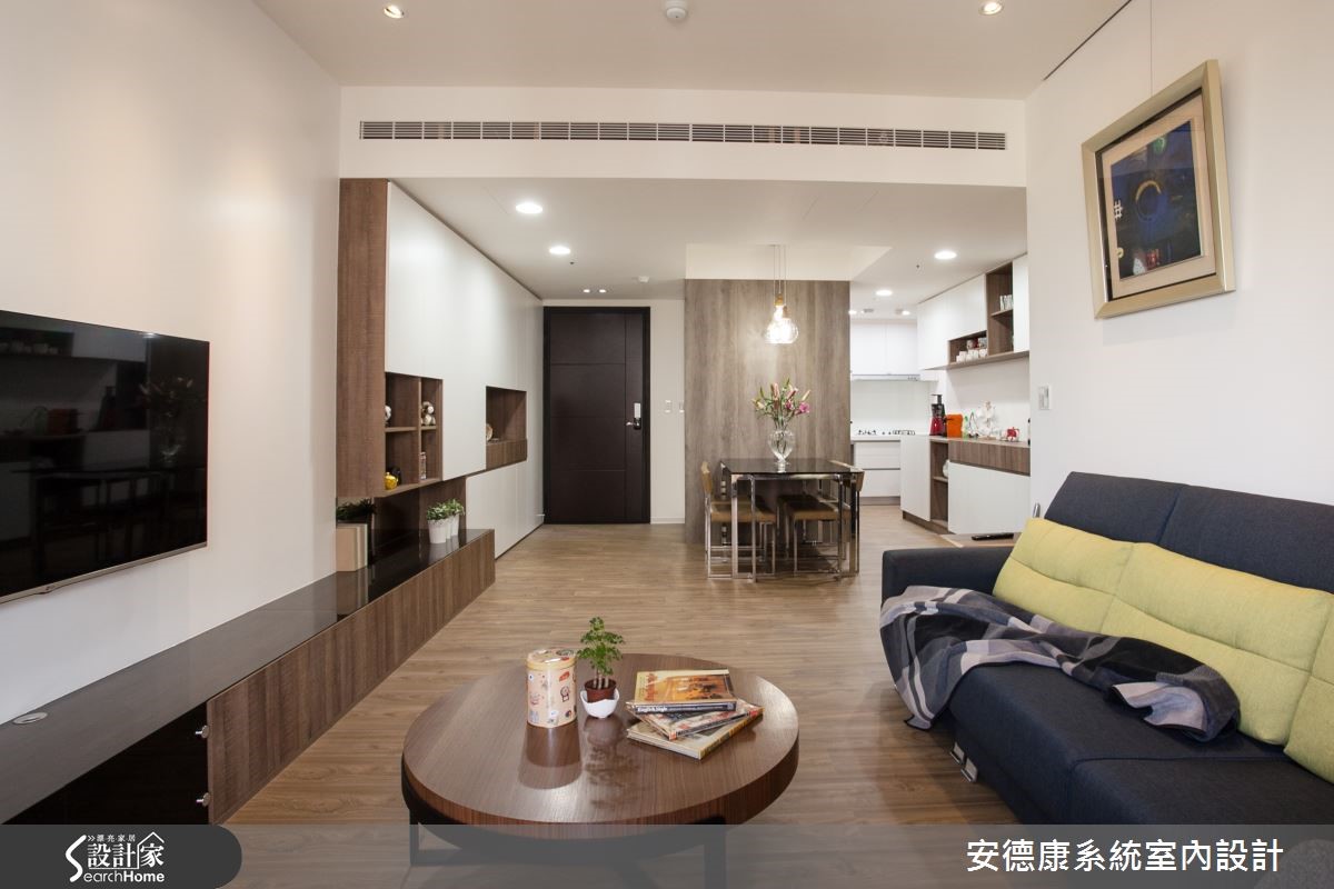 以舒适的纯白与木色作为空间的底衬,换得一室无压清爽。这间93平方米的屋主偏爱简约现代的清爽调性,希望下班回到家便能将繁忙的工作压力抛诸脑后,与家人一起享受温馨生活。 【善用天花造型,明确切分各领域】原本室内洒水头和大梁贯穿,让天花看起来相当有压迫感。设计师在大梁旁利用吊隐式空调所需的主机位置,妥善地将不同领域区分,也提高了天花高度,在视觉上带来放大效果。客厅电视墙选用白色烤漆,除了展现光泽和质感,清洁及保养上也比较容易,。屋主也相当在意的收纳空间,则在玄关、客厅及餐厨区以系统柜做规划,选色搭配原有的超耐磨地板,选择深棕色柜体及白色门板,局部柜体嵌入茶镜,以镜面的反射效果延伸空间感。